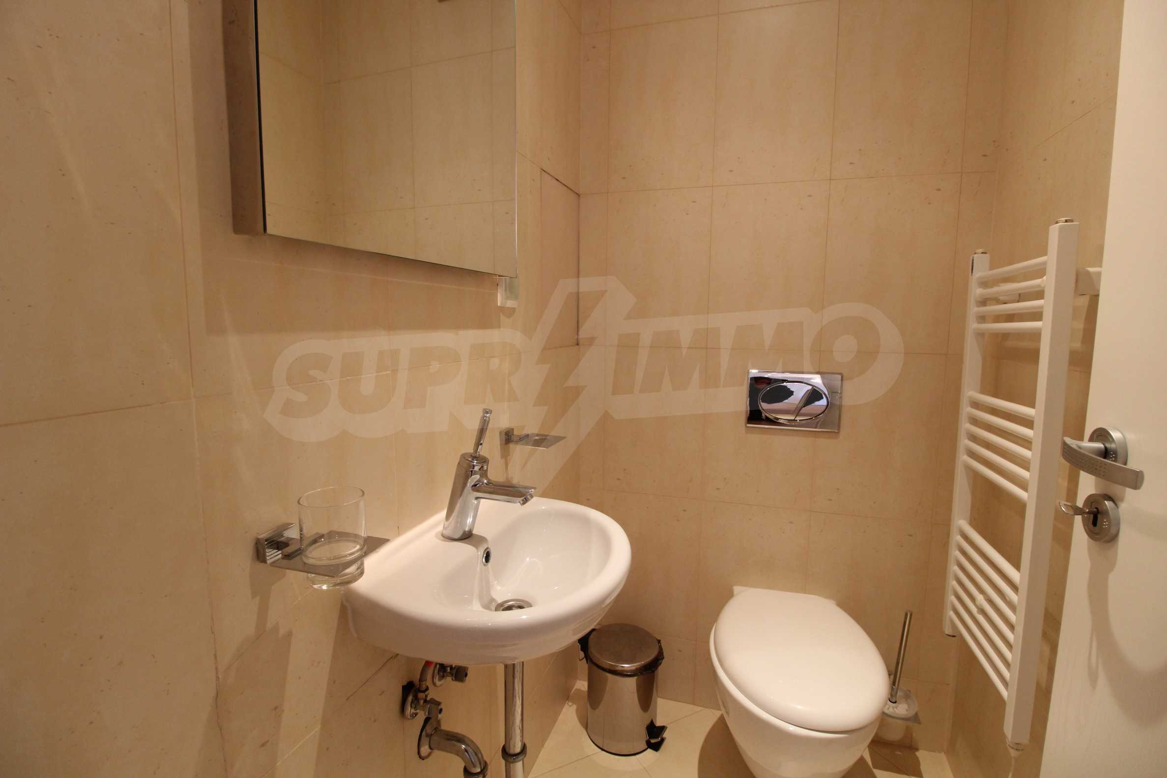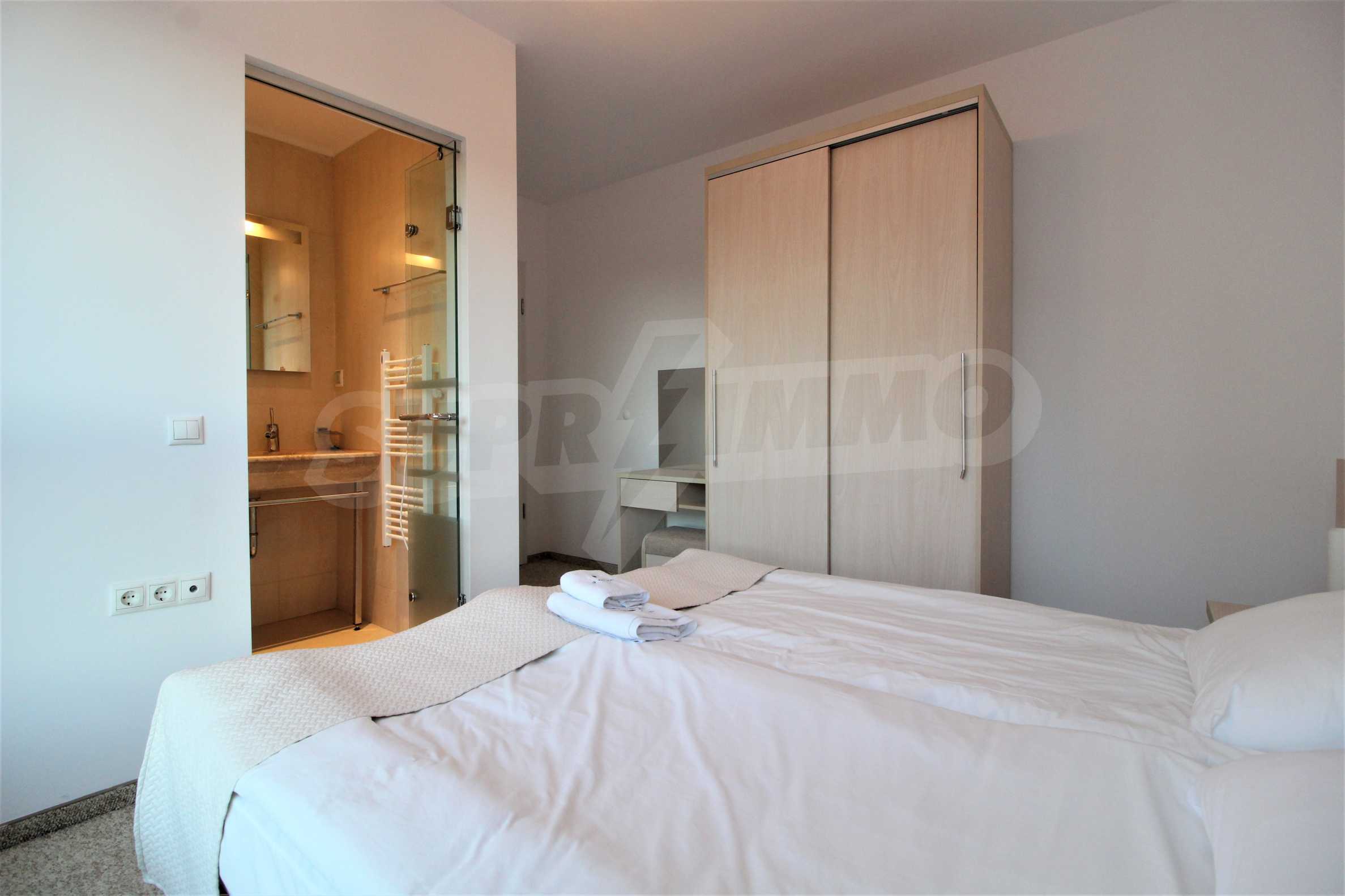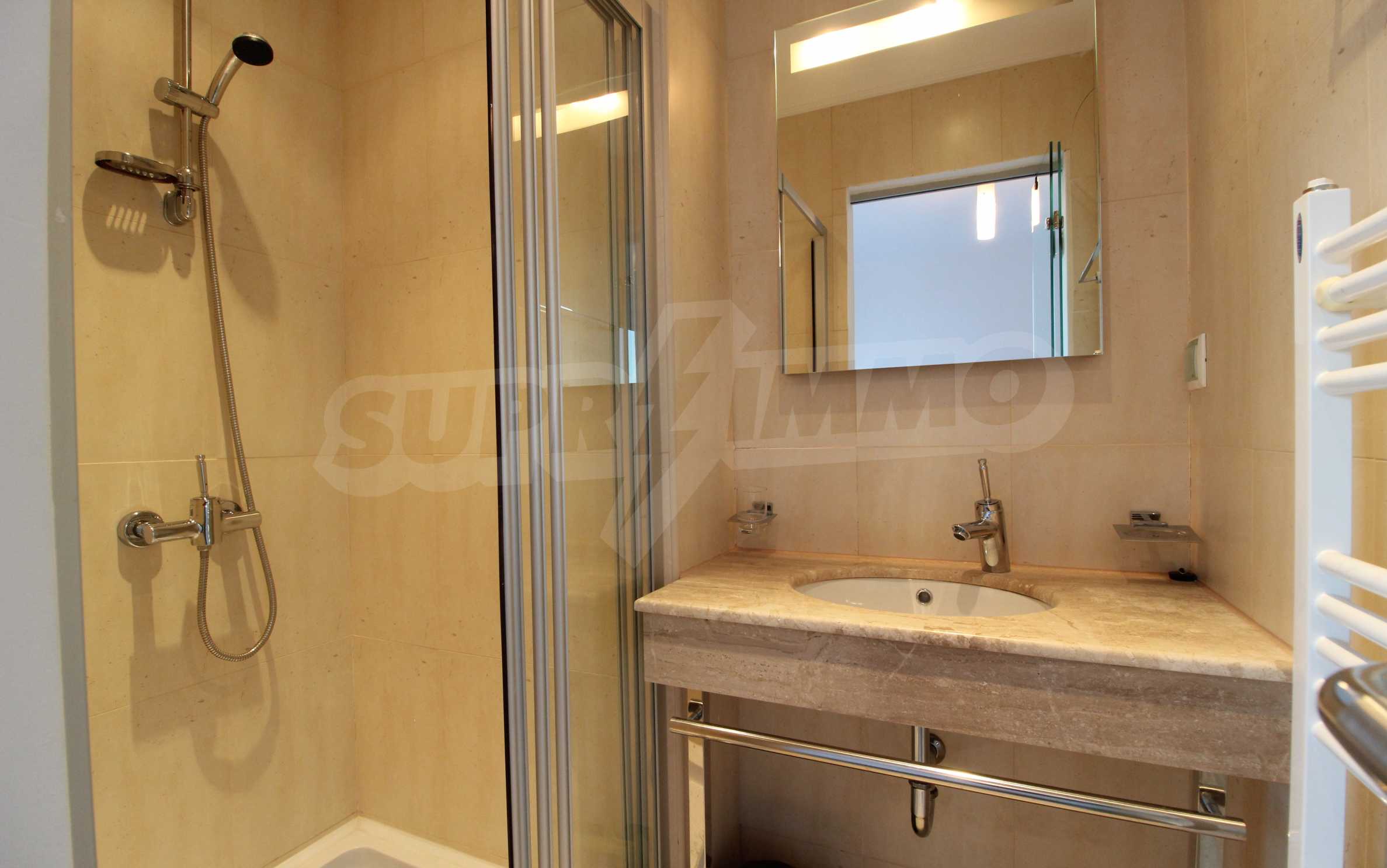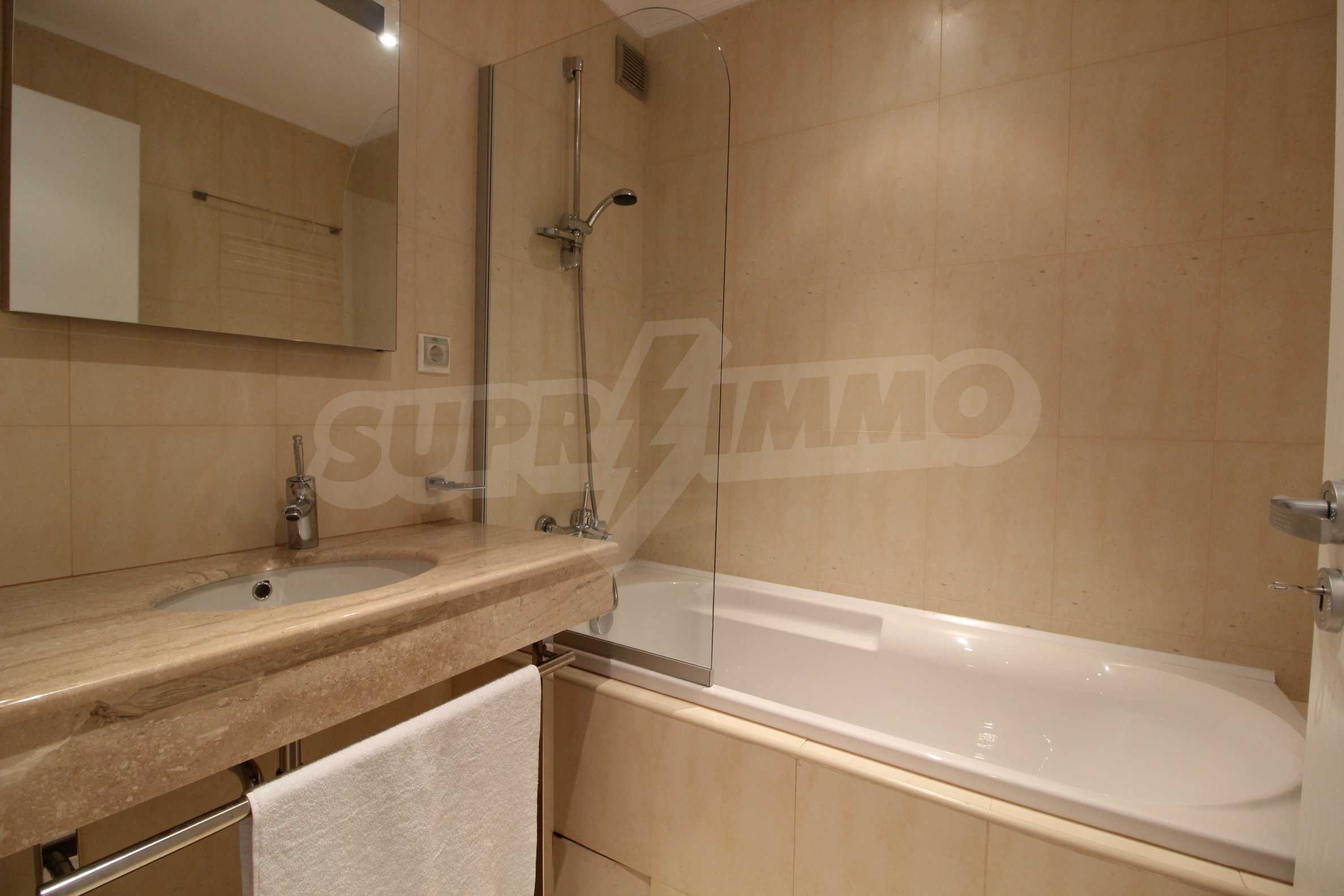 The described holiday home (2006), facing north, with beautiful view of the mountain, is located on the third floor with an area of 97 sq.m. The kitchen includes a 4-hob, an extractor fan, a sink, a fridge, a kettle, a toaster. The living room - a double sofa, 2 armchairs, a tv, a coffee table, a tv stand, wi-fi, telephone-reception, a dining table, 4 chairs, blinds. Bedroom 1: 2 single beds, 2 bedside tables, a double wardrobe, a dressing table with a mirror and a chair. Bedroom 2: a double bed, 2 bedside tables, a double wardrobe, a dressing table with a mirror and a chair. Bathroom with WC - a sink, a mirror. Bathroom with WC 2 - a bath, a shower box, a sink, a mirror, a water heater. En-suite Bathroom 3 - a shower, a sink, a mirror. The floors are with laminate and carpets, the window frames are PVC. The property is equipped with telephone, cable TV, Internet, and the building has a reception and lift. The annual maintenance fee is 12 euro / sq.m.