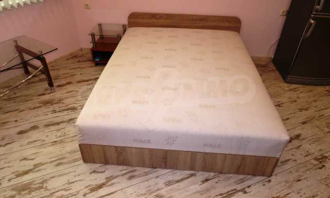 The total area of this apartment is 43 sq.m., living area - 35 sq.m. It consists of one room, a bathroom with WC, a balcony, an entrance hall. The premise consists of an equipped kitchenette with a washing machine, an oven, an extractor hood, a fridge-freezer, a double bed with mattress, a wardrobe, a bar table with two chairs, a standard air conditioning.