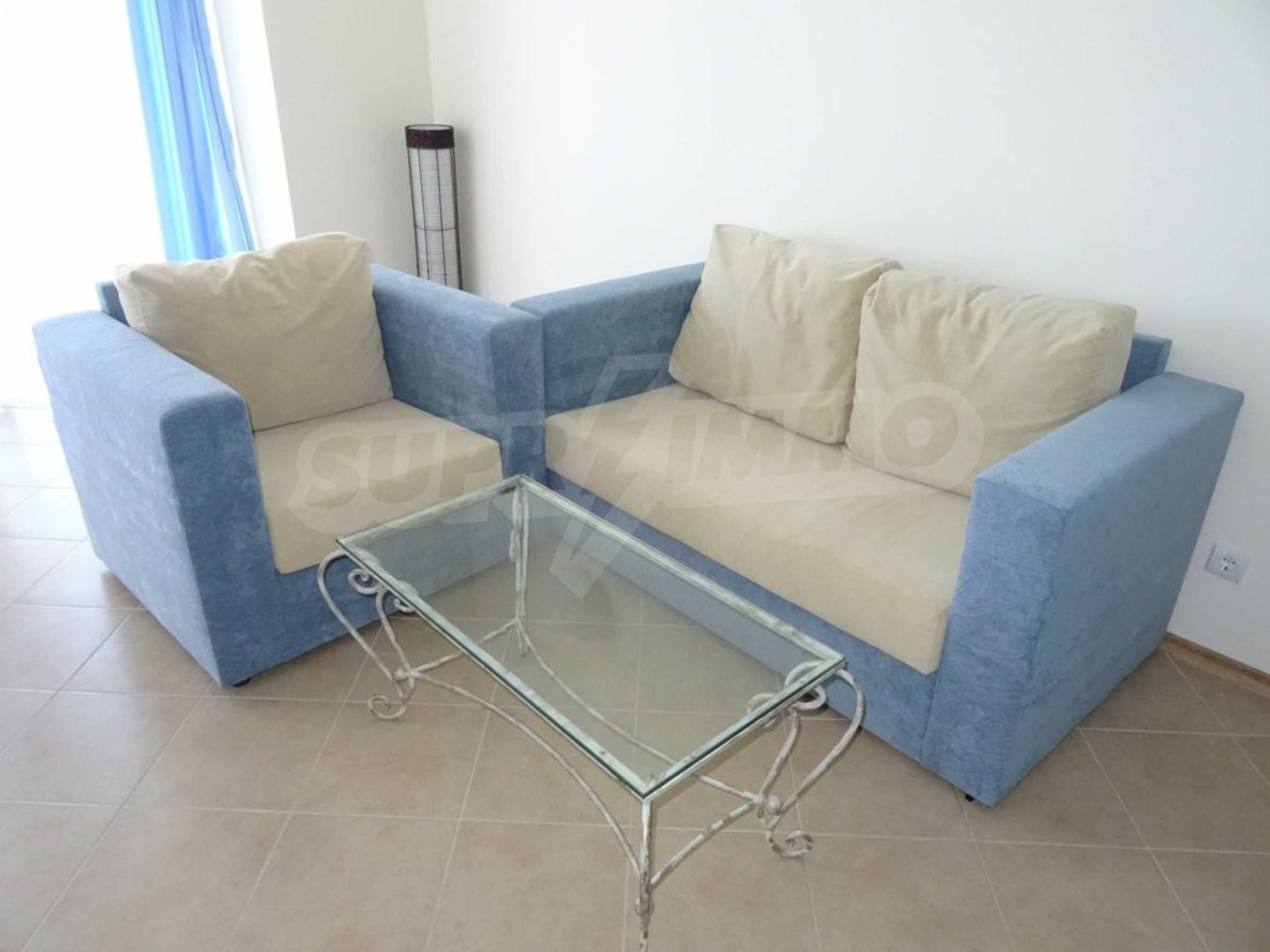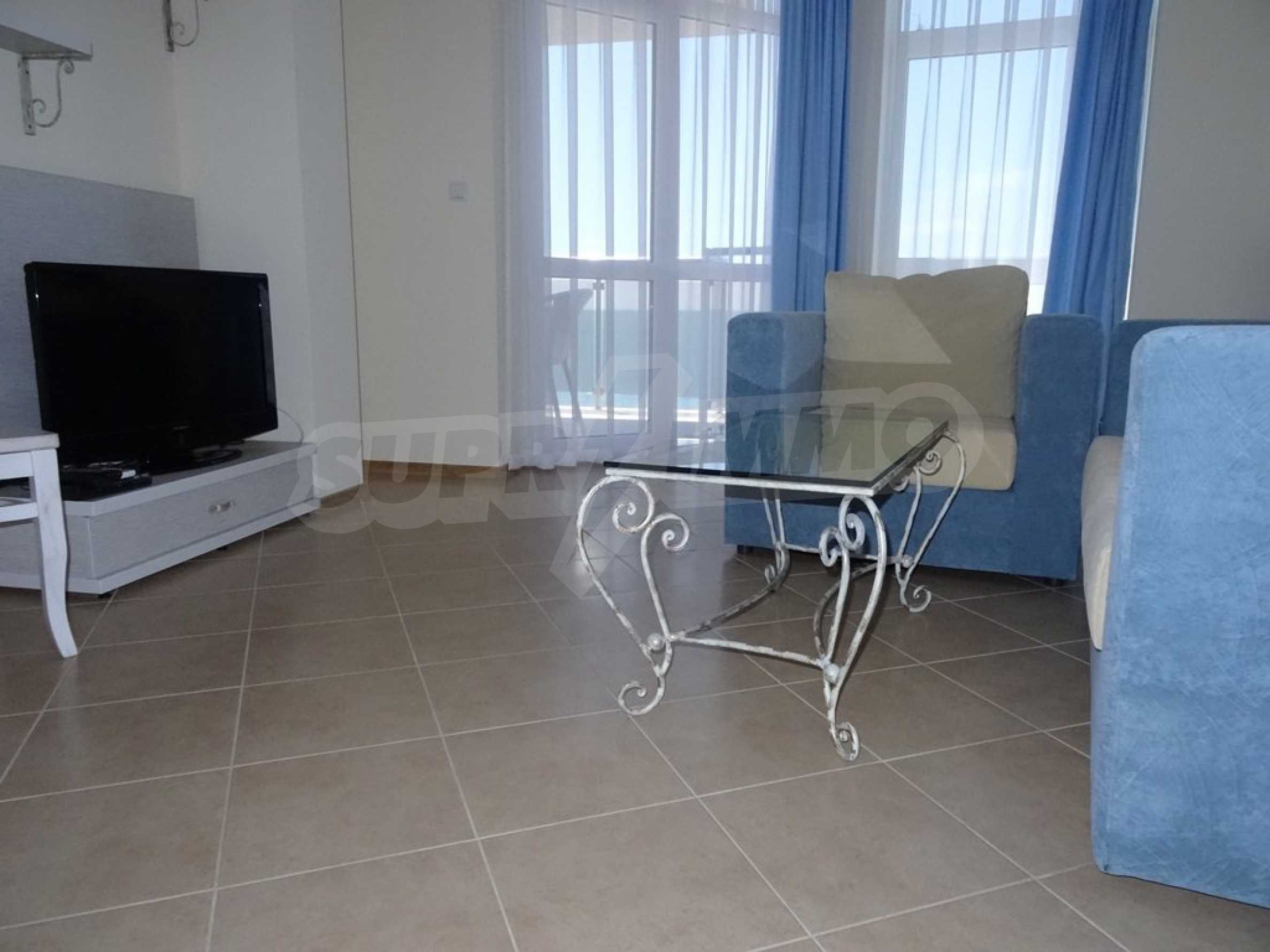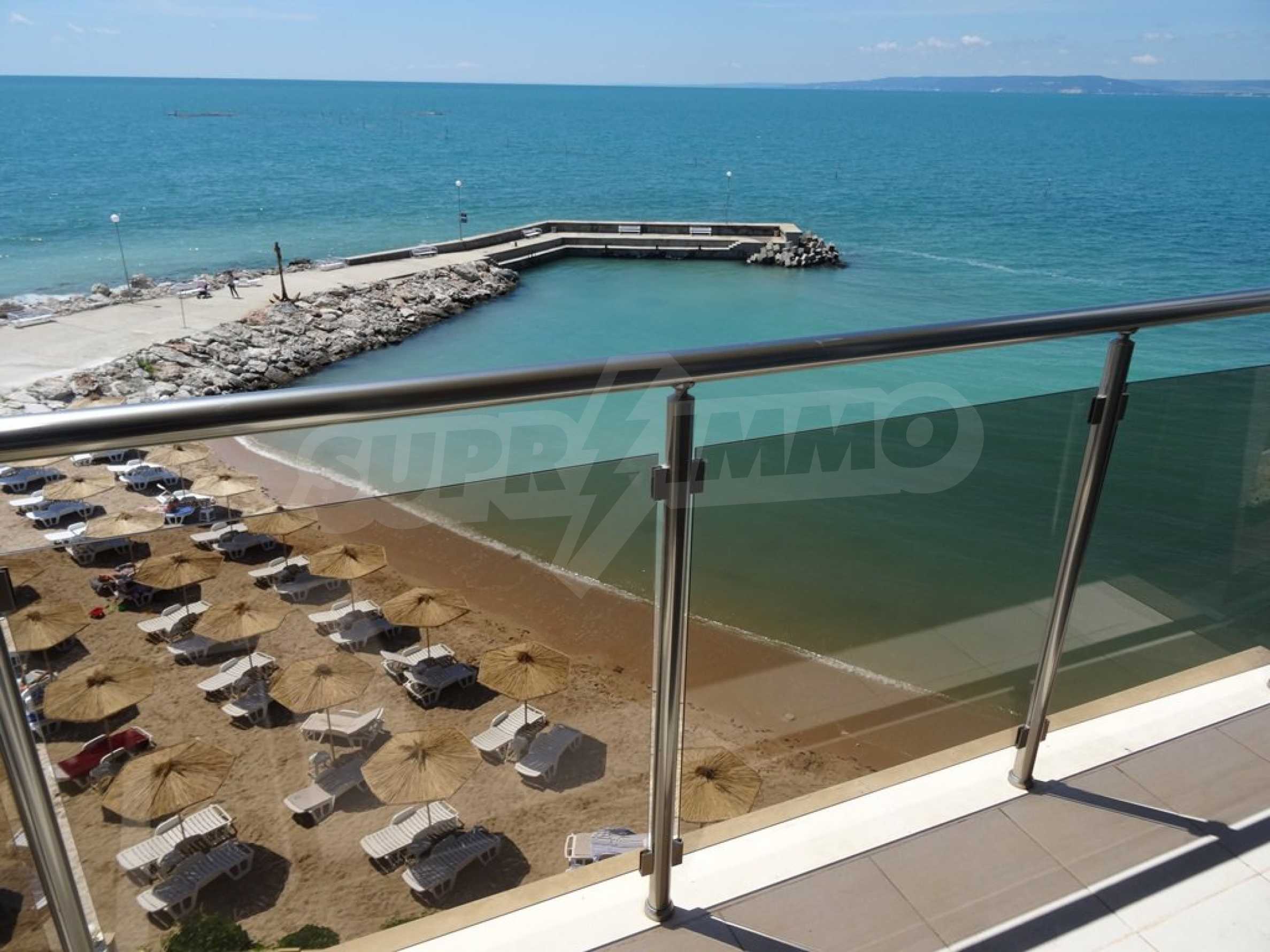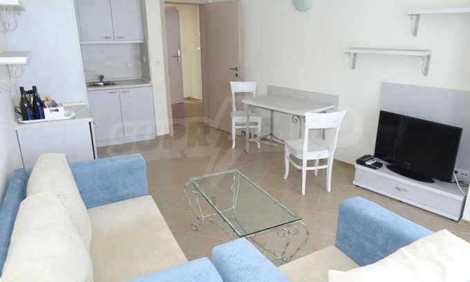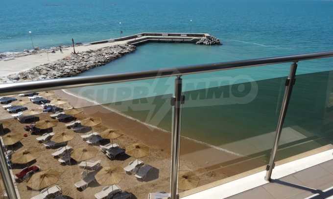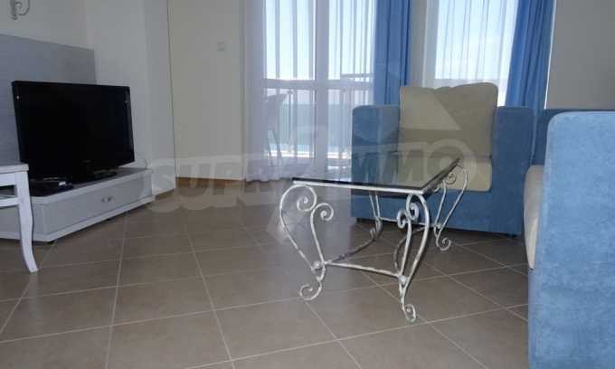 Apartment (81.53 sq.m.) from the living room with kitchen, one bedroom, bathroom with toilet and a terrace. Apartment faces South and provides wonderful views of the beach and sea. The property is offered for sale with full furniture and equipment, air conditioners, and wiring for telephone, cable TV, Internet. The annual maintenance fee of the complex is 8 Euro per sq. m.