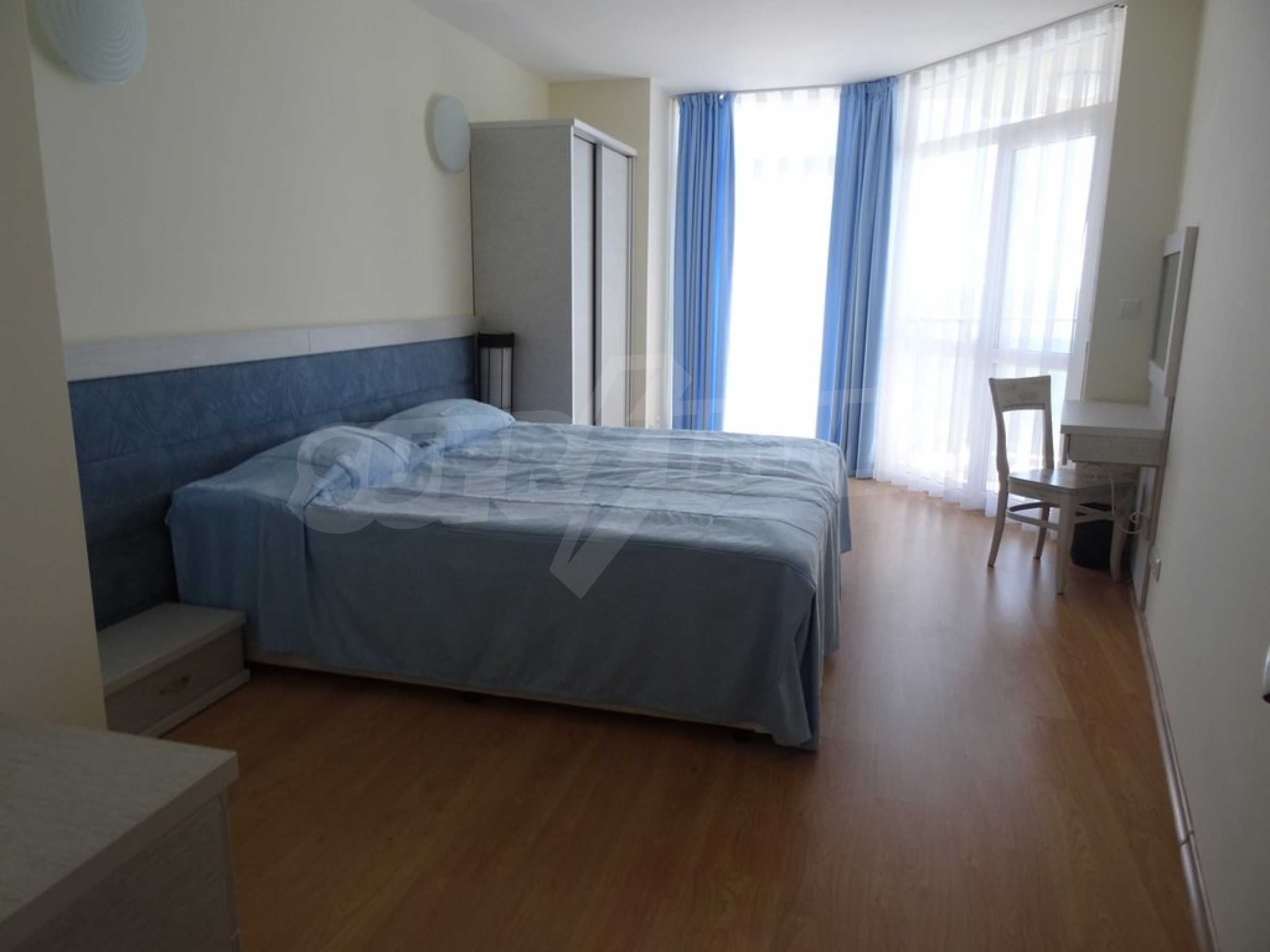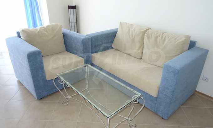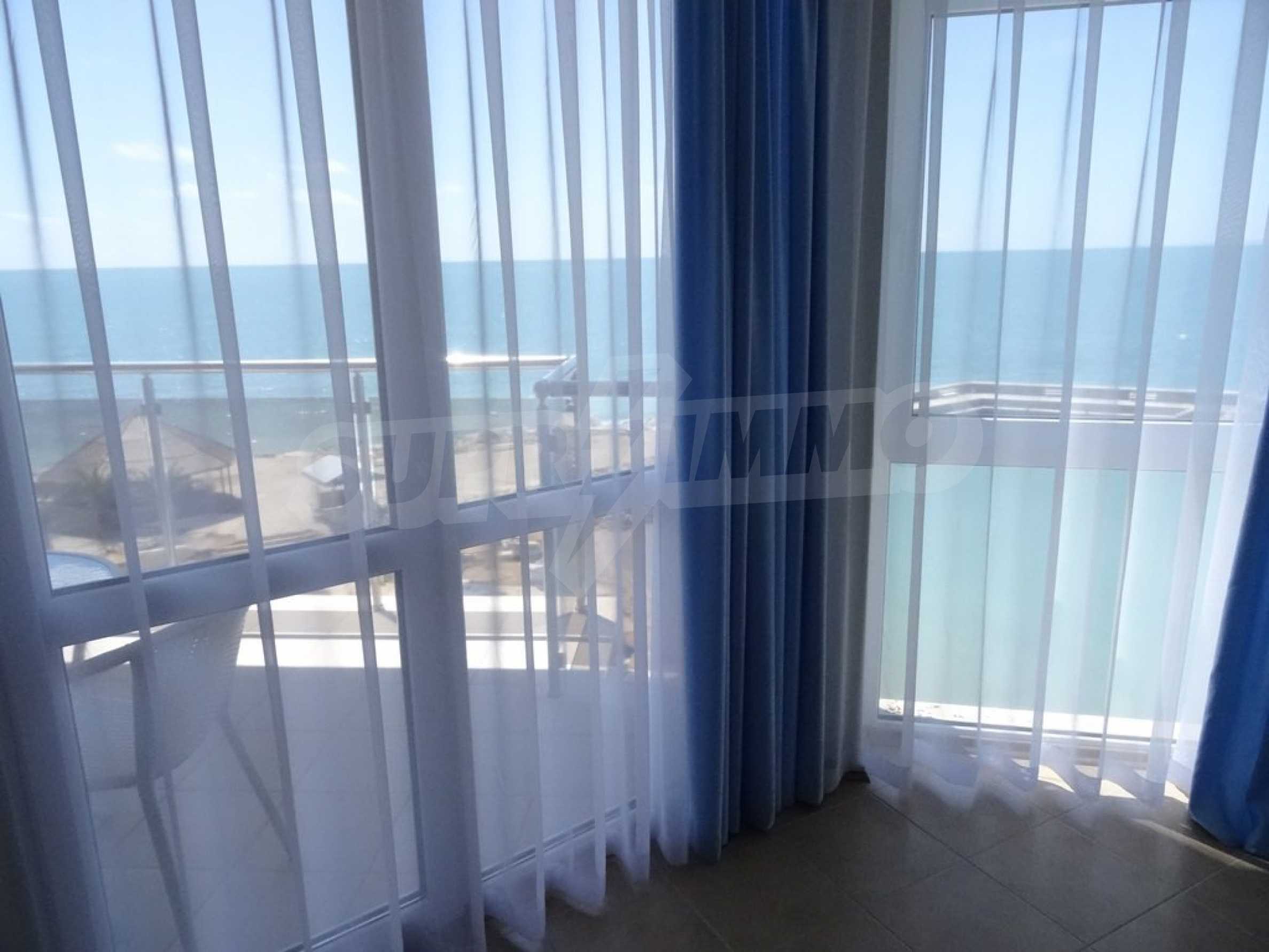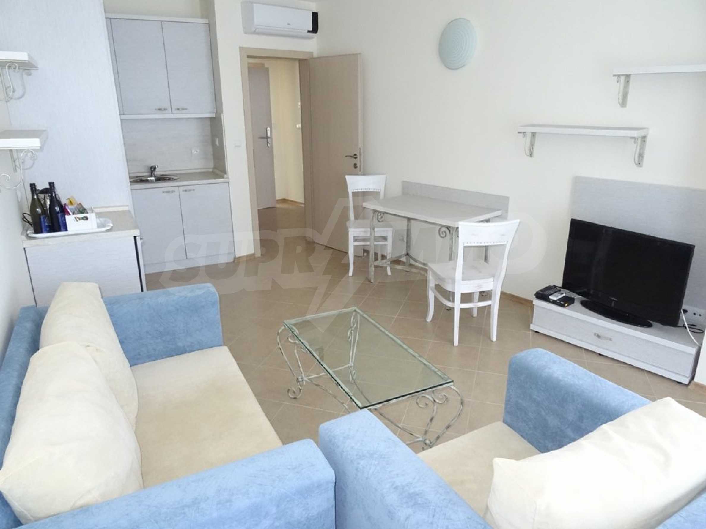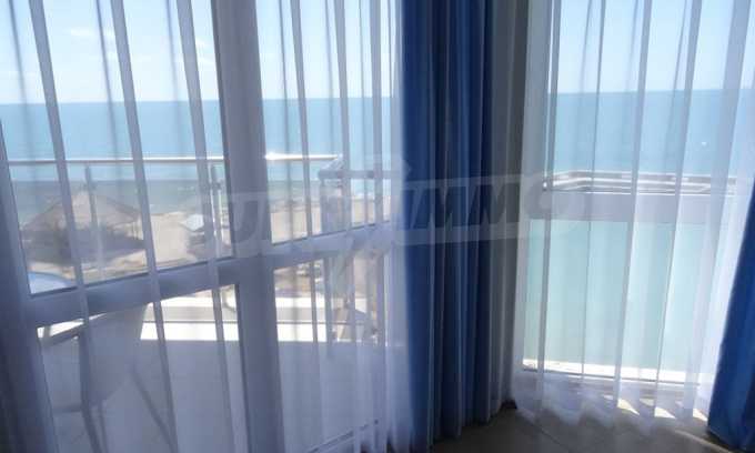 Apartment (81.53 sq.m.) from the living room with kitchen, one bedroom, bathroom with toilet and a terrace. Apartment faces South and provides wonderful views of the beach and sea. The property is offered for sale with full furniture and equipment, air conditioners, and wiring for telephone, cable TV, Internet. The annual maintenance fee of the complex is 8 Euro per sq. m.