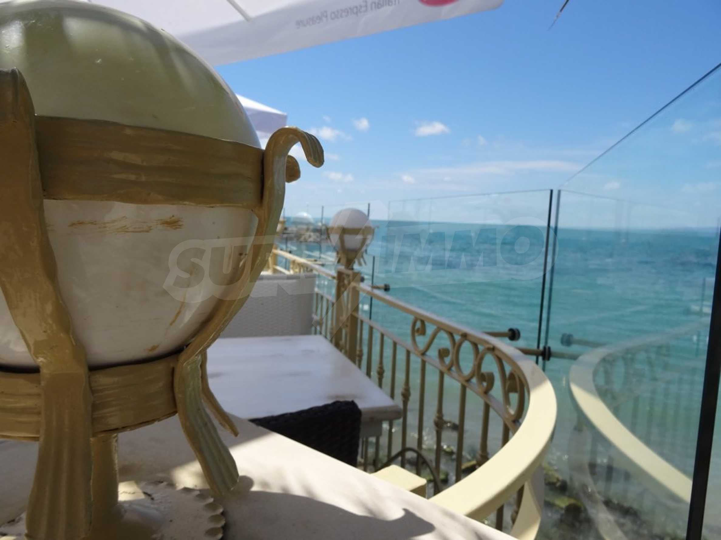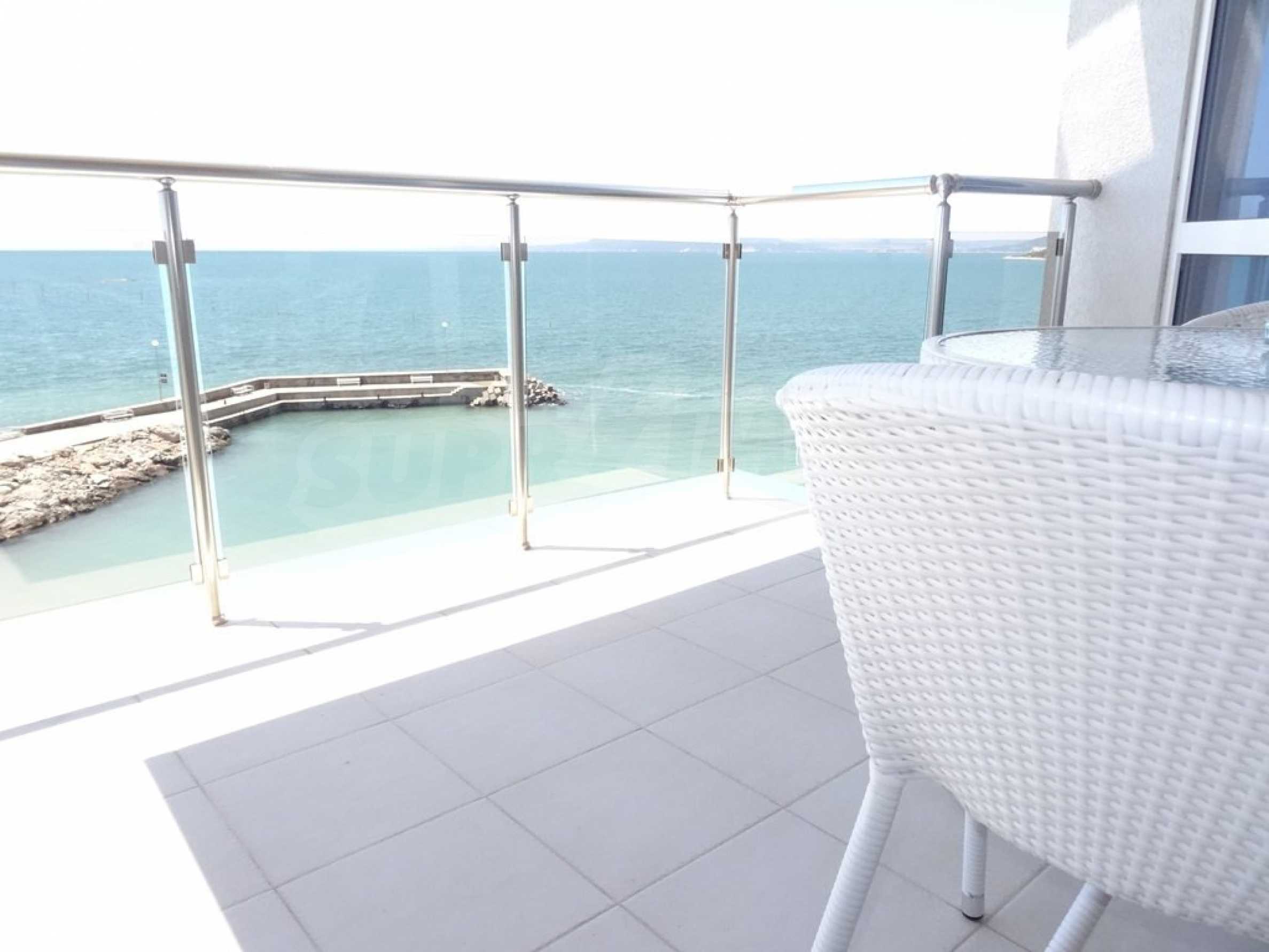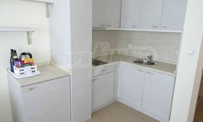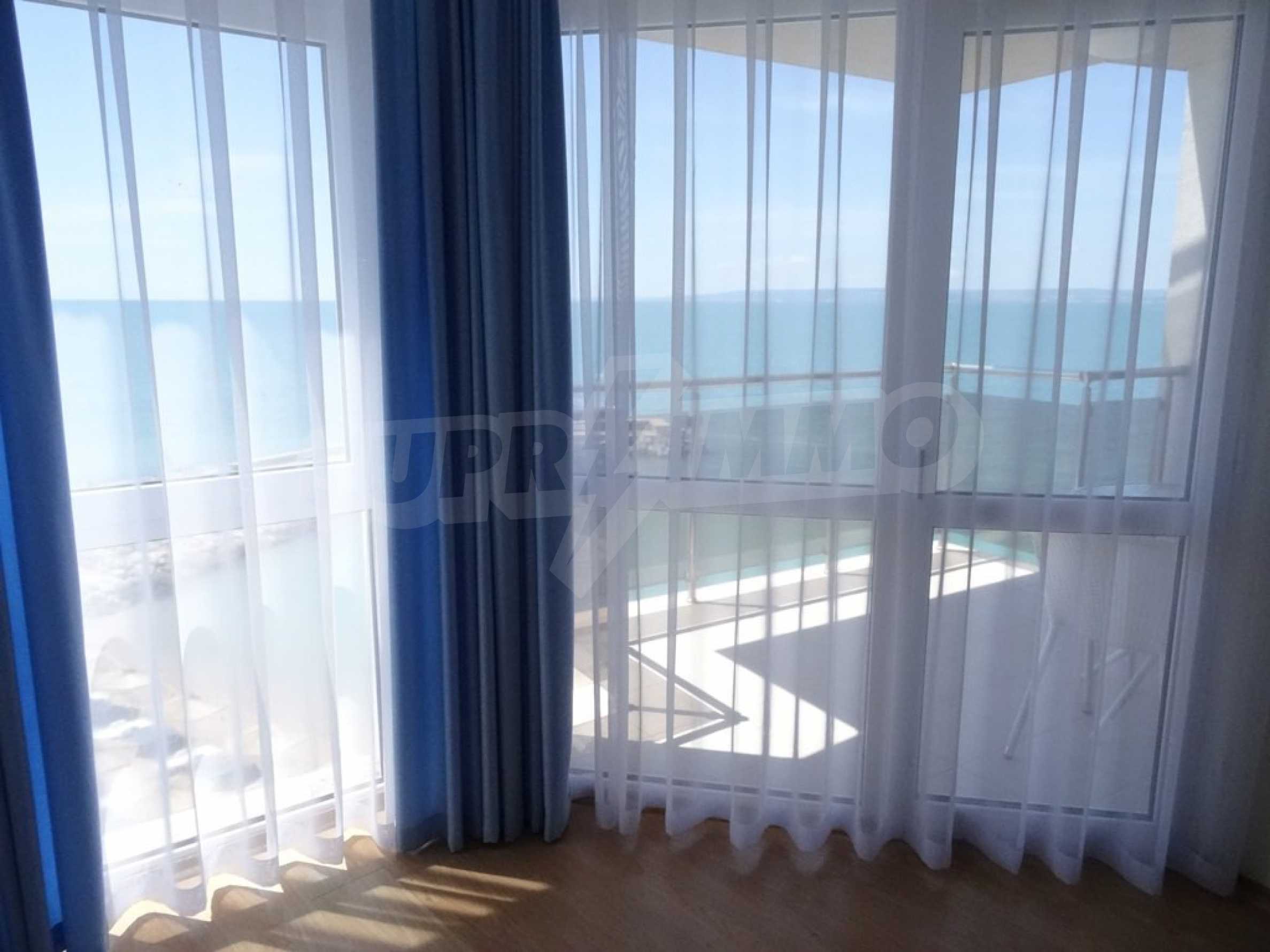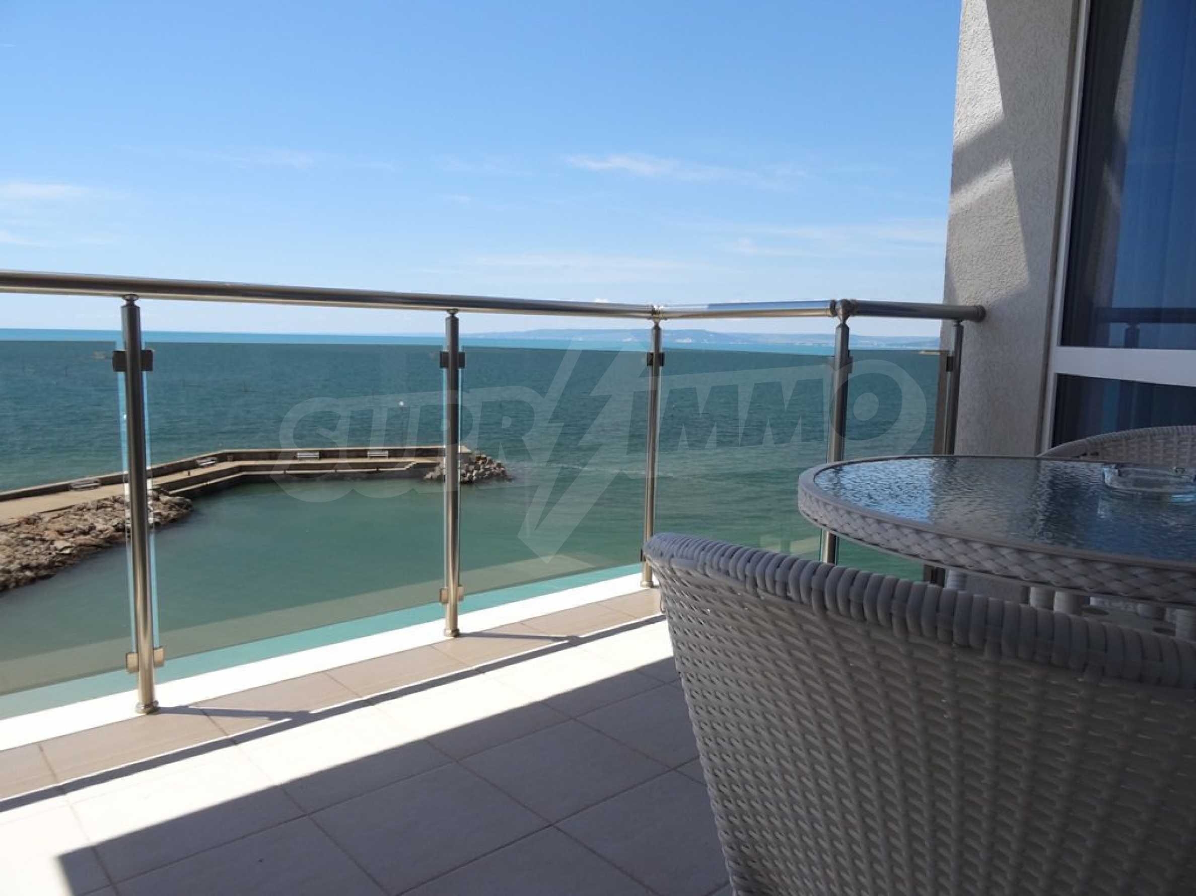 Apartment (81.53 sq.m.) from the living room with kitchen, one bedroom, bathroom with toilet and a terrace. Apartment faces South and provides wonderful views of the beach and sea. The property is offered for sale with full furniture and equipment, air conditioners, and wiring for telephone, cable TV, Internet. The annual maintenance fee of the complex is 8 Euro per sq. m.