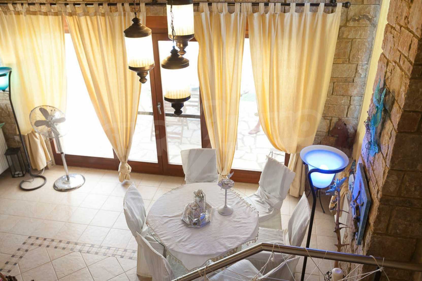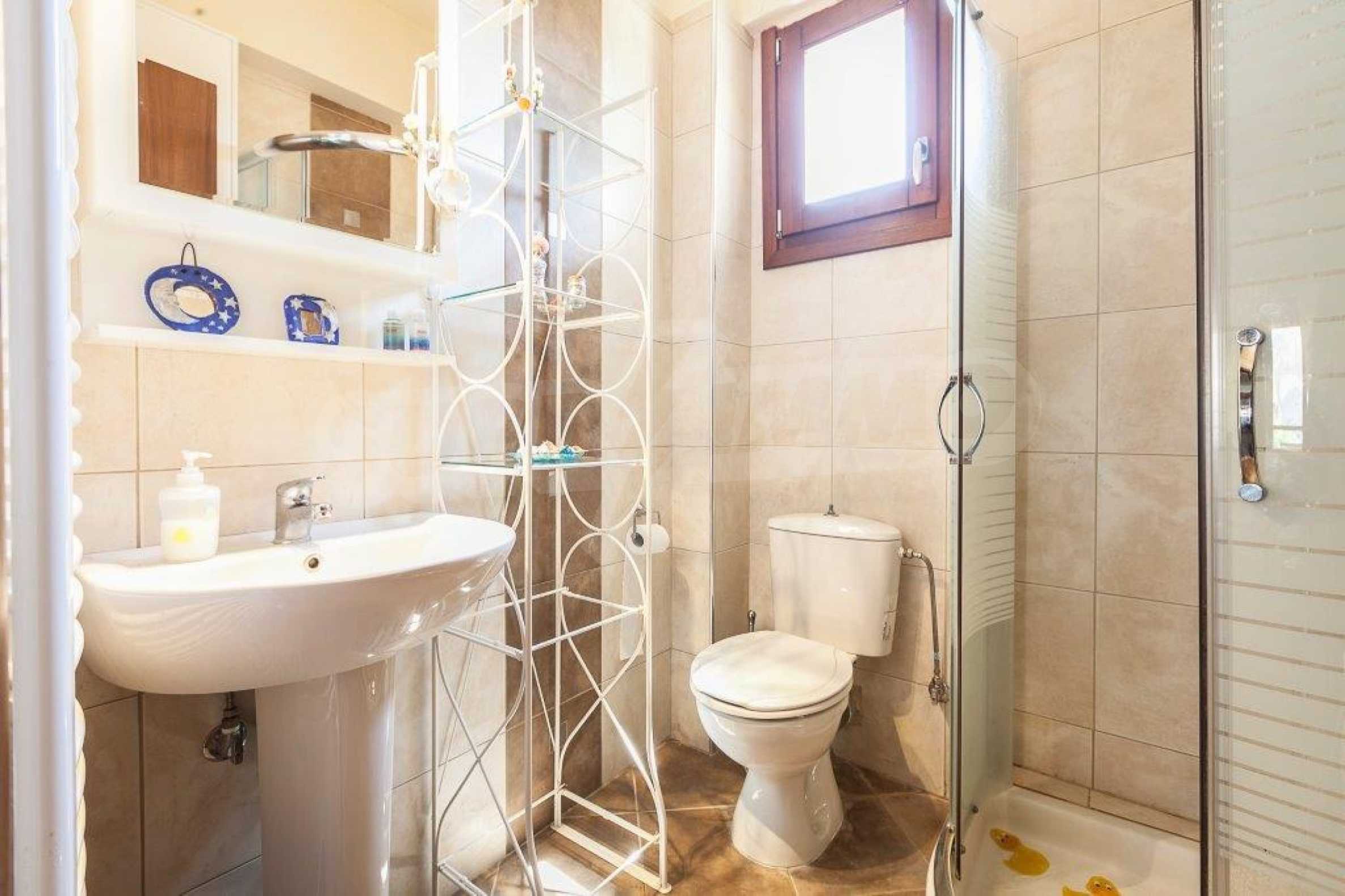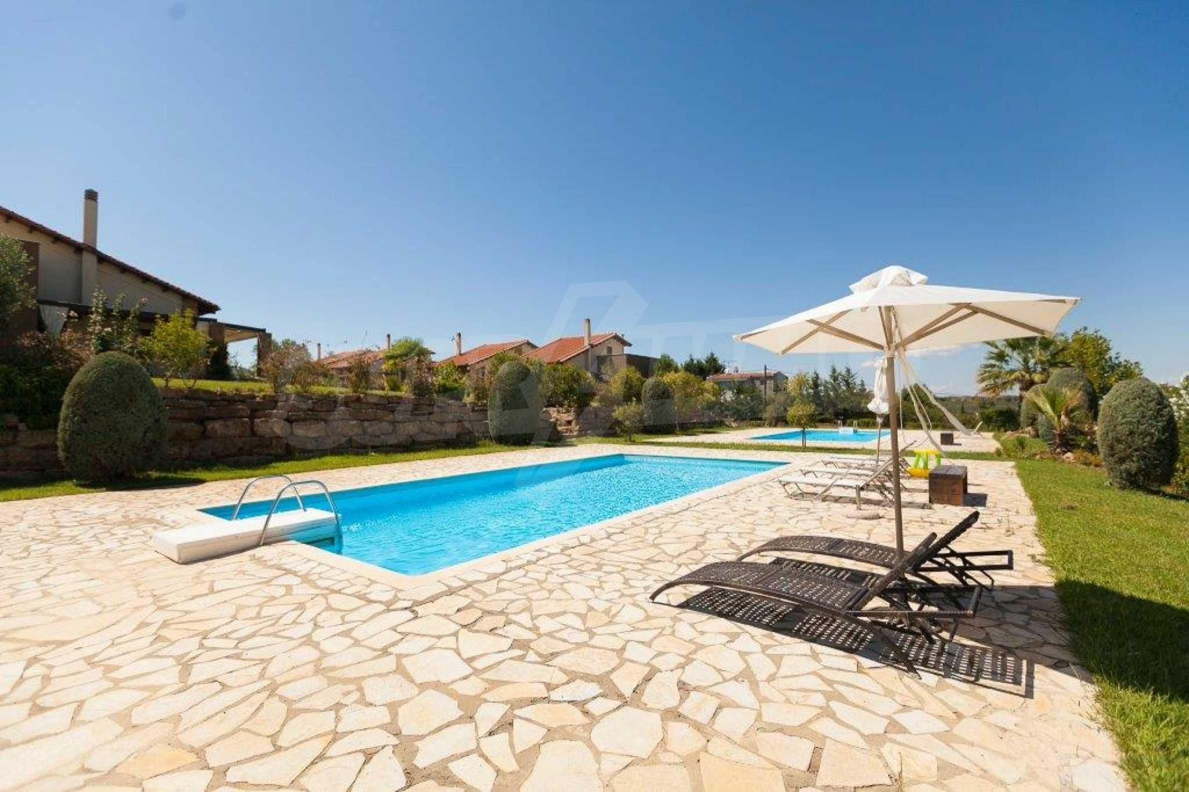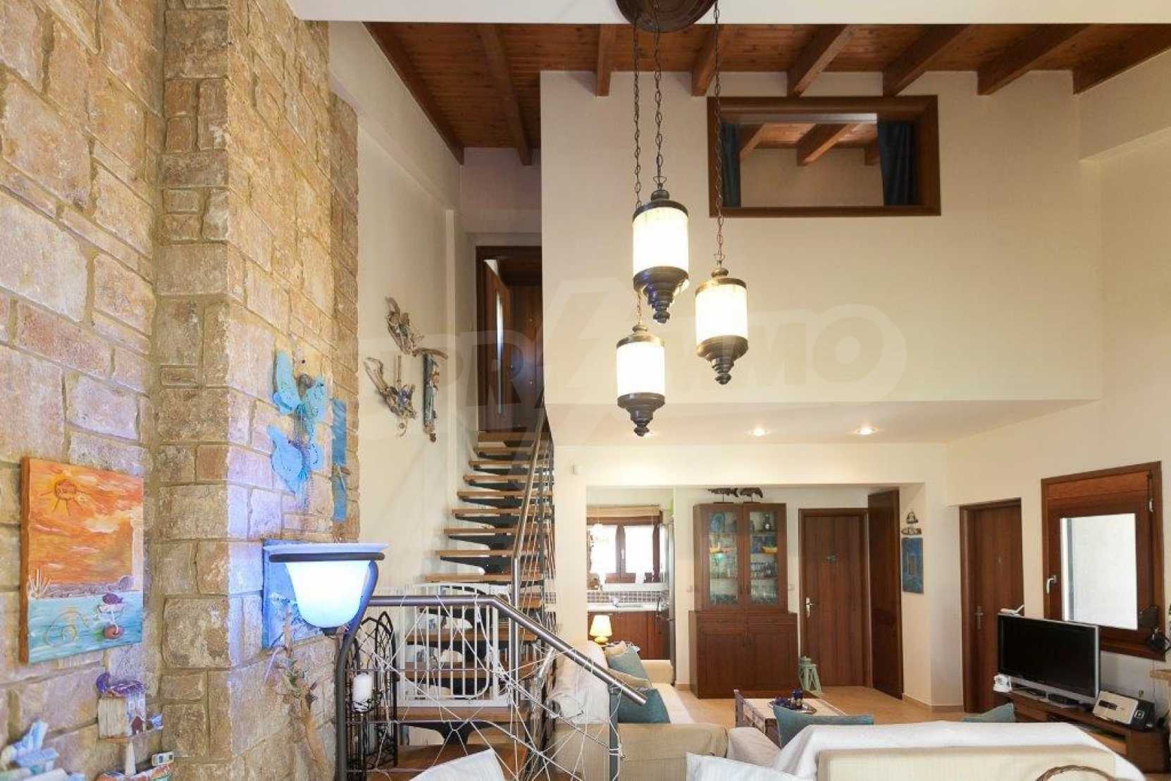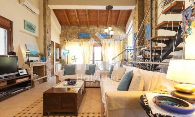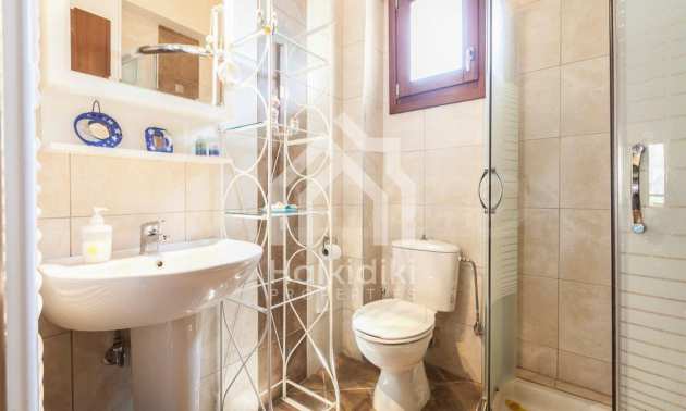 Luxurious villa in Kassandra, Halkidiki, 117 sqm. The complex is consisted of 4 private villas and a swimming pool. The house is consisted of three levels of 40 sqm each. On the basement there is a large guest room with two sofas and a closet, that can accommodate up to four people. Also on the basement is the boiler room and storage room.On the ground floor there is a bedroom with double bed, living room connected with kitchen, dining room, fireplace, television, kitchen, dish washer, all the kitchen appliances, dishes, kitchenware etc. On the first floor there is a bedroom with double bed. There is air conditioning and television in all the rooms and bathroom with shower in all the floors. Wi Fi is available. In the veranda there is a patio living room and dining room for six people. Also, outdoor Barbecue with gas, four sunbeds and a tent for the swimming pool. The dimentions of the pool are 5x12 m, and its depth varies from 0.90 to 2.20 m. Parking space is available for 2 cars.
