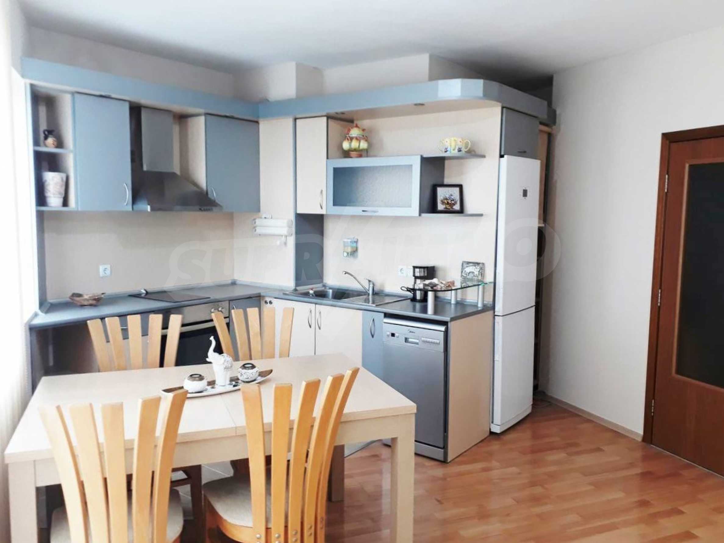 The apartment is set on the fourth floor of a new building (2006). The facing southwest home has an area of 78.09 sq.m. distributed between a living room with kitchen, two bedrooms, a bathroom with WC and a south-facing balcony. The floors are with tiles and laminate, with PVC windows. The heating is with air conditioners Daikin. The apartment is equipped with telephone, cable TV and Internet. The building has an elevator that is not put into operation yet.