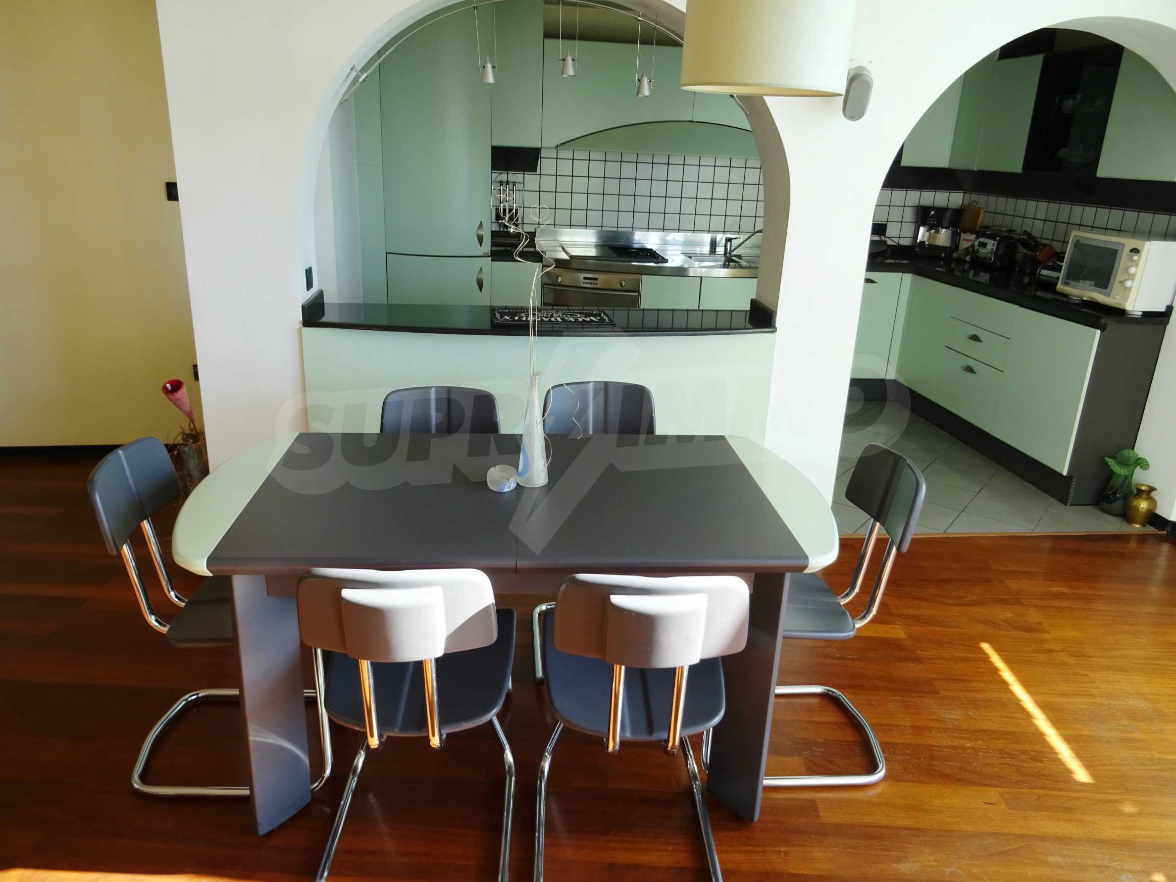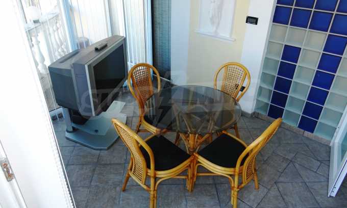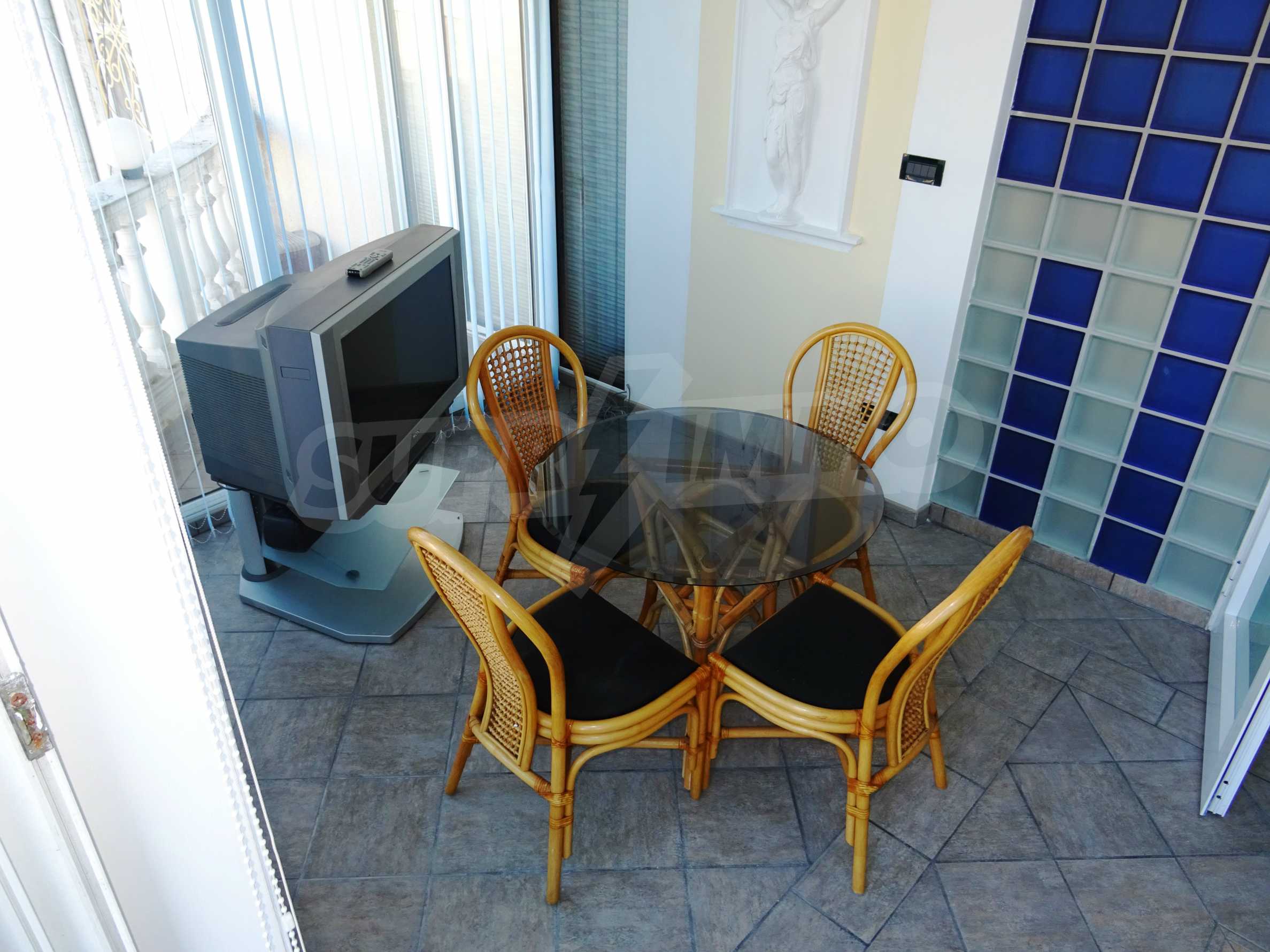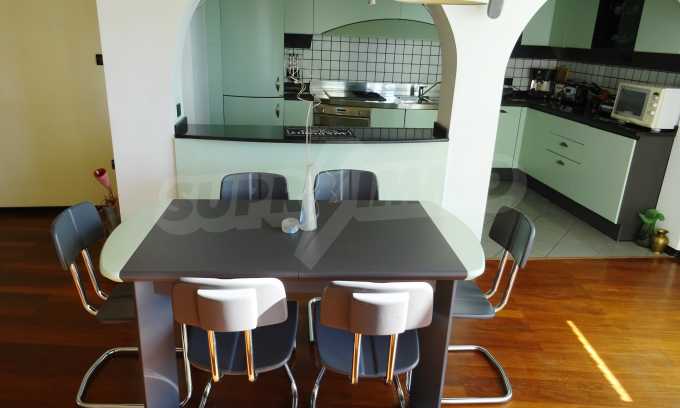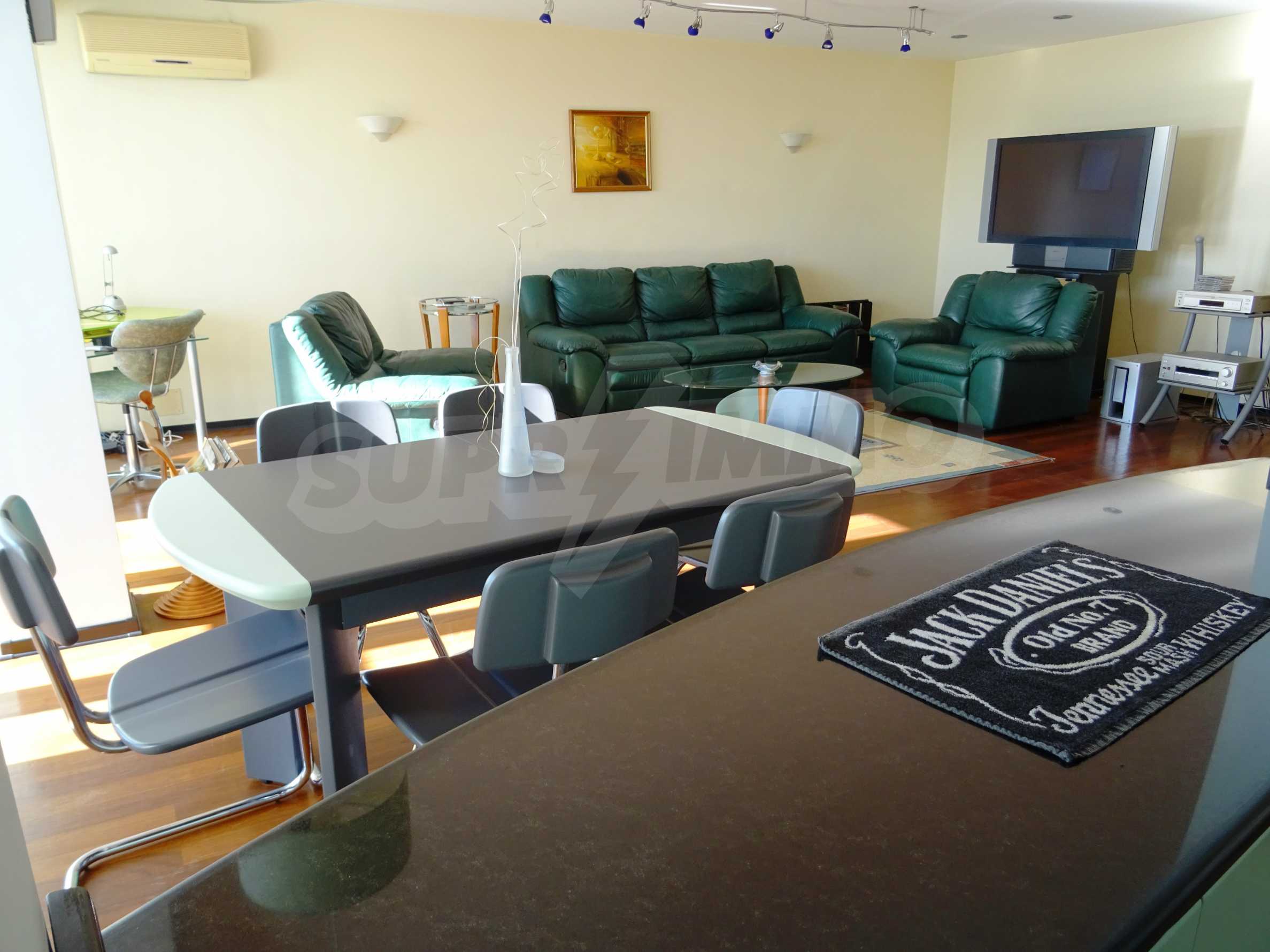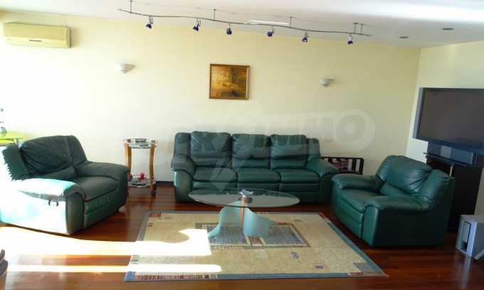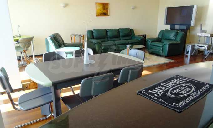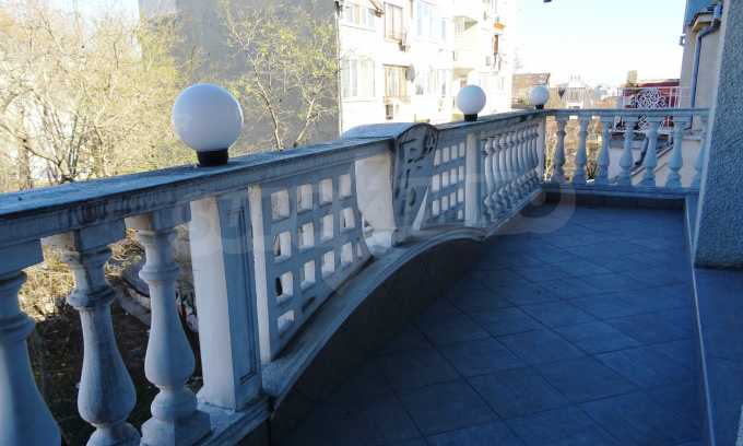 On an area of 173 sq.m, there is a spacious living room with kitchenette and breathtaking views to the sea and the Greek district, master bedroom with winter garden and a terrace, children's room with two single beds and a balcony, bathroom with Jacuzzi and shower cabin, toilet, laundry room and boiler room and a hallway.