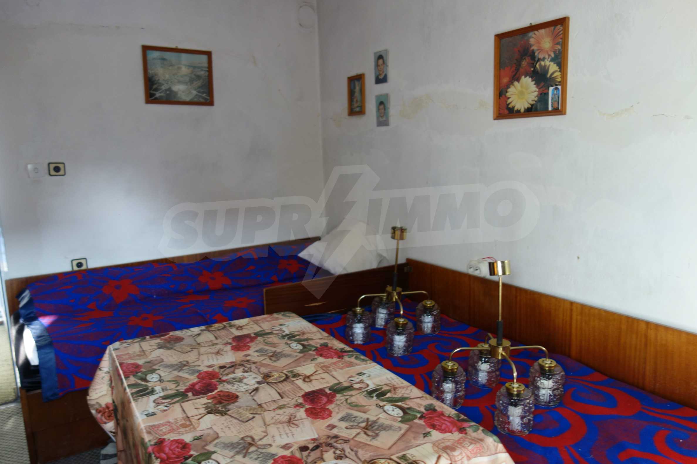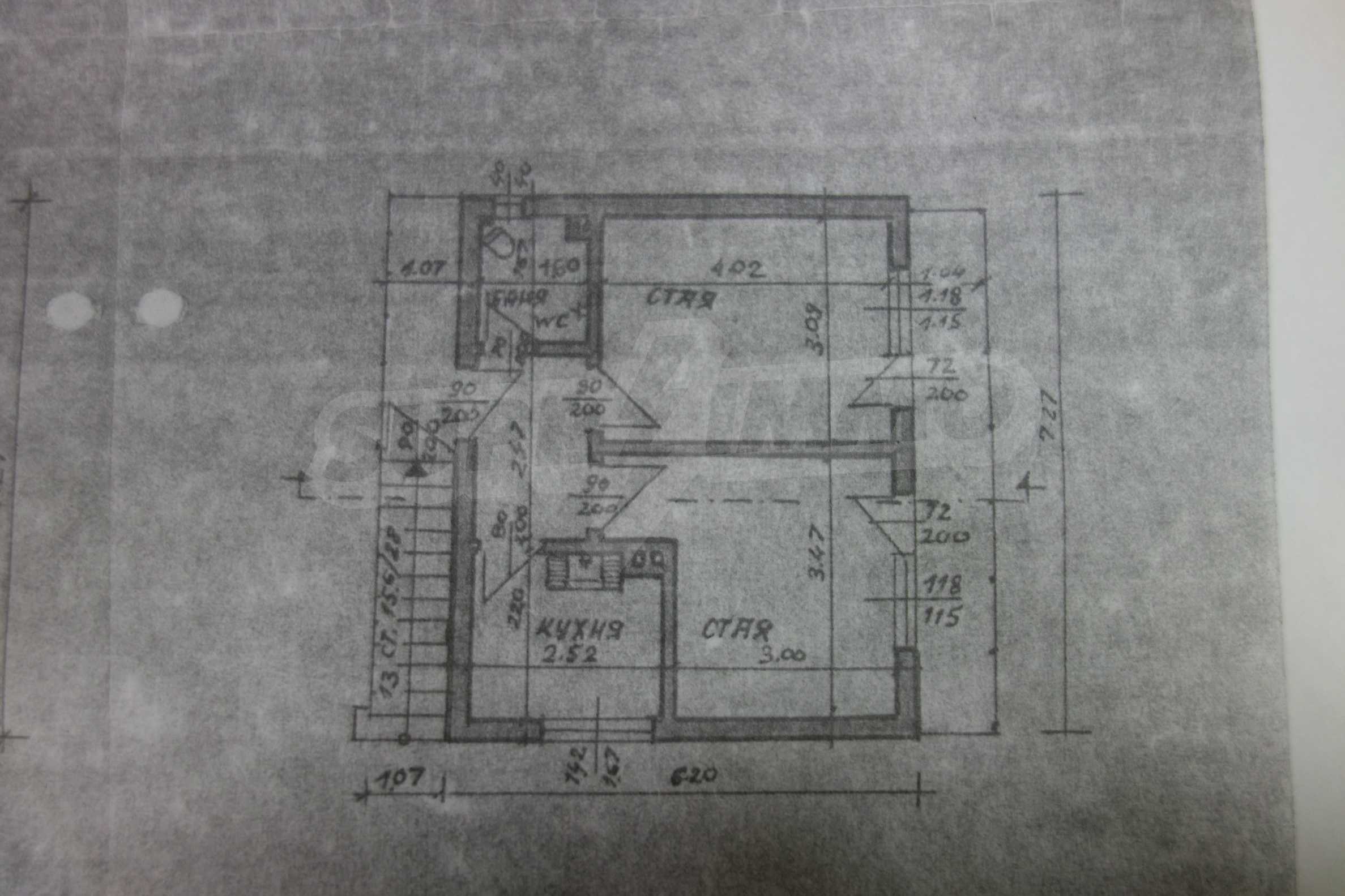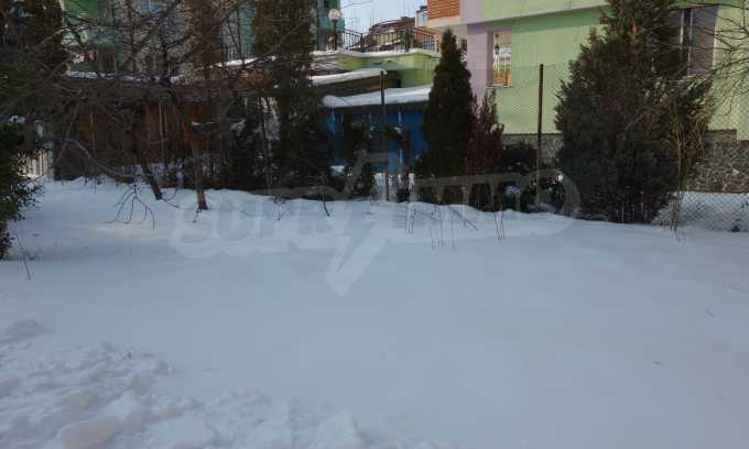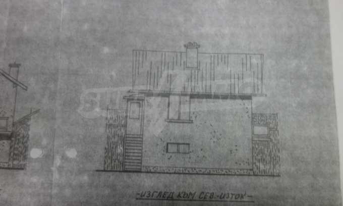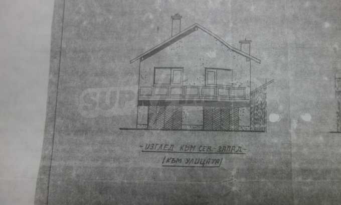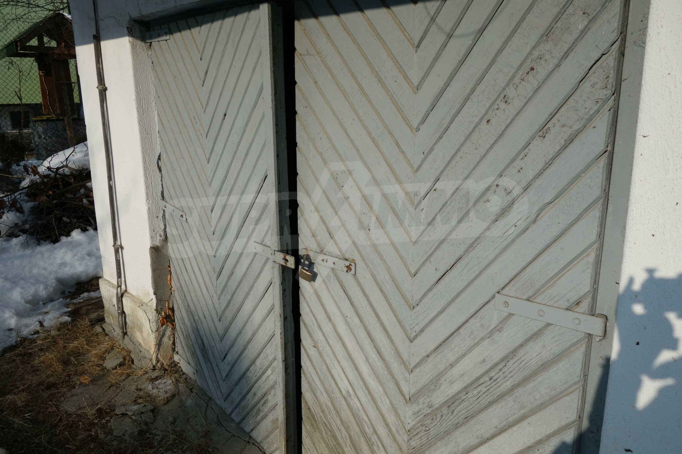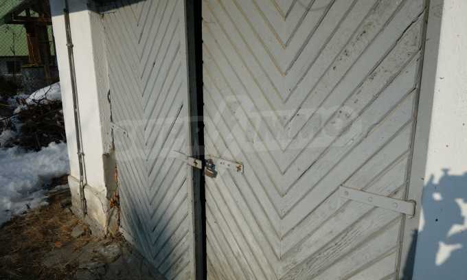 The two-storey house, located in the plot, was built in 1975 with an area of 46 sq.m. and two garages - 23.4 sq.m. and 21.5 sq.m. The property is facing south, but needs repairs. It is divided between 2 rooms, a kitchen, a hallway, a bathroom with WC, a veranda. The rooms are finished with painted walls, parquet floors, PVC joinery.