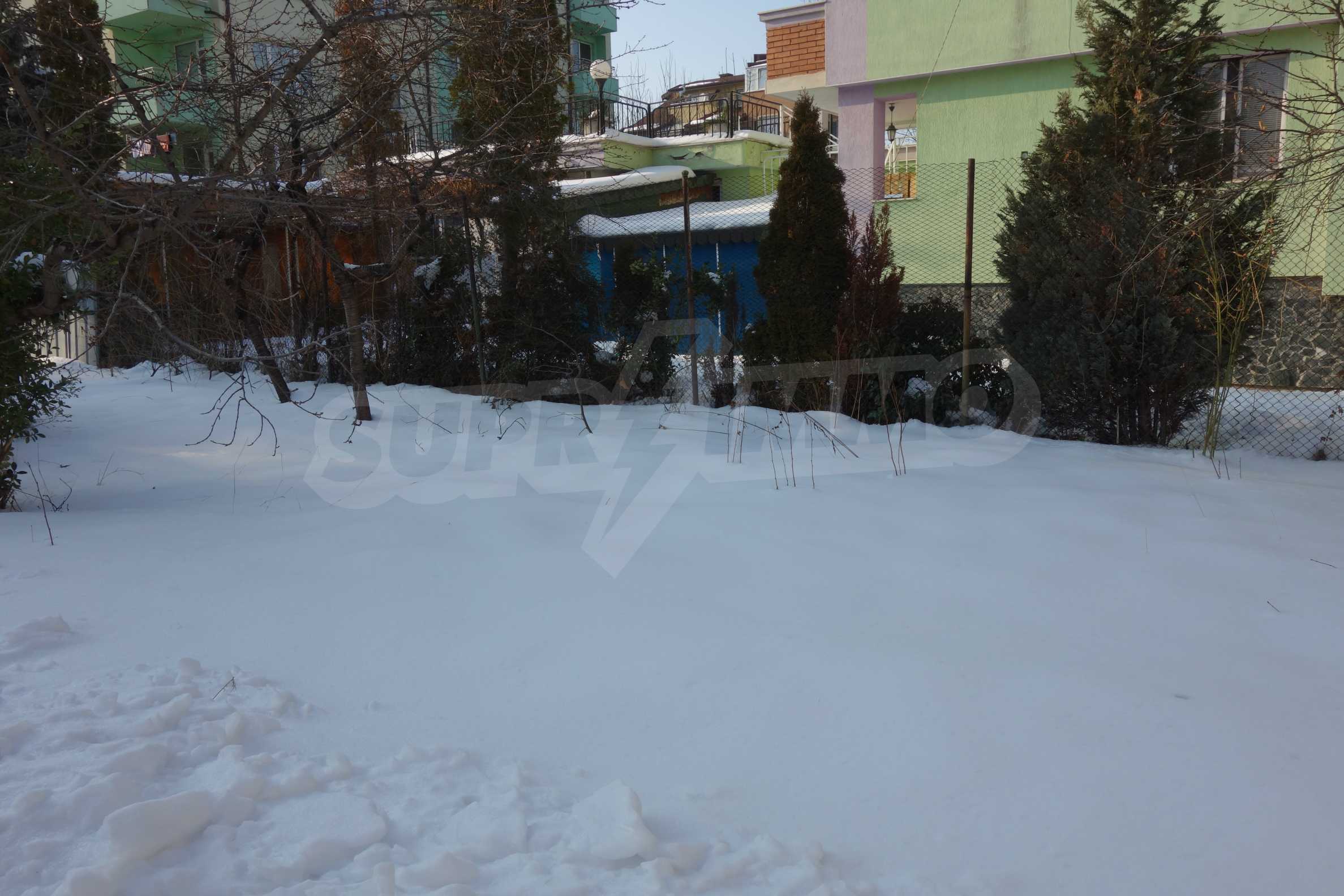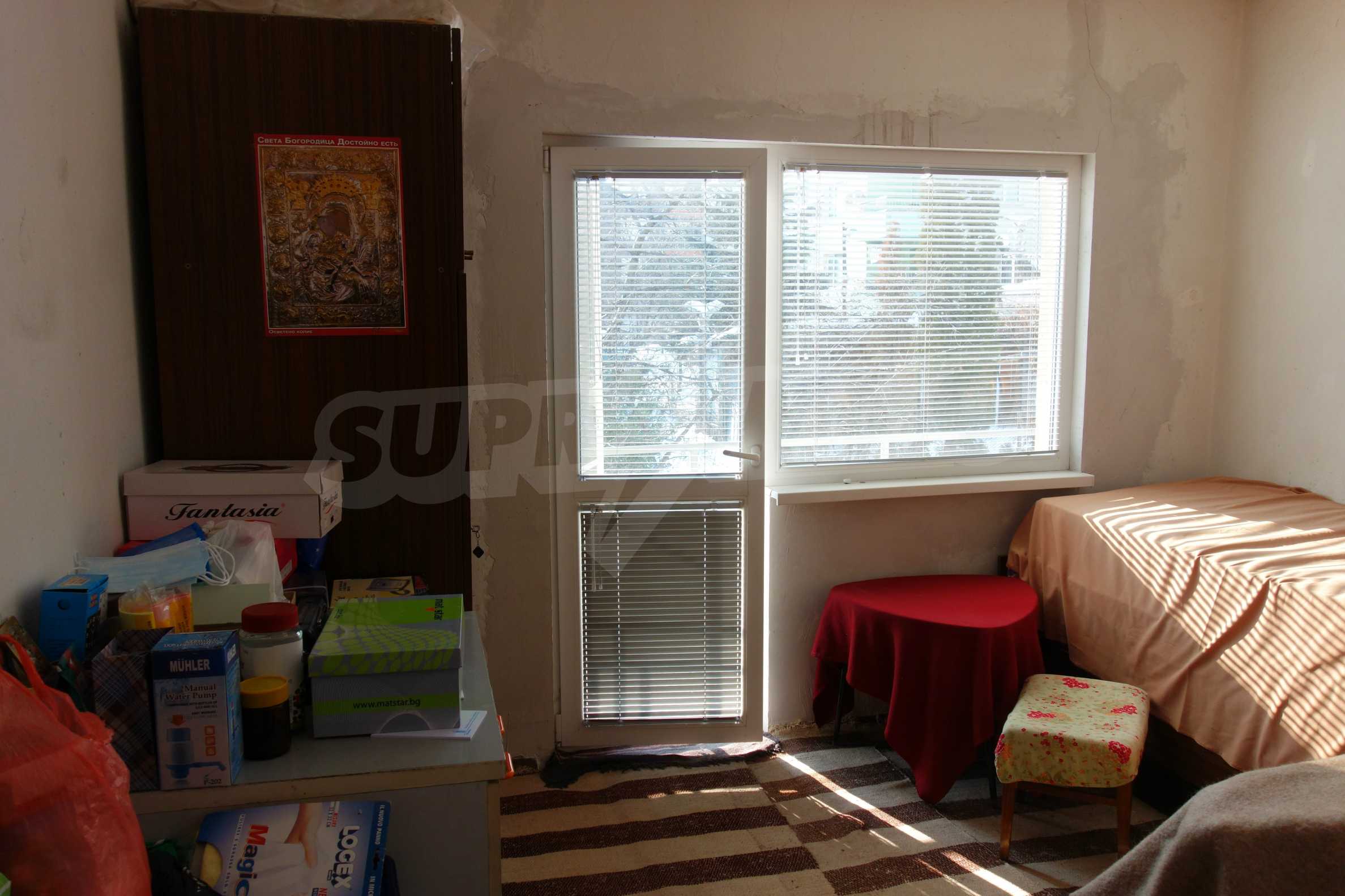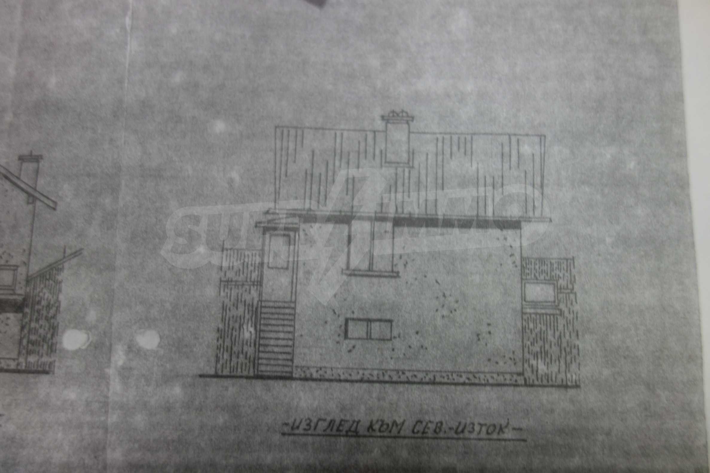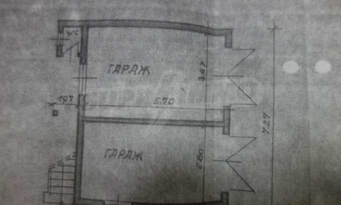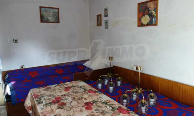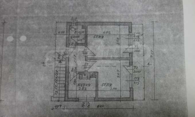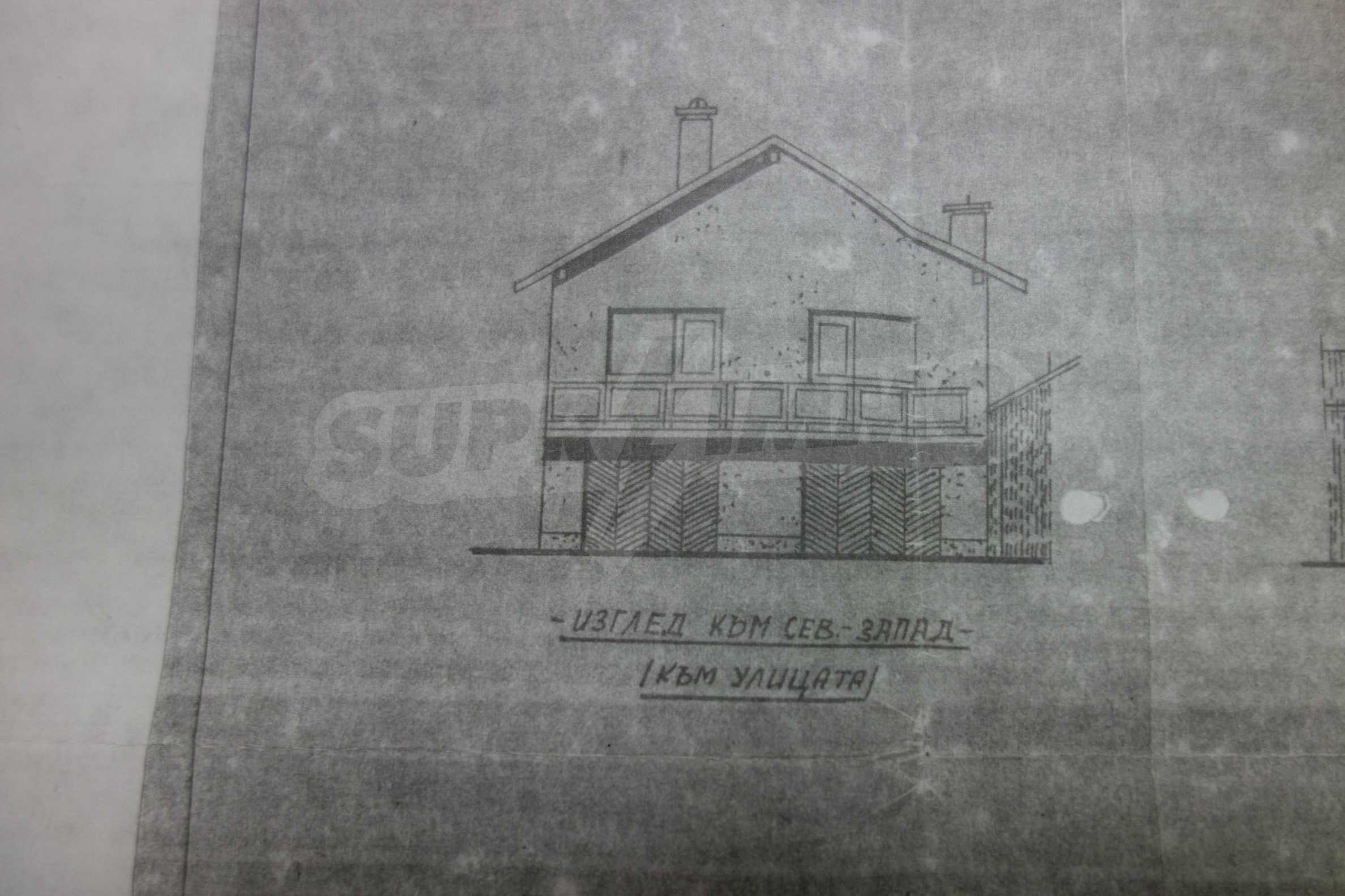 The two-storey house, located in the plot, was built in 1975 with an area of 46 sq.m. and two garages - 23.4 sq.m. and 21.5 sq.m. The property is facing south, but needs repairs. It is divided between 2 rooms, a kitchen, a hallway, a bathroom with WC, a veranda. The rooms are finished with painted walls, parquet floors, PVC joinery.