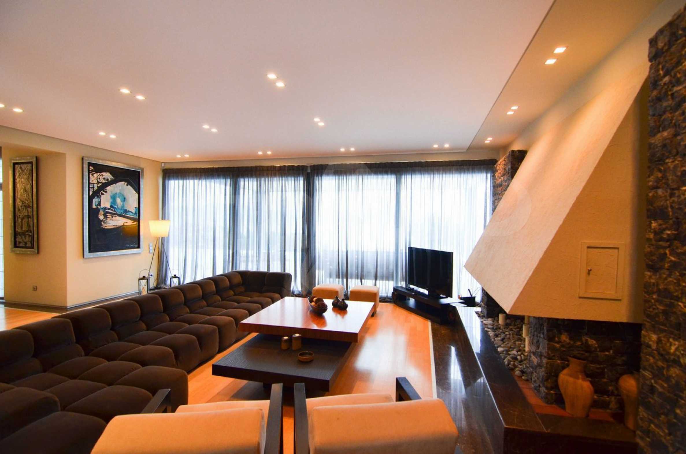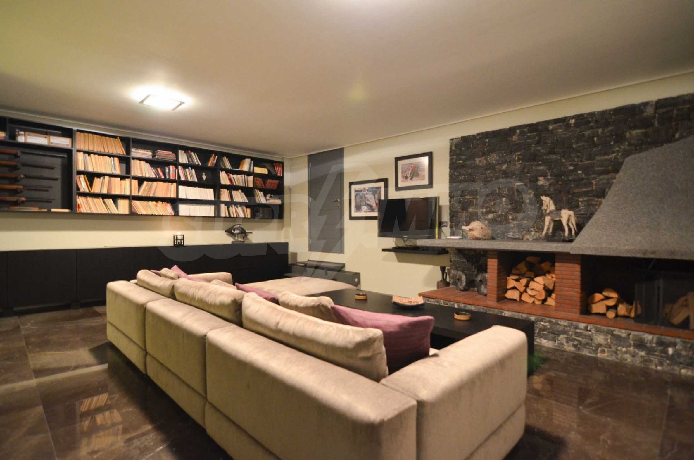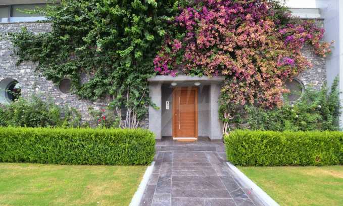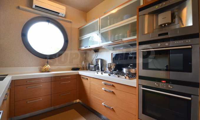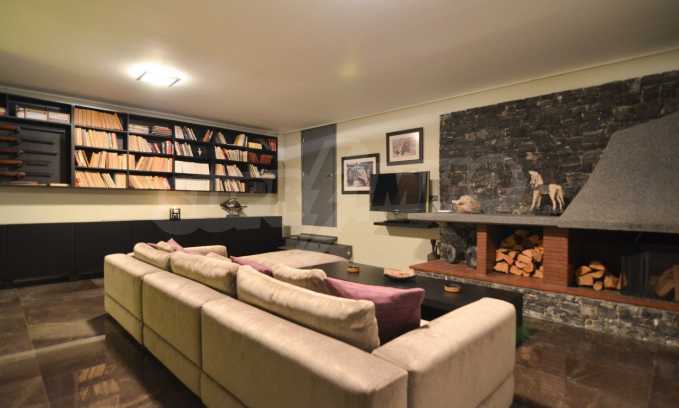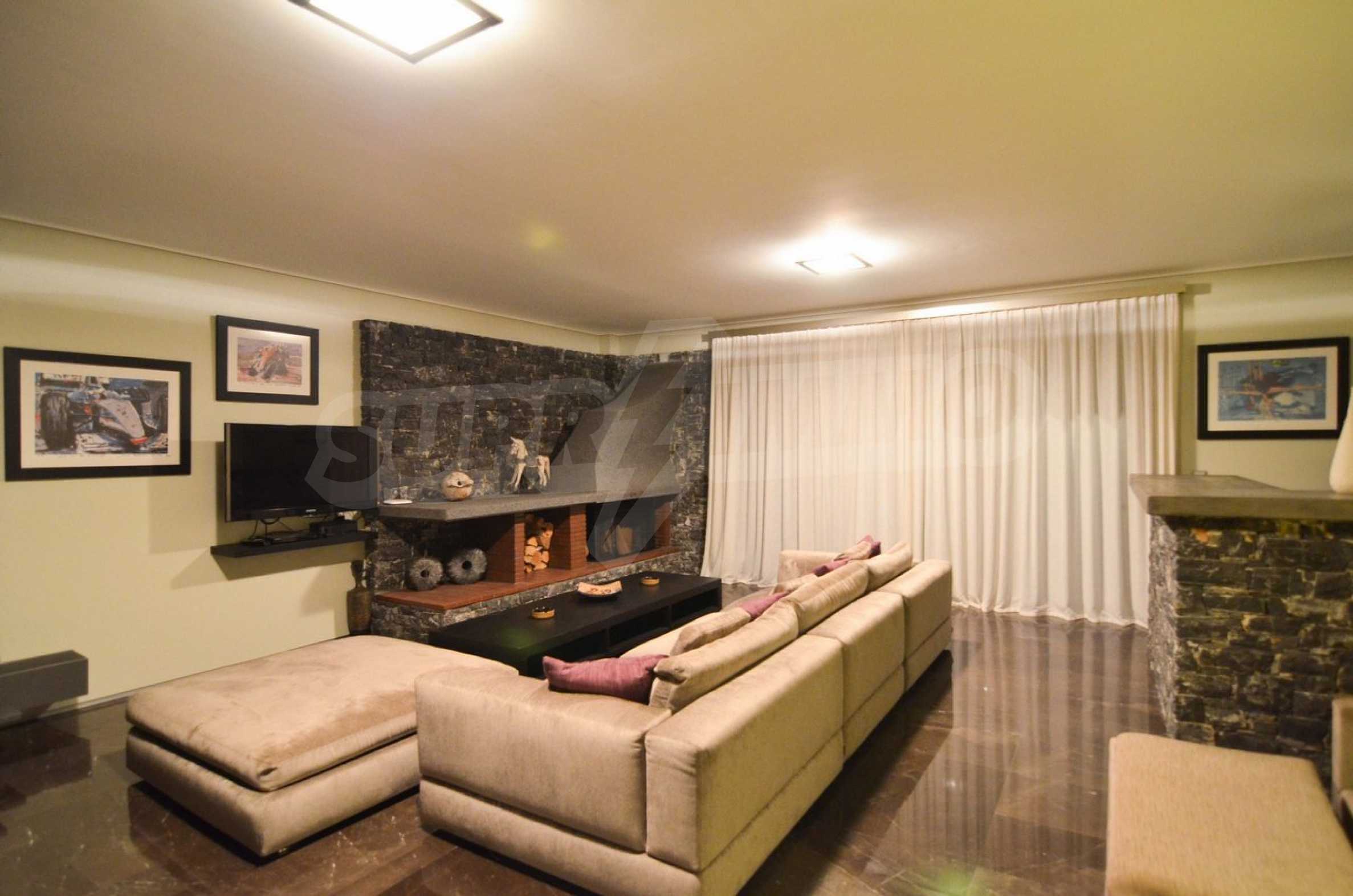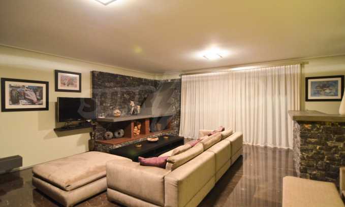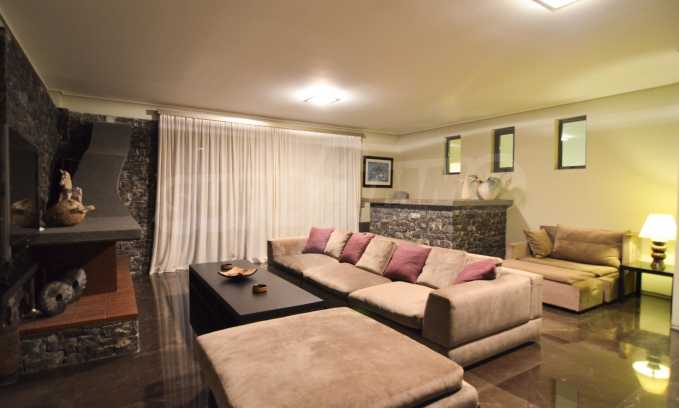 On the first level of the villa there is a semi-autonomous apartment consisting of three large bedrooms (about 30sq. m. each), each with its own bathroom, and a living room (60sq. m.) with a view towards the yard. Also, there is a bar, fireplace and a kitchen. Depending on one’s needs, the kitchen, one bedroom and bathroom can be isolated without communicating with the rest of the house (in case needed for guests’ domestic staff).