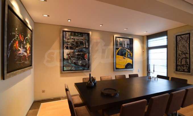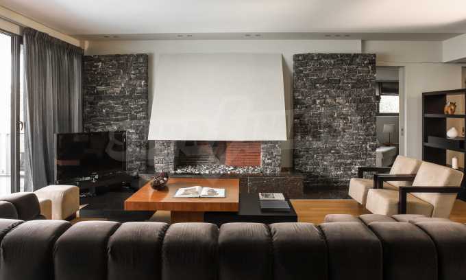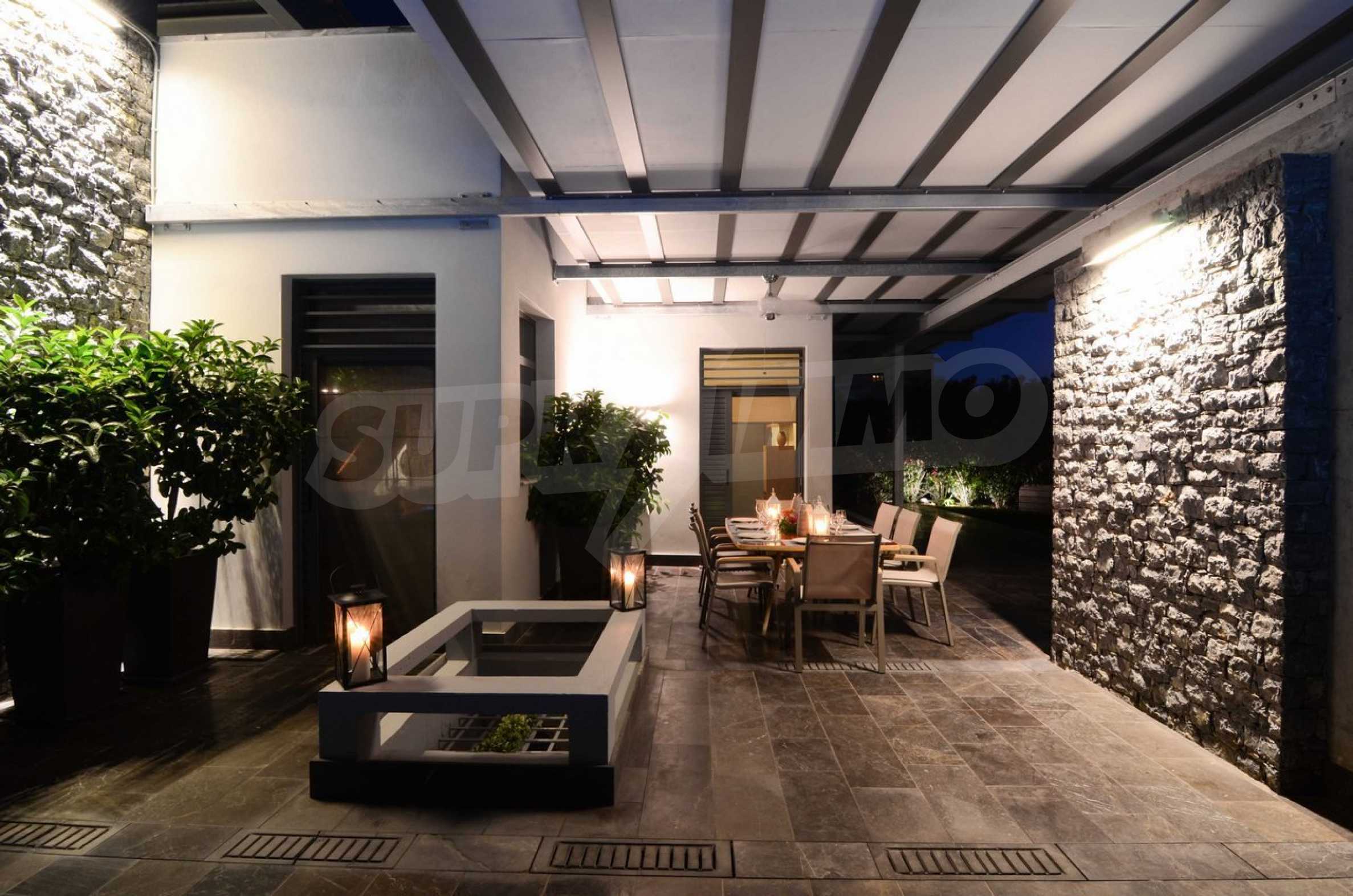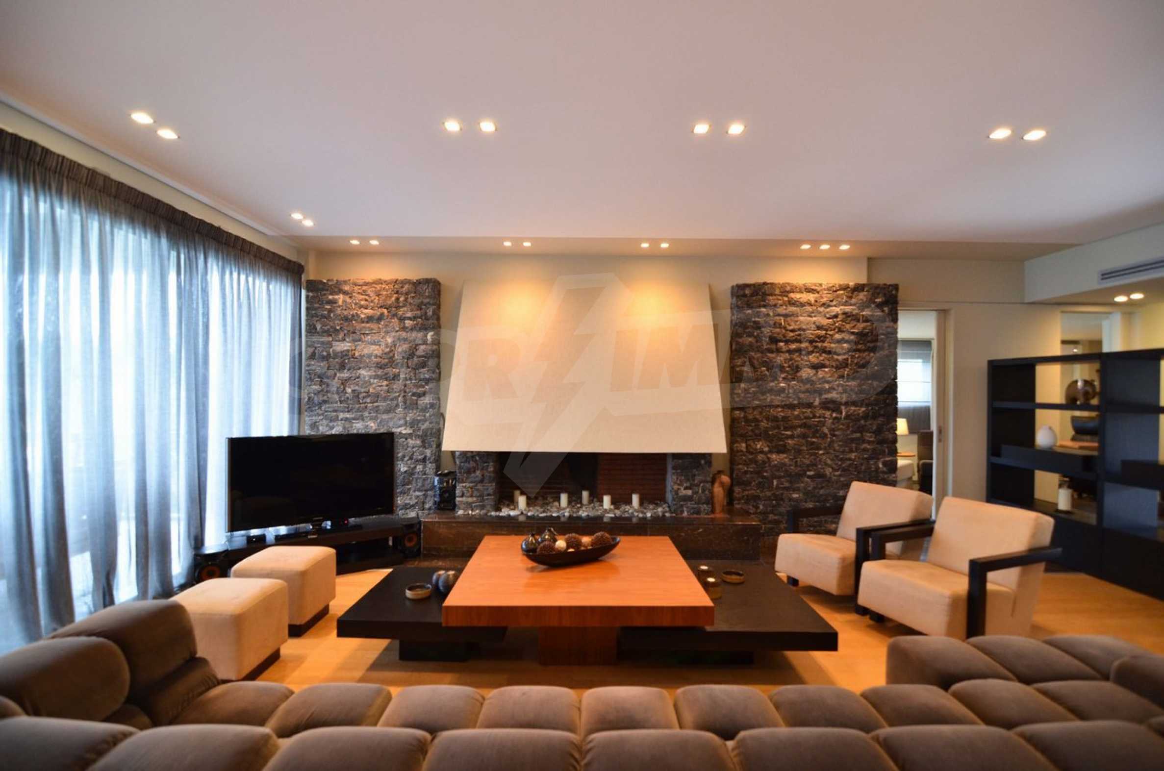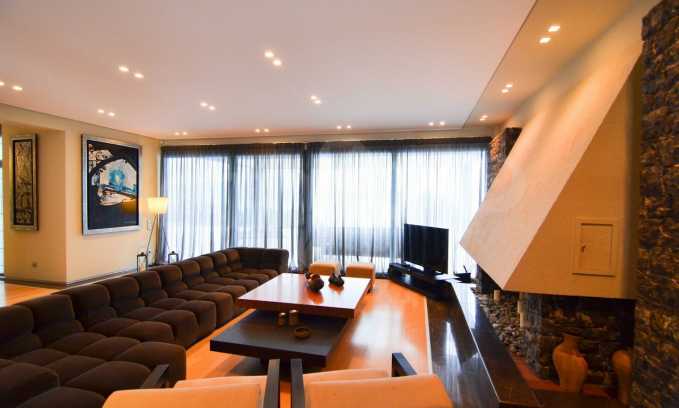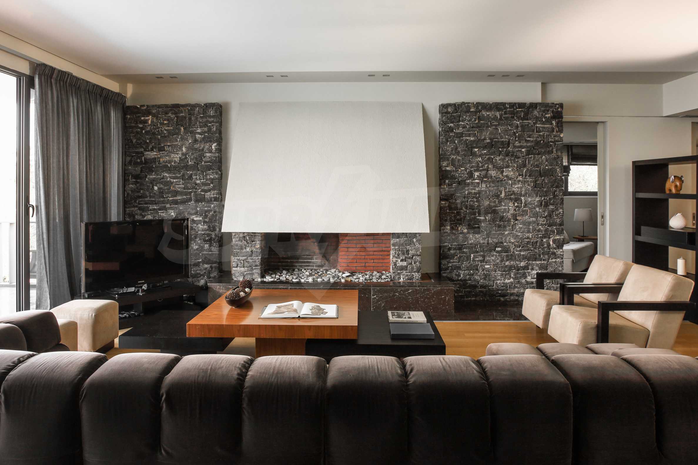On the first level of the villa there is a semi-autonomous apartment consisting of three large bedrooms (about 30sq. m. each), each with its own bathroom, and a living room (60sq. m.) with a view towards the yard. Also, there is a bar, fireplace and a kitchen. Depending on one’s needs, the kitchen, one bedroom and bathroom can be isolated without communicating with the rest of the house (in case needed for guests’ domestic staff).