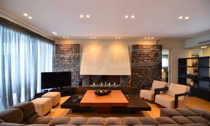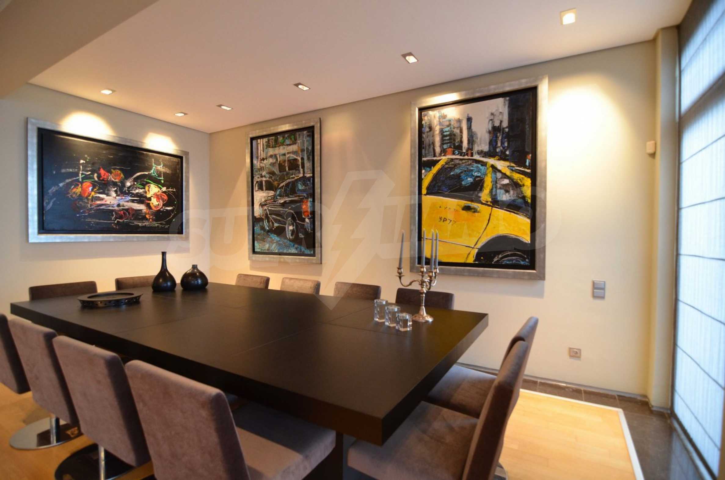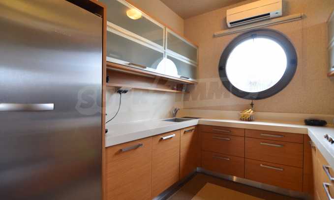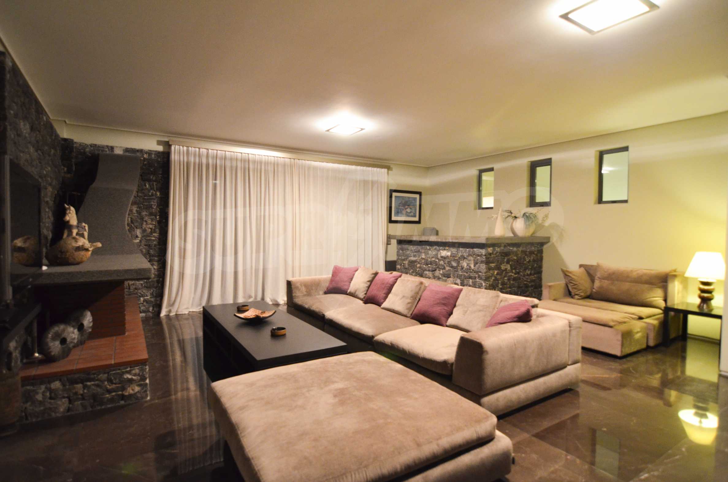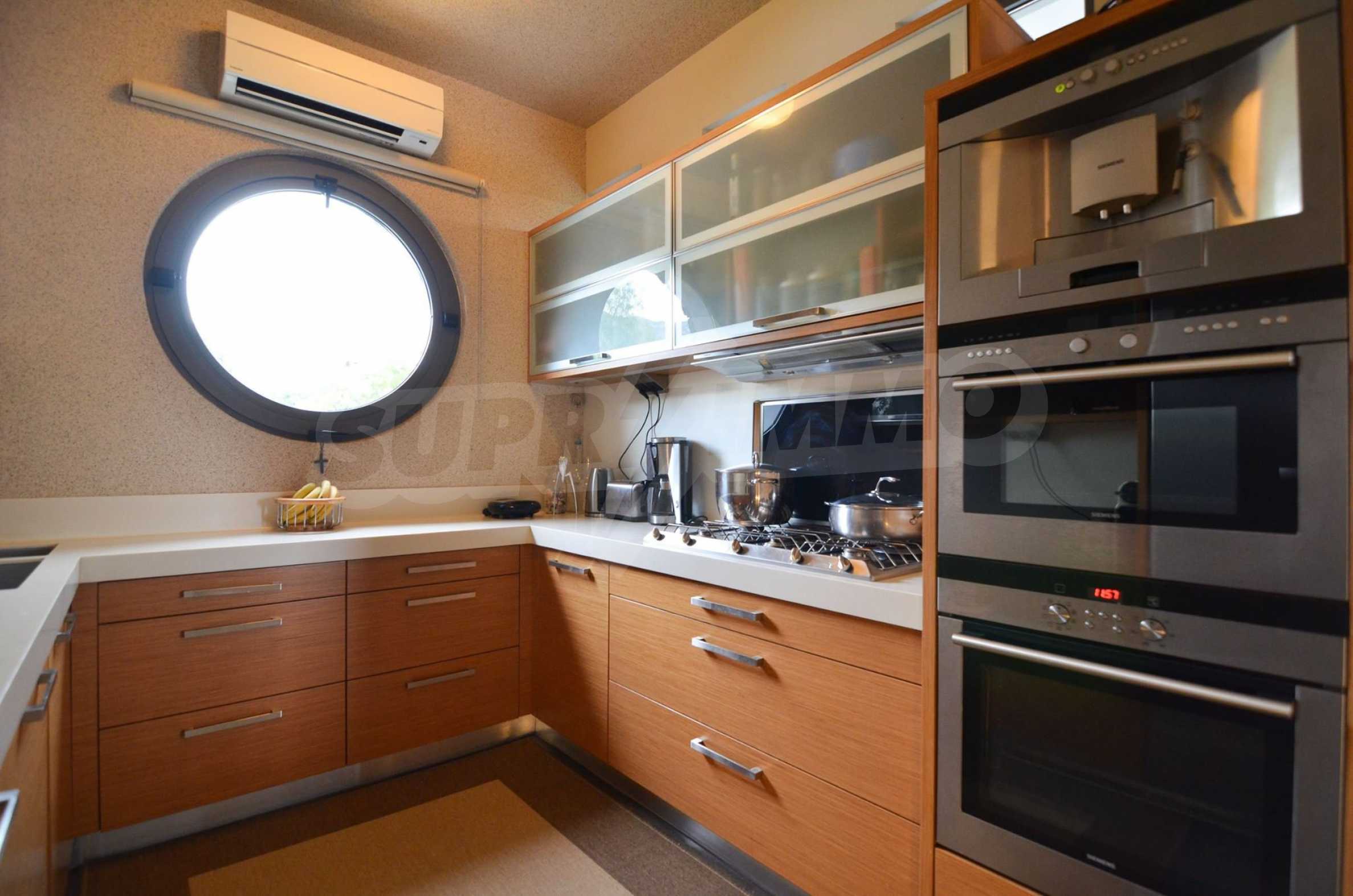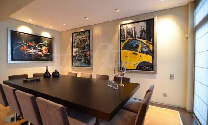 On the first level of the villa there is a semi-autonomous apartment consisting of three large bedrooms (about 30sq. m. each), each with its own bathroom, and a living room (60sq. m.) with a view towards the yard. Also, there is a bar, fireplace and a kitchen. Depending on one’s needs, the kitchen, one bedroom and bathroom can be isolated without communicating with the rest of the house (in case needed for guests’ domestic staff).