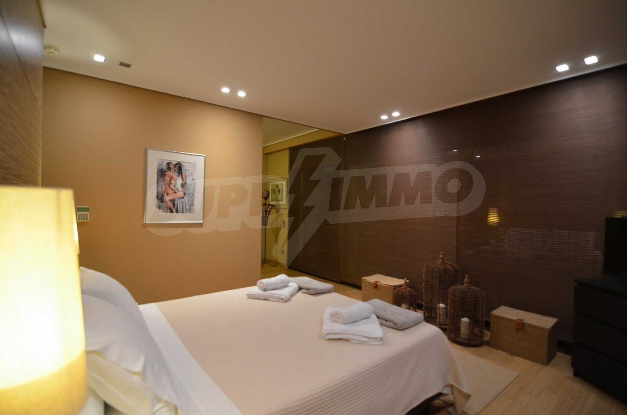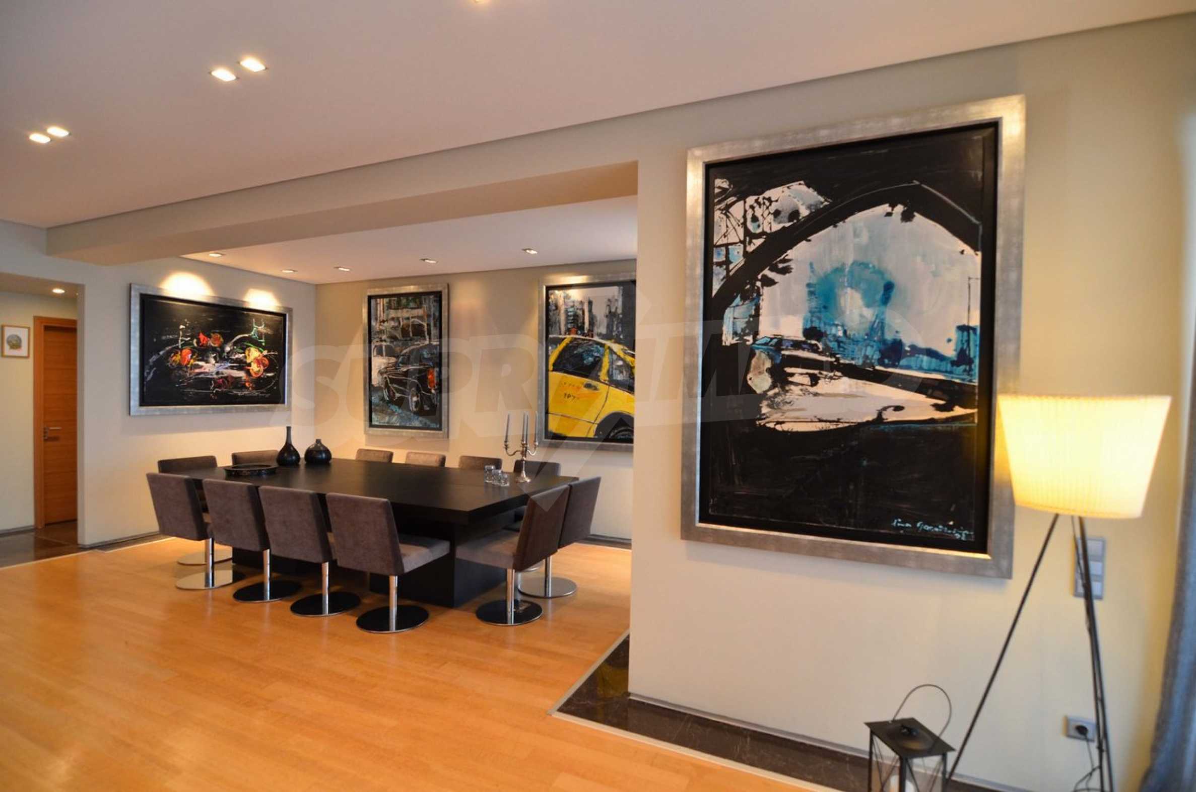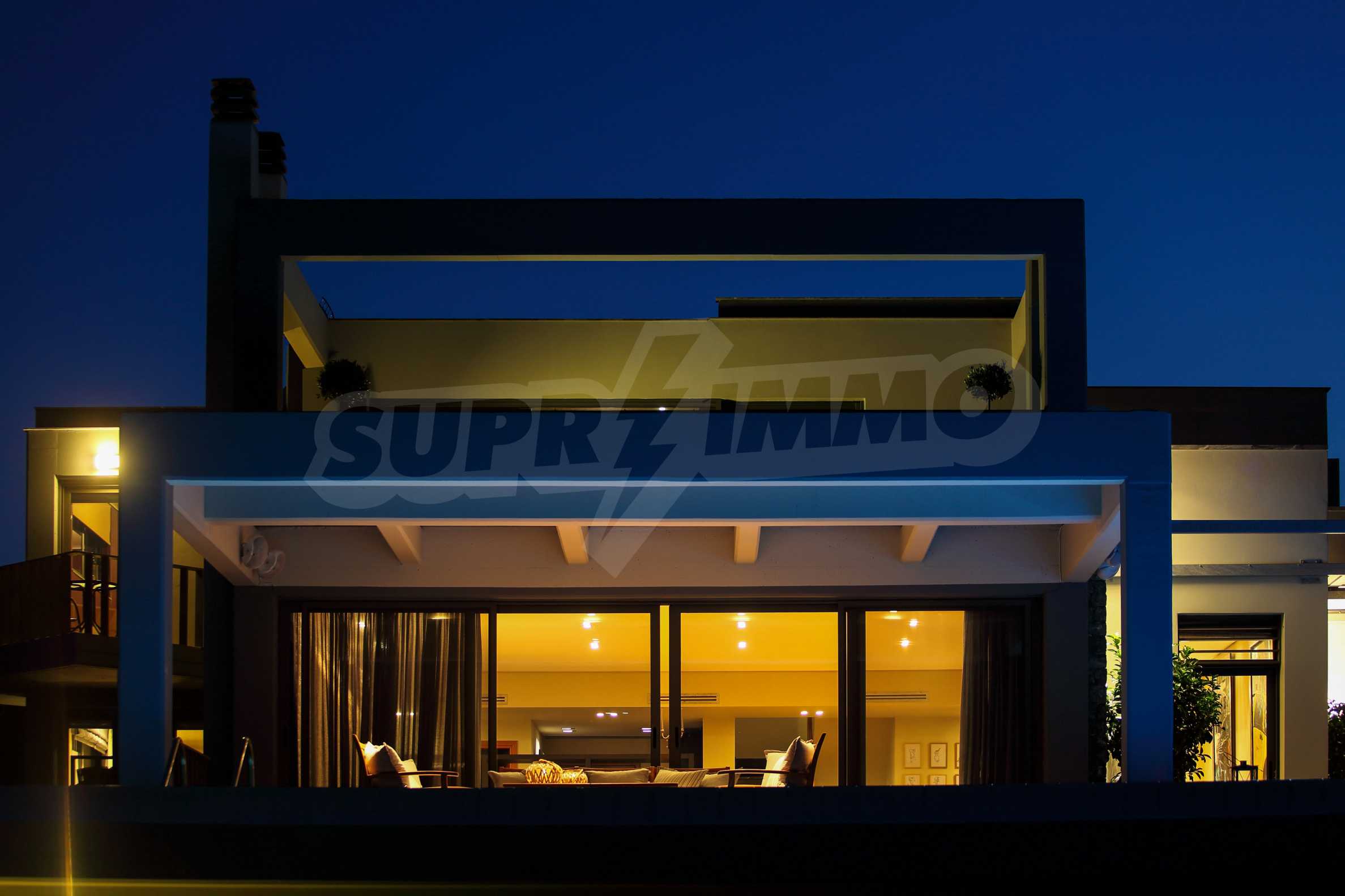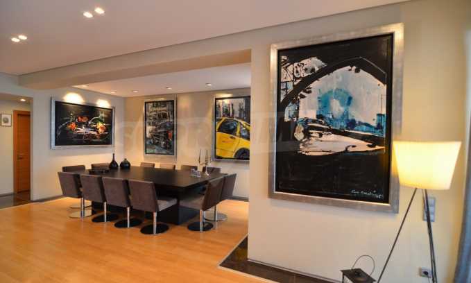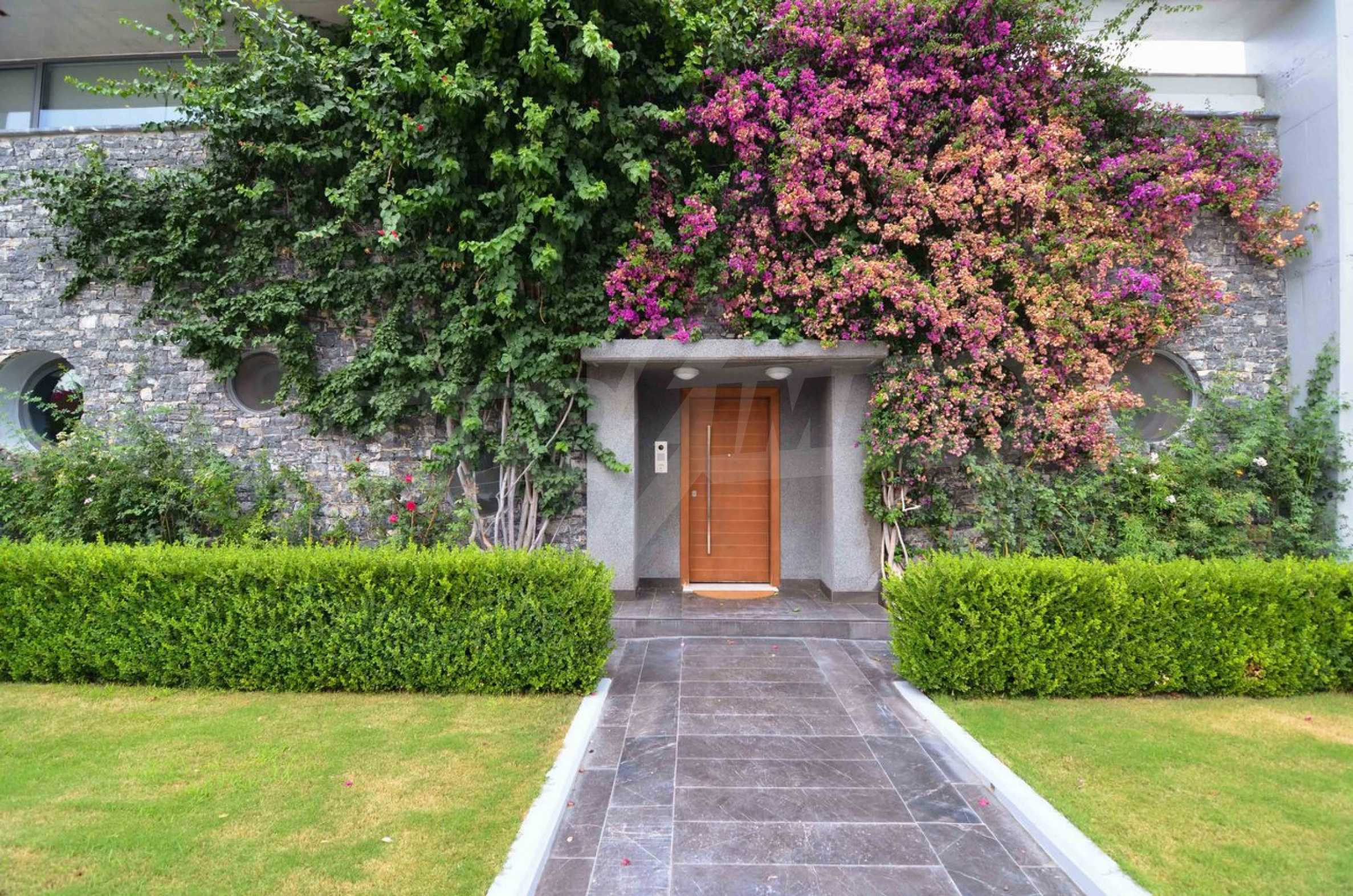 On the first level of the villa there is a semi-autonomous apartment consisting of three large bedrooms (about 30sq. m. each), each with its own bathroom, and a living room (60sq. m.) with a view towards the yard. Also, there is a bar, fireplace and a kitchen. Depending on one’s needs, the kitchen, one bedroom and bathroom can be isolated without communicating with the rest of the house (in case needed for guests’ domestic staff).