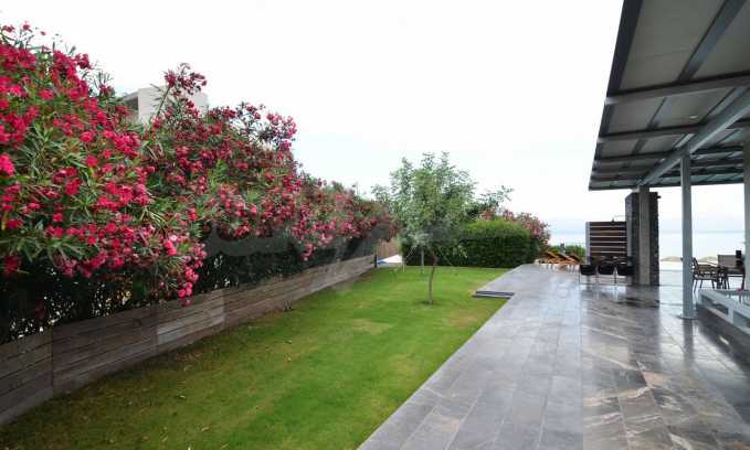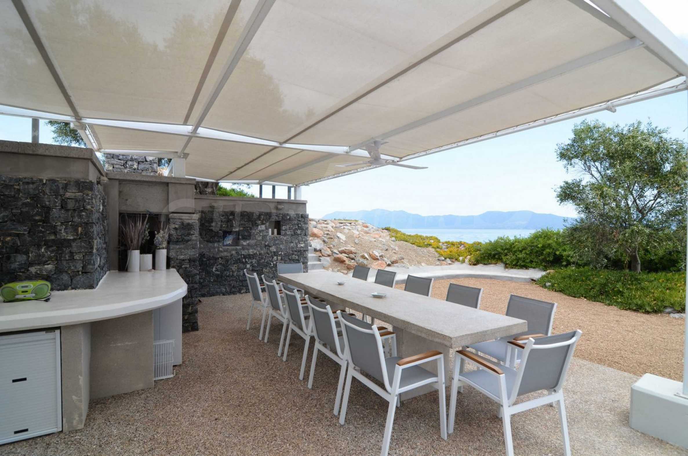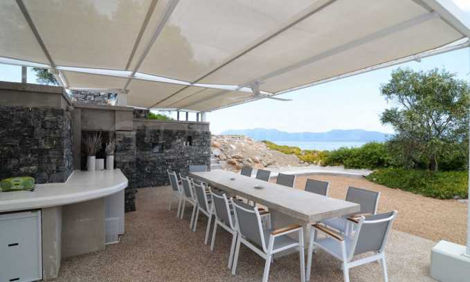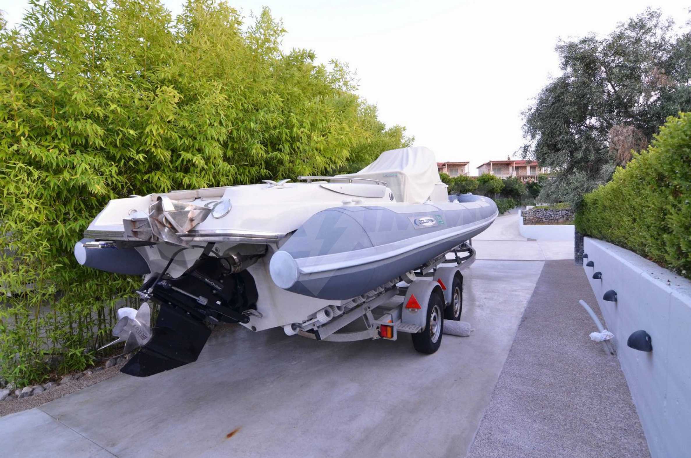Air conditioning everywhere, central heating, security system with security front doors, satellite dish, wifi. The surrounding environment has a swimming pool with sun deck and arm chairs, an outside porch with couches right over the pool and with a view to the sea. A small football field lies right under the pool and below that a private beach with sand and arm chairs to enjoy. There is a BBQ right by the beach with its own shaded dining table. Two speed boats rest nearby ready to embark on fishing trips or ski sessions. This is a superb villa, modern in every aspect and it is our recommendation for a quality beachfront purchase.