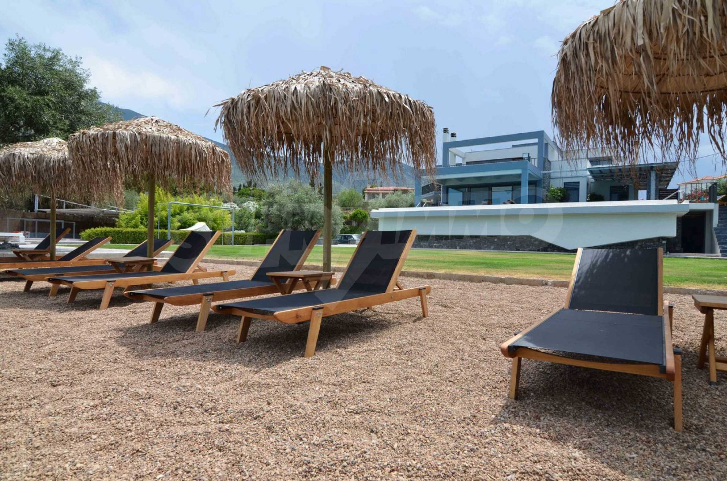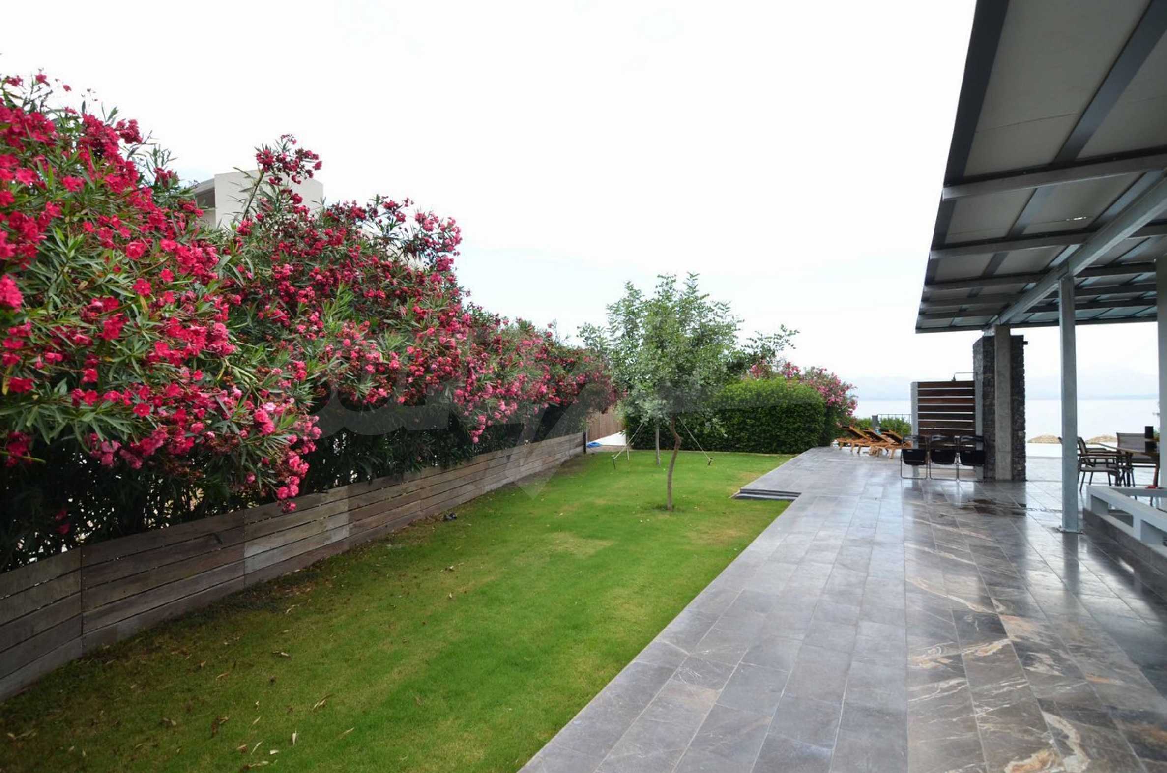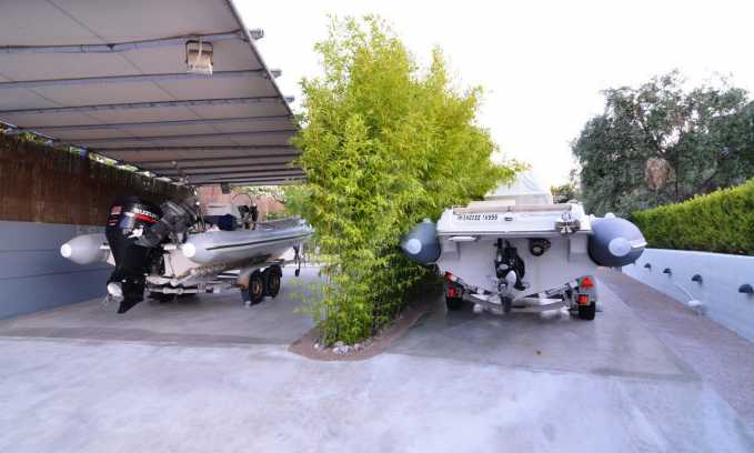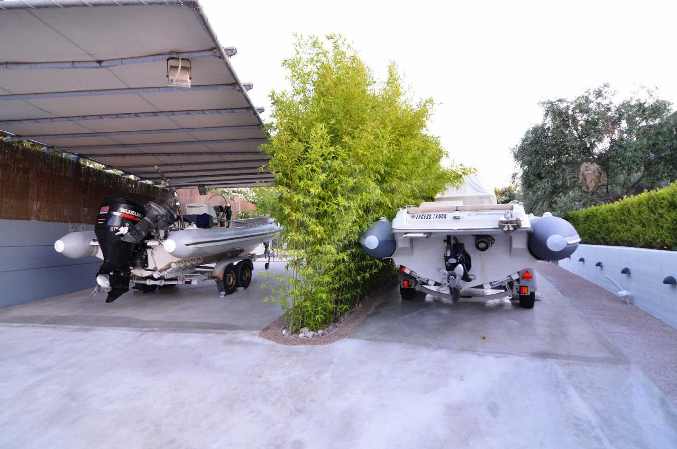 Air conditioning everywhere, central heating, security system with security front doors, satellite dish, wifi. The surrounding environment has a swimming pool with sun deck and arm chairs, an outside porch with couches right over the pool and with a view to the sea. A small football field lies right under the pool and below that a private beach with sand and arm chairs to enjoy. There is a BBQ right by the beach with its own shaded dining table. Two speed boats rest nearby ready to embark on fishing trips or ski sessions. This is a superb villa, modern in every aspect and it is our recommendation for a quality beachfront purchase.