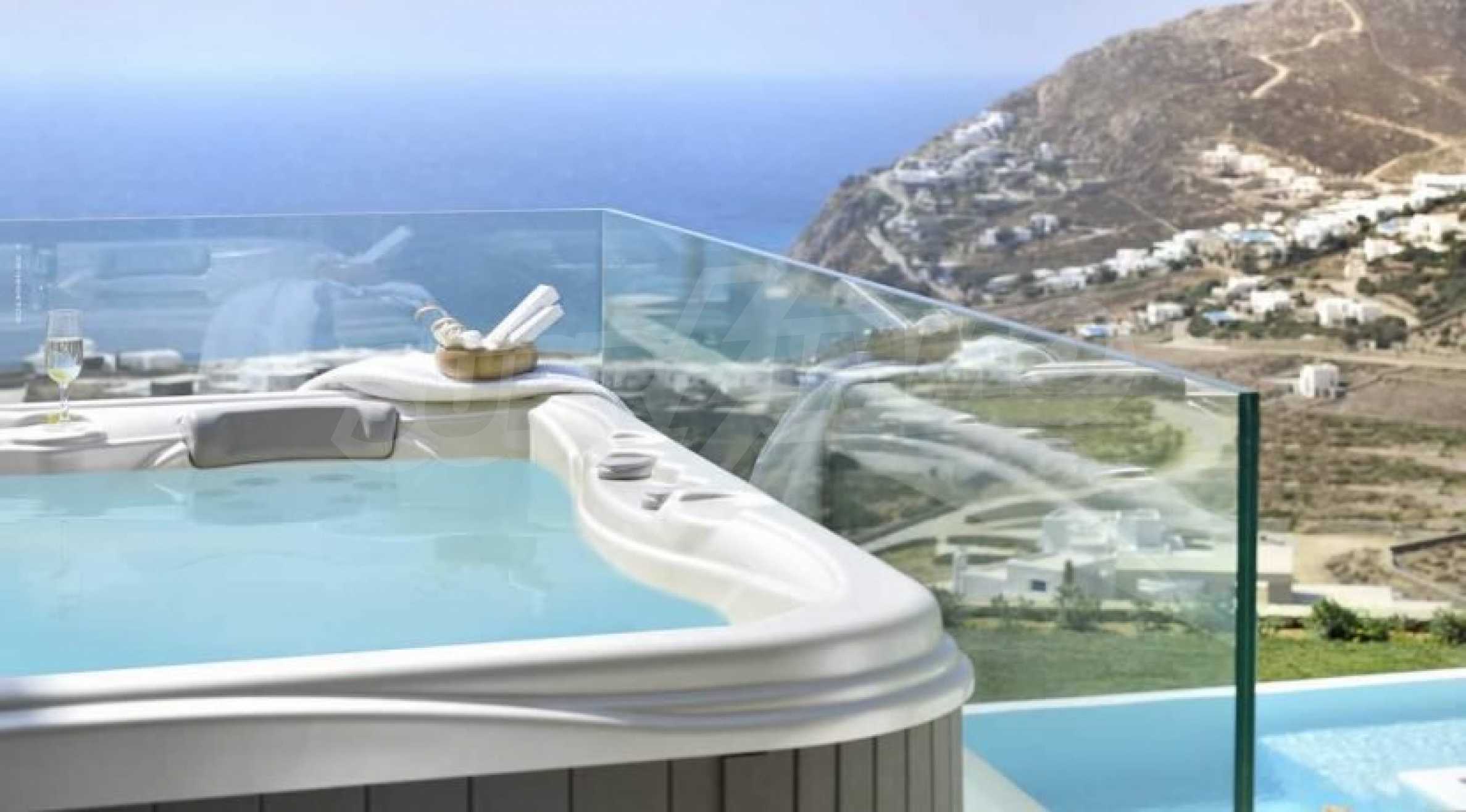 We offer you this villa with a total area of 308 m2. It was constructed in 2012. The property has air-conditioners and fireplace. Aluminium window frames, interior doors, painted walls, parquet flooring and solid walls are available in the property. The property is connected to electricity and water. Some of the other available facilities that you will certainly consider important include: a balcony, a bathroom with toilet, a parking space, a toilet, a veranda, a jacuzzi, a swimming pool, internet and a wi-fi. From the inside you will be able to enjoy wonderful bay views, beach views, sea views, swimming pool views and views to inner garden.