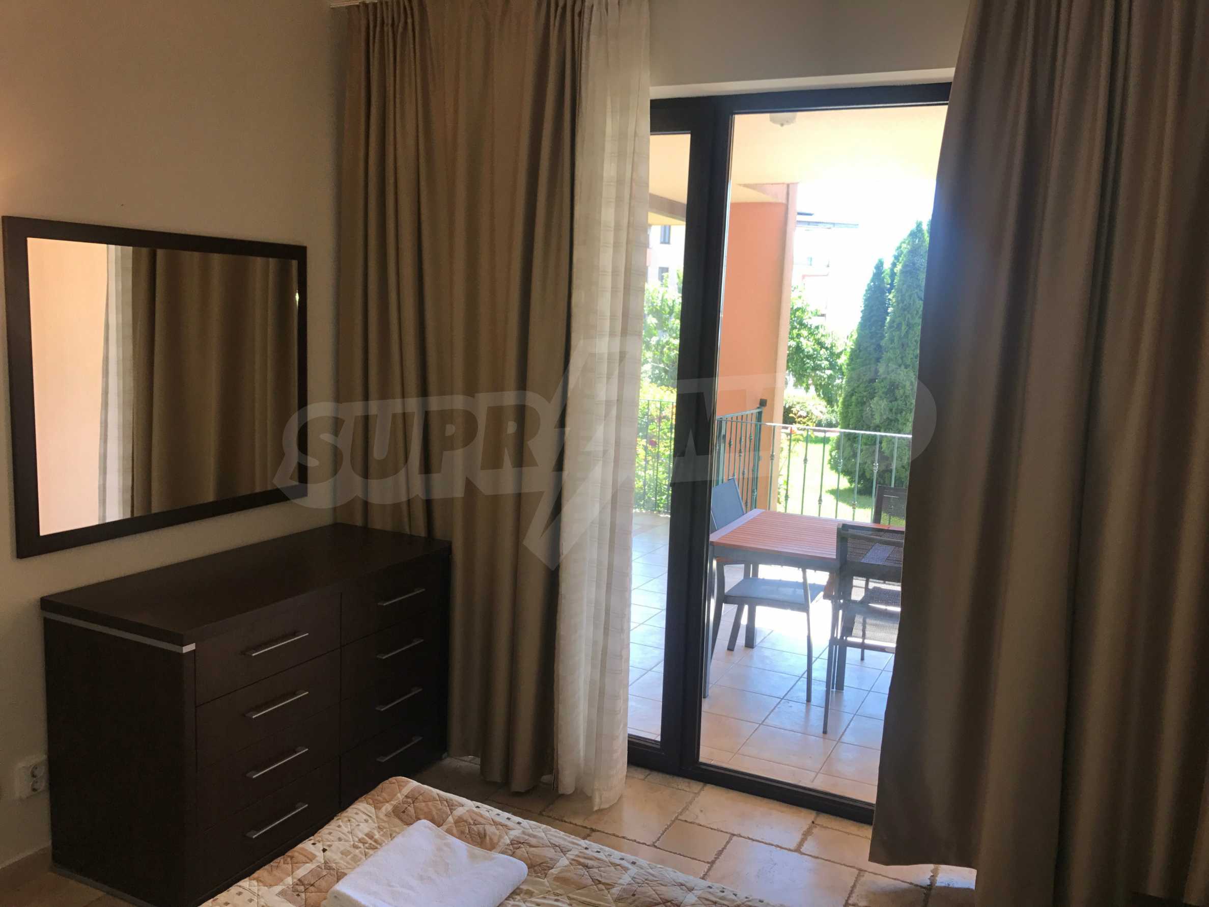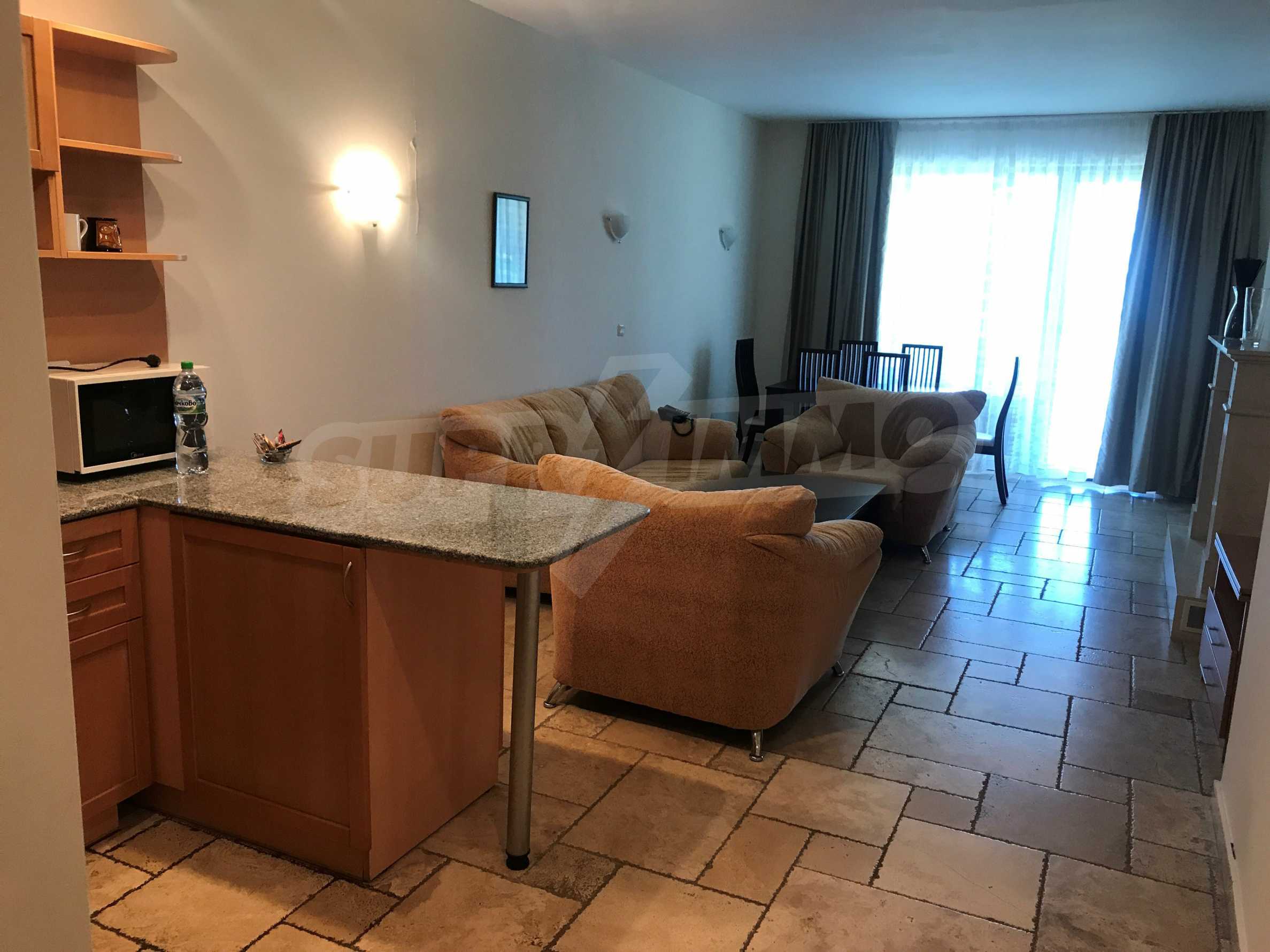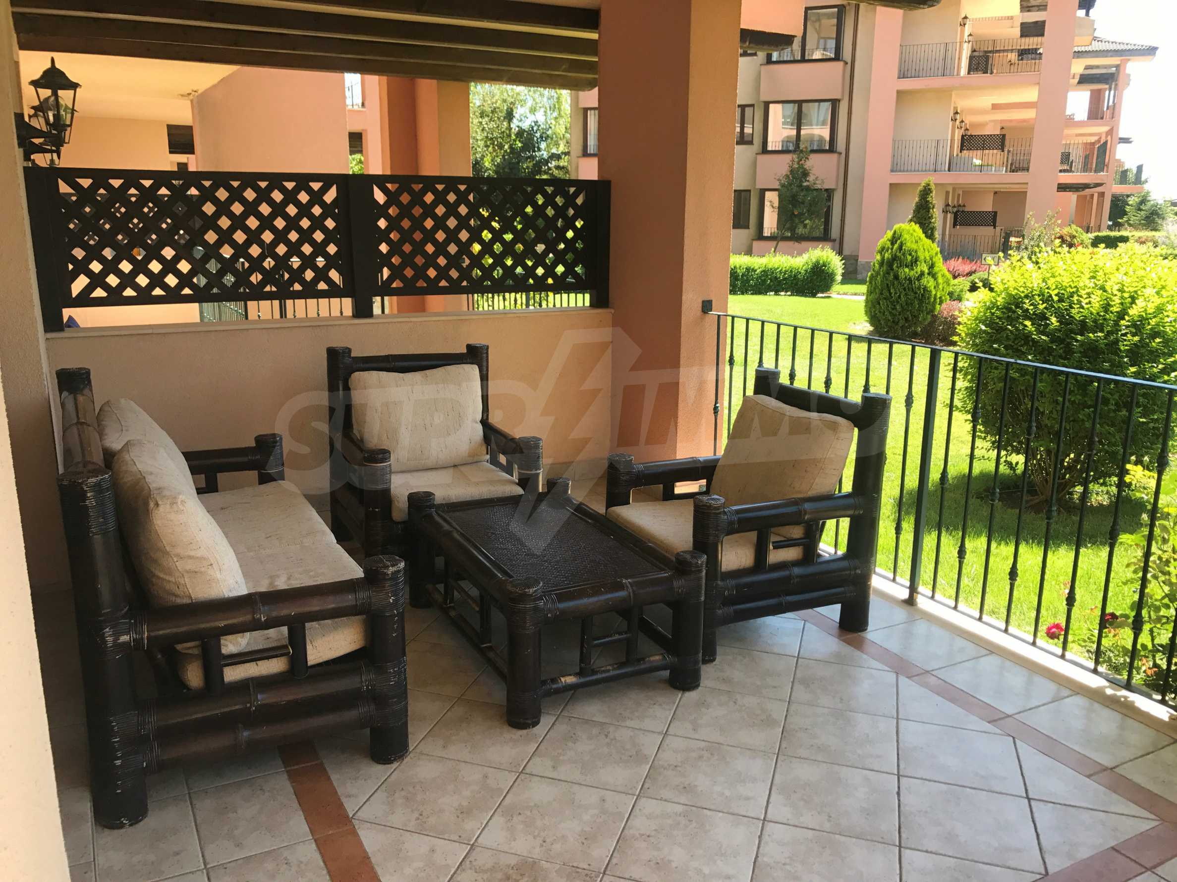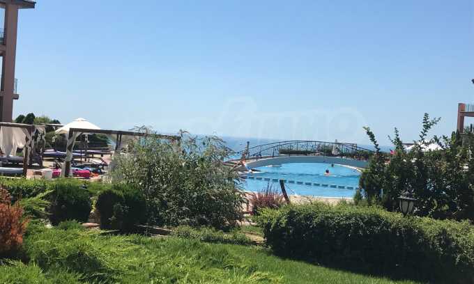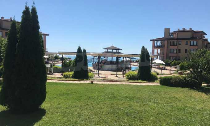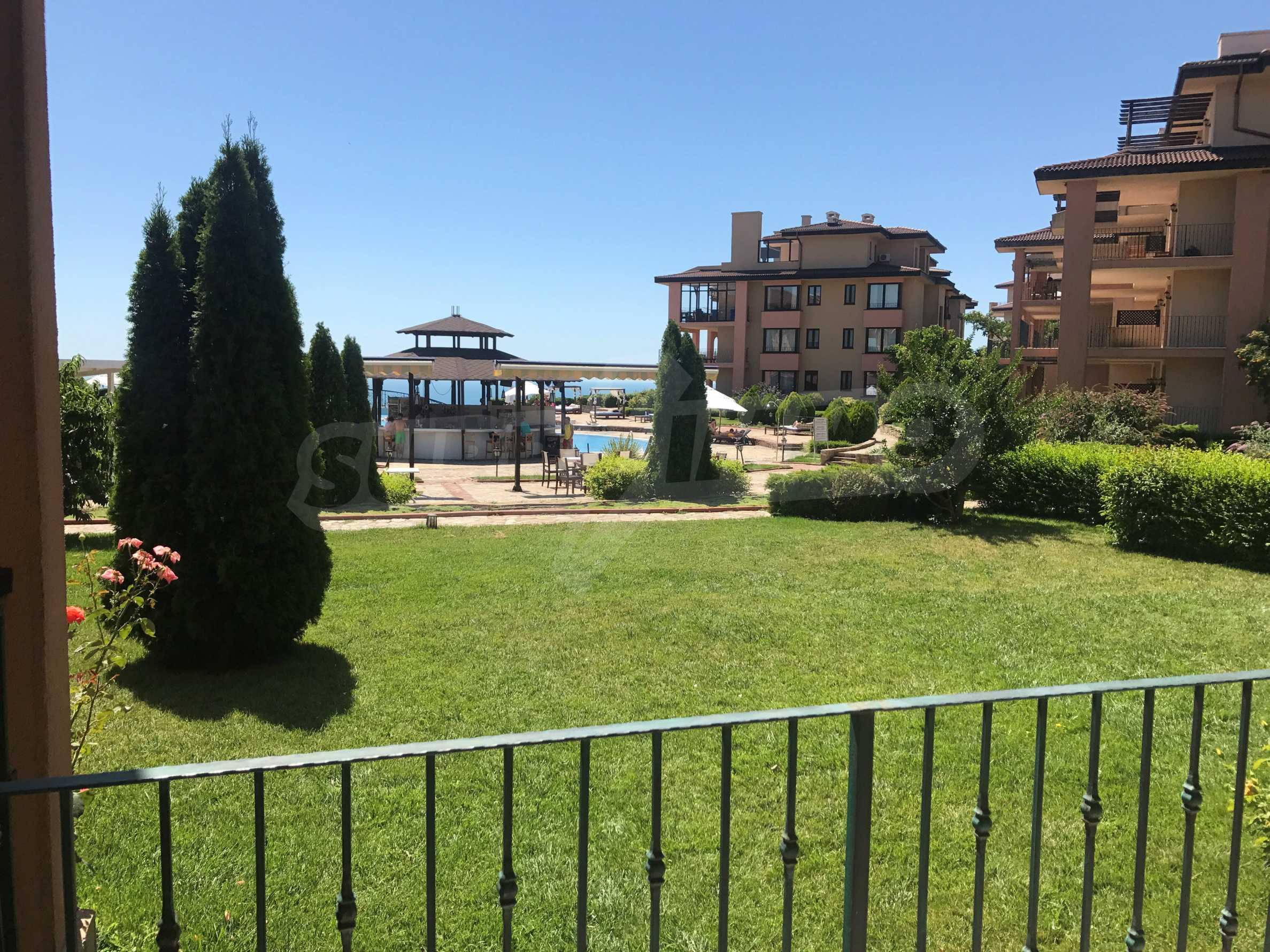 This 2-bedroom apartment is in the prime location - overlooking the Black Sea, the resort and Thracian Cliffs Golf. It has a total size of 120.64 sq.m, composed of two separate bedrooms, two bathroom/WCs, living room with open plan kitchen and fireplace, a corridor and a terrace. The apartment is offered for sale fully furnished with all ready-to-live amenities. It benefits of a large balcony where you can enjoy open-air dinner with direct view to the sea and the swimming pool.