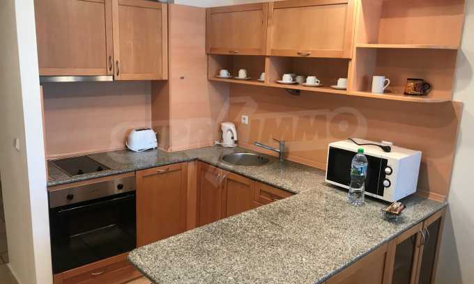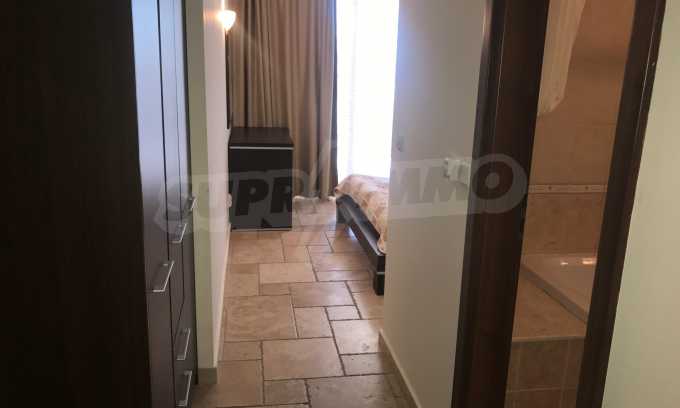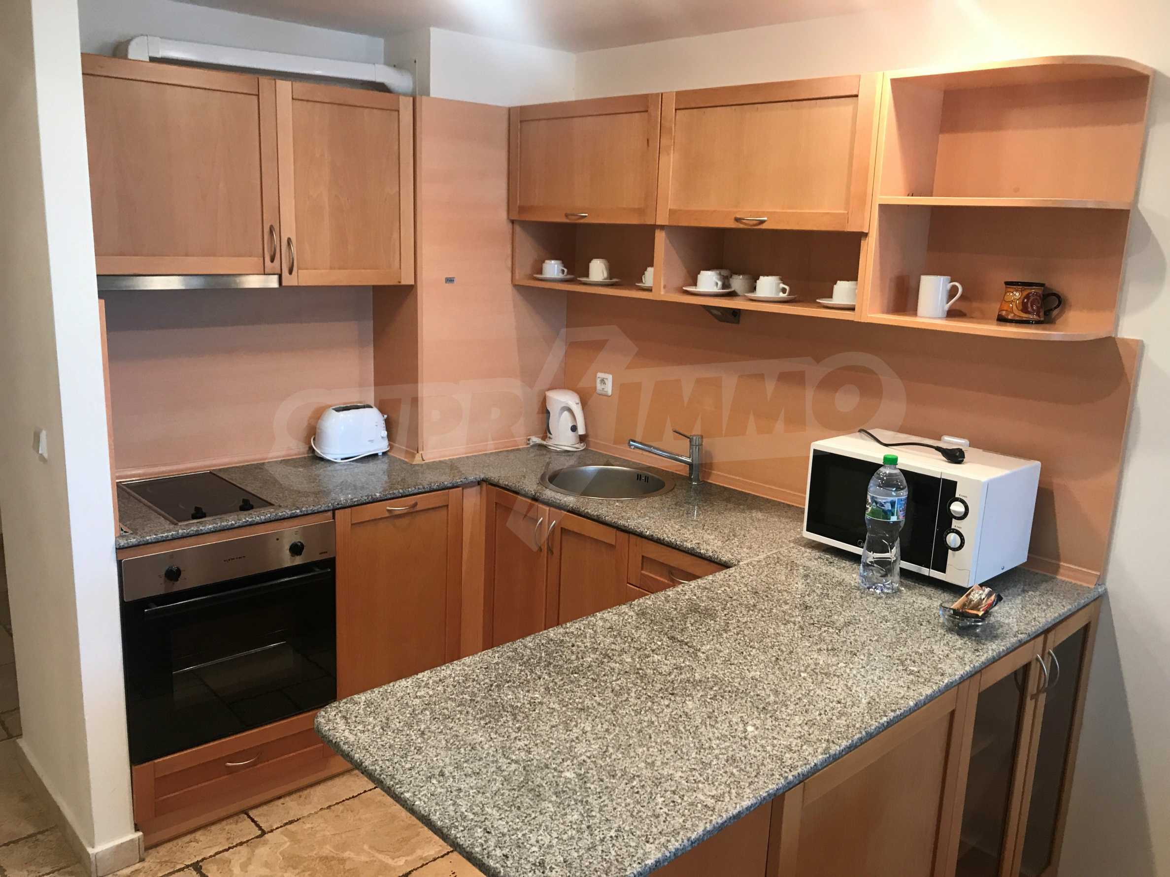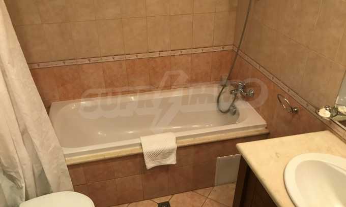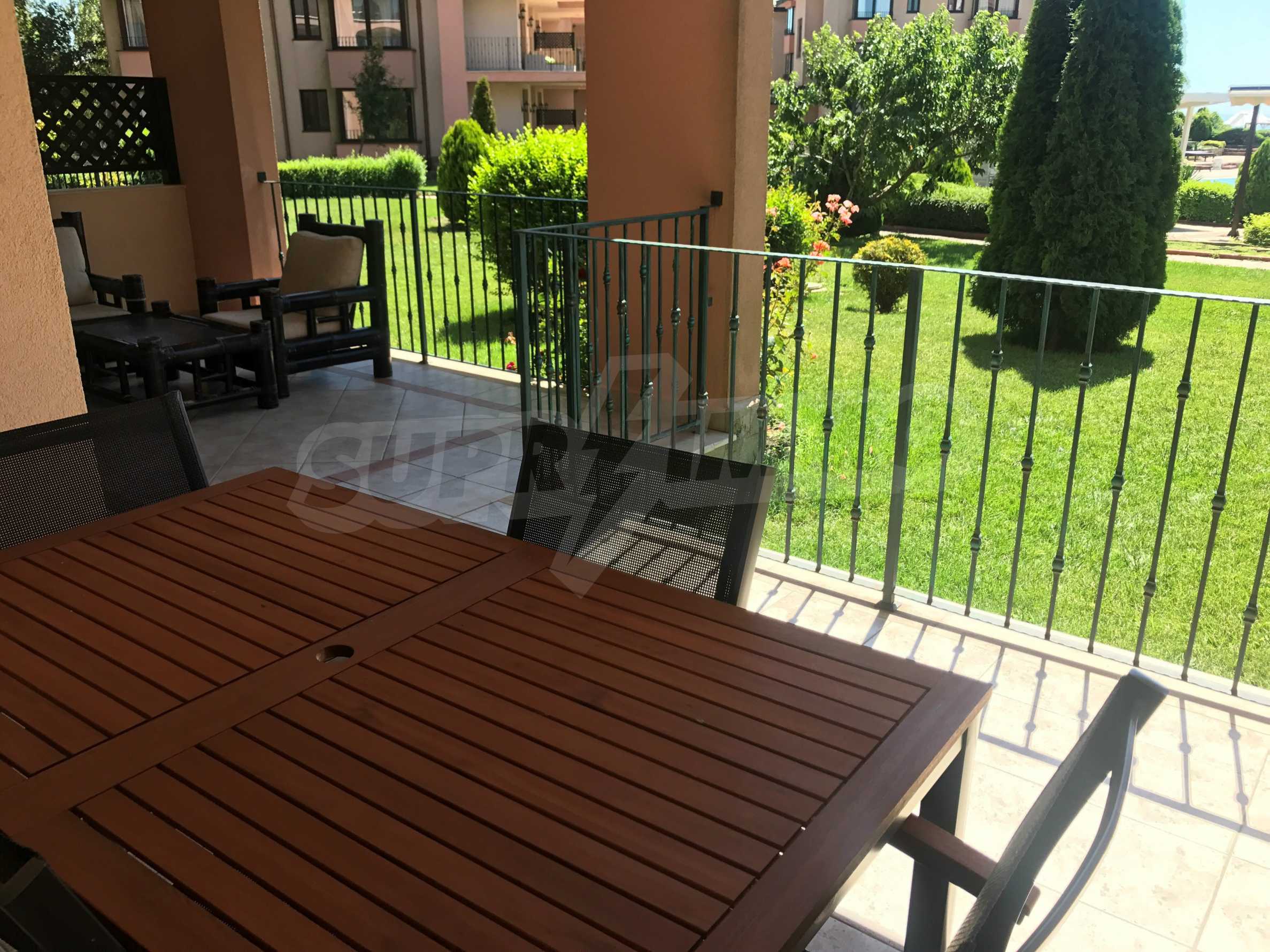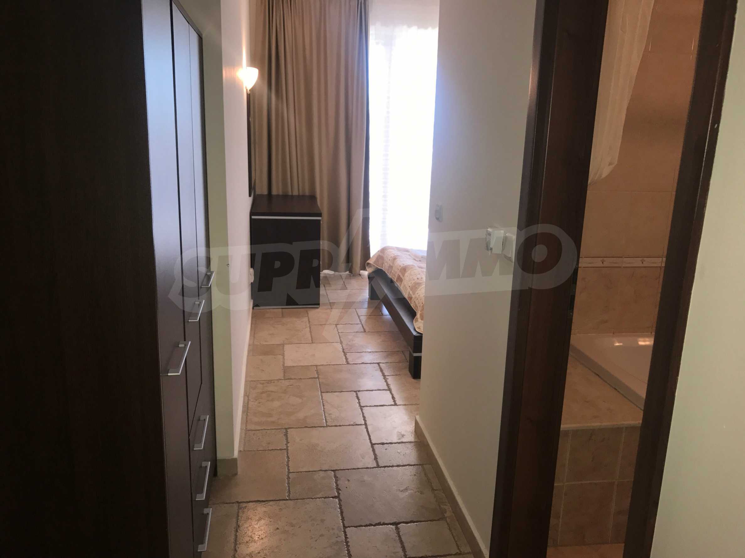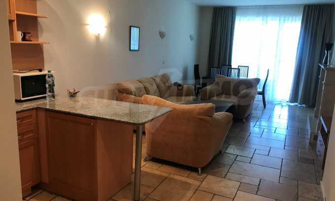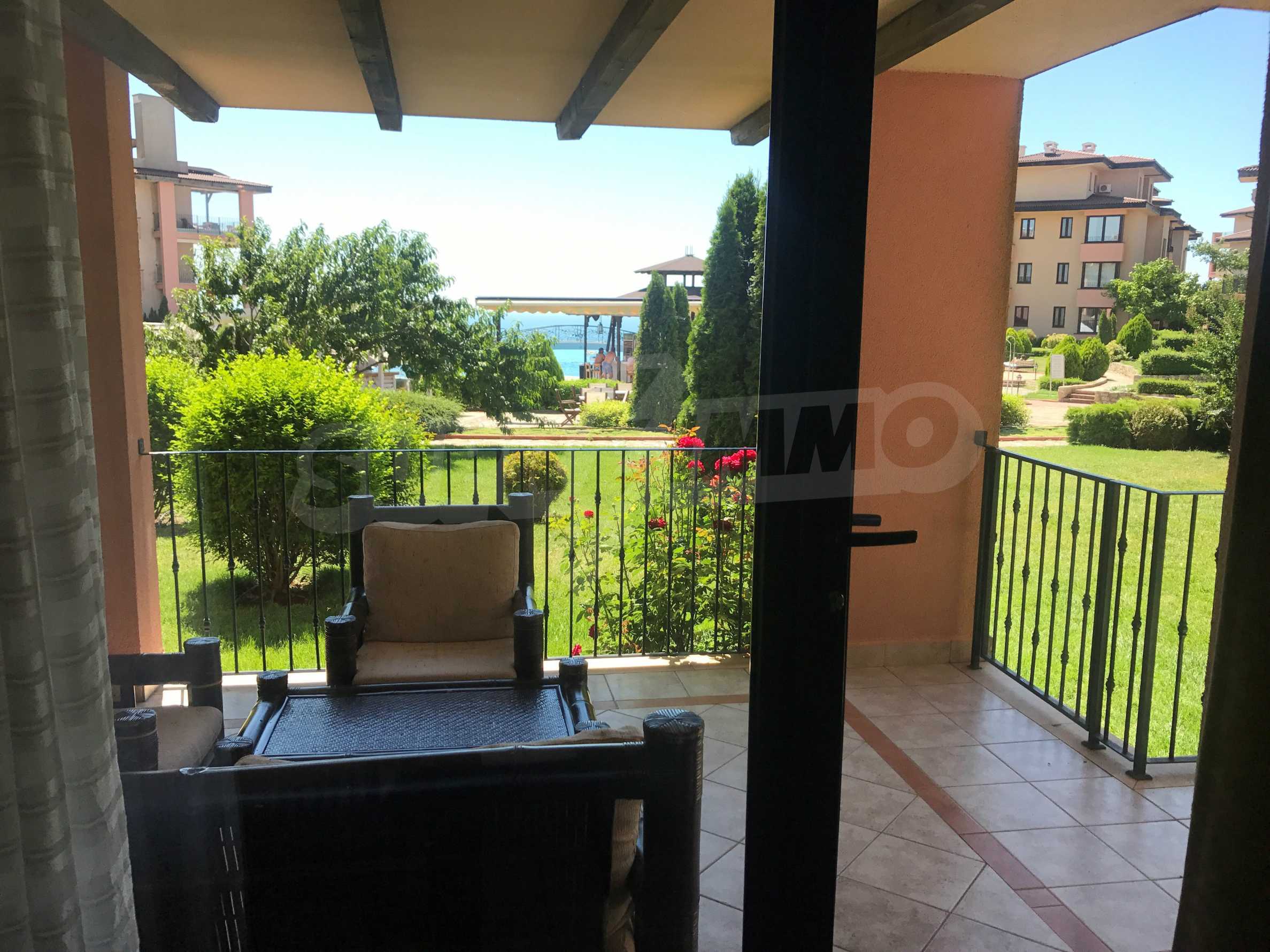 This 2-bedroom apartment is in the prime location - overlooking the Black Sea, the resort and Thracian Cliffs Golf. It has a total size of 120.64 sq.m, composed of two separate bedrooms, two bathroom/WCs, living room with open plan kitchen and fireplace, a corridor and a terrace. The apartment is offered for sale fully furnished with all ready-to-live amenities. It benefits of a large balcony where you can enjoy open-air dinner with direct view to the sea and the swimming pool.