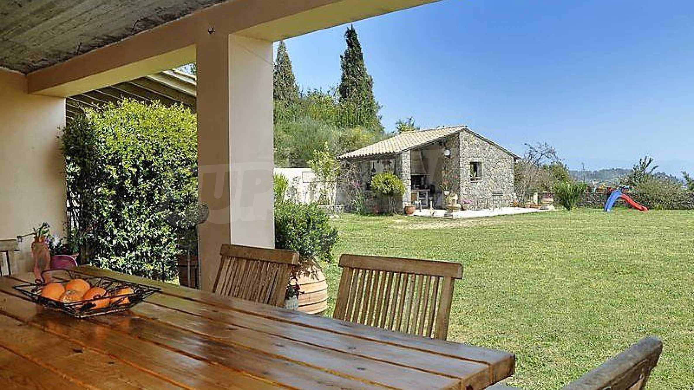 We are happy to present you this magnetic villa- located just a short drive from Corfu town, the airport and nearby beaches. The main house is a total of 383sqm and is arranged upon 2 floors. The ground floor, comprises of a large living room with a capacity of over 12 people, with a large handcrafted fireplace, a small wc, a large kitchen with fireplace and utility room with a staircase leading to the basement garage. All rooms have plenty of storage space and views of the garden. The property also features a two bedroom, one bathroom apartment with a large veranda overlooking the garden. The land is a total of 2700sqm, the garden is lawned and has a large stone BBQ area, for outdoor dining.