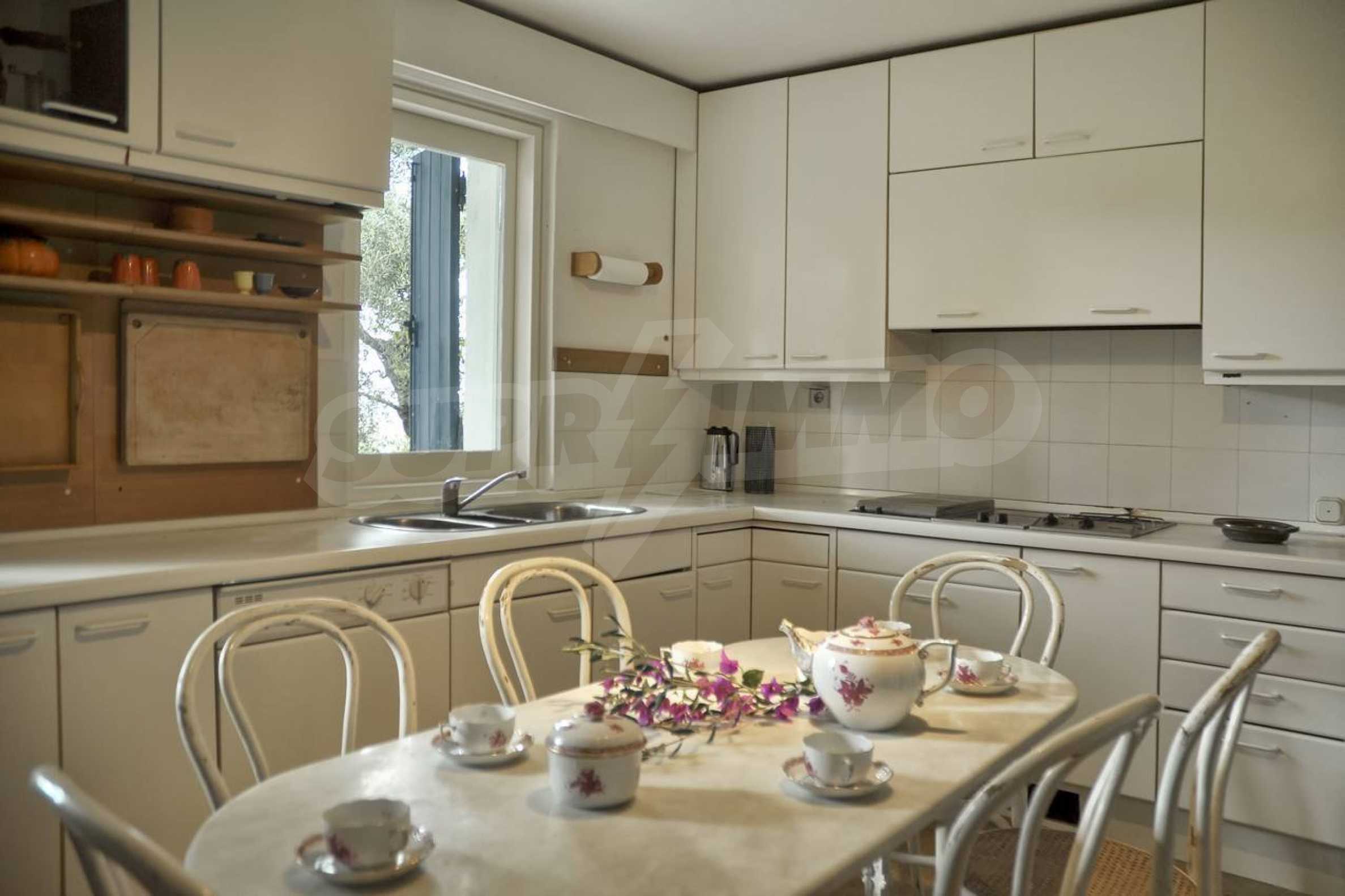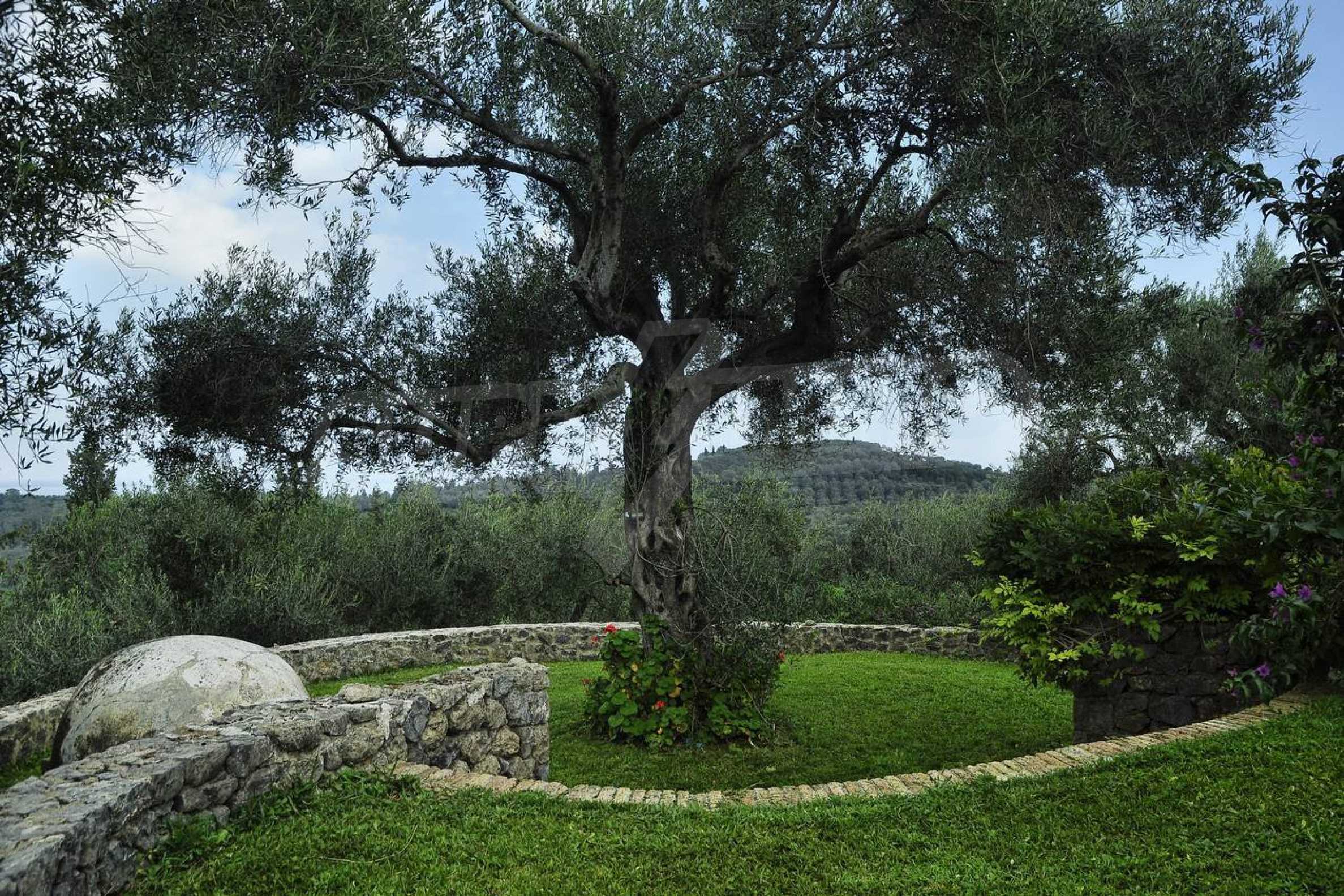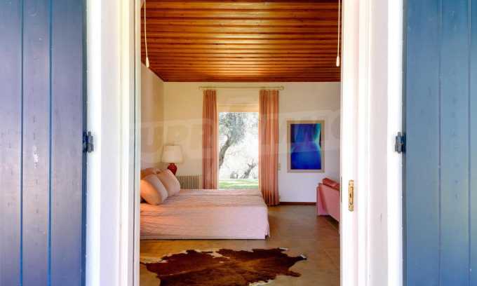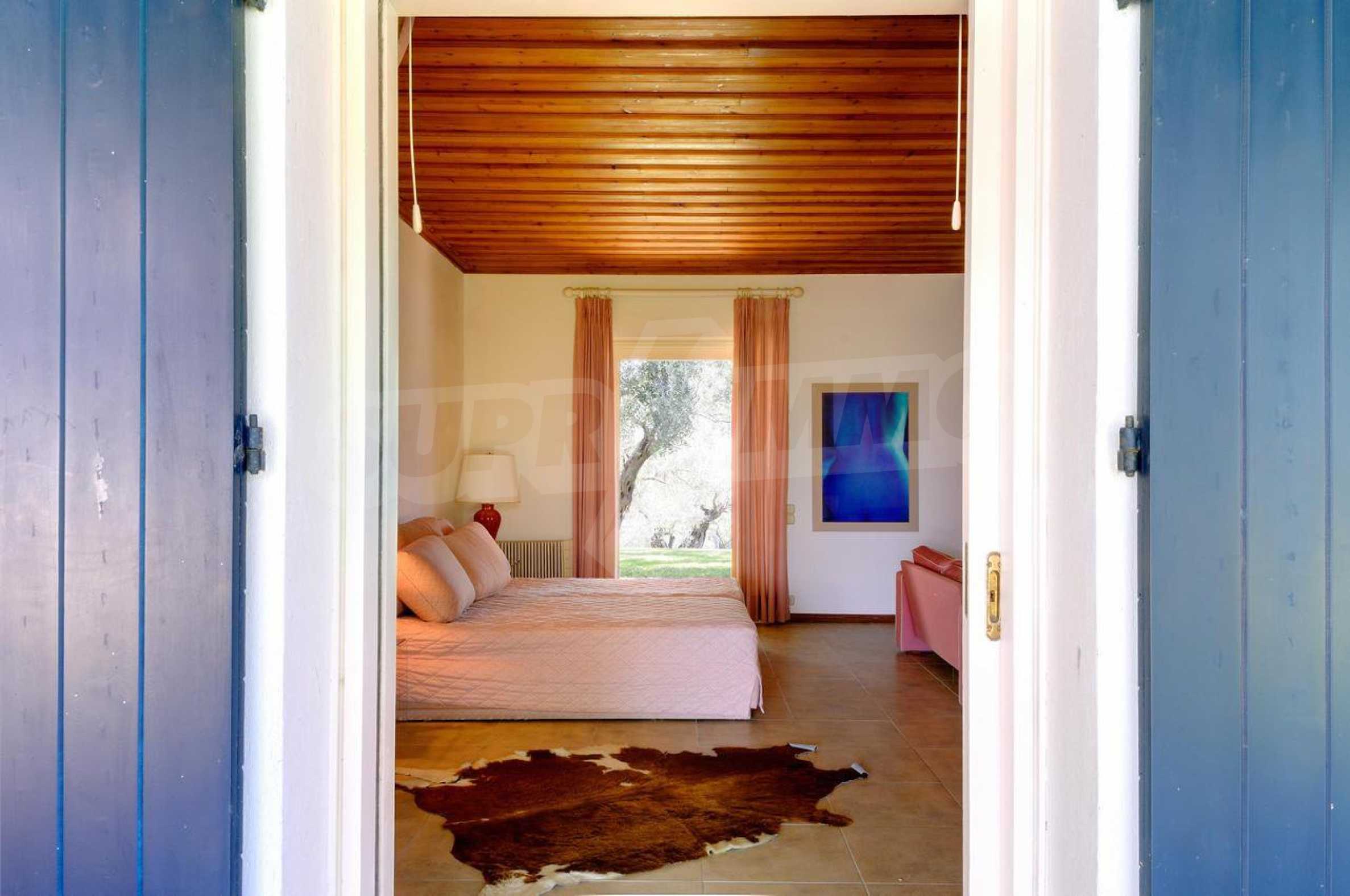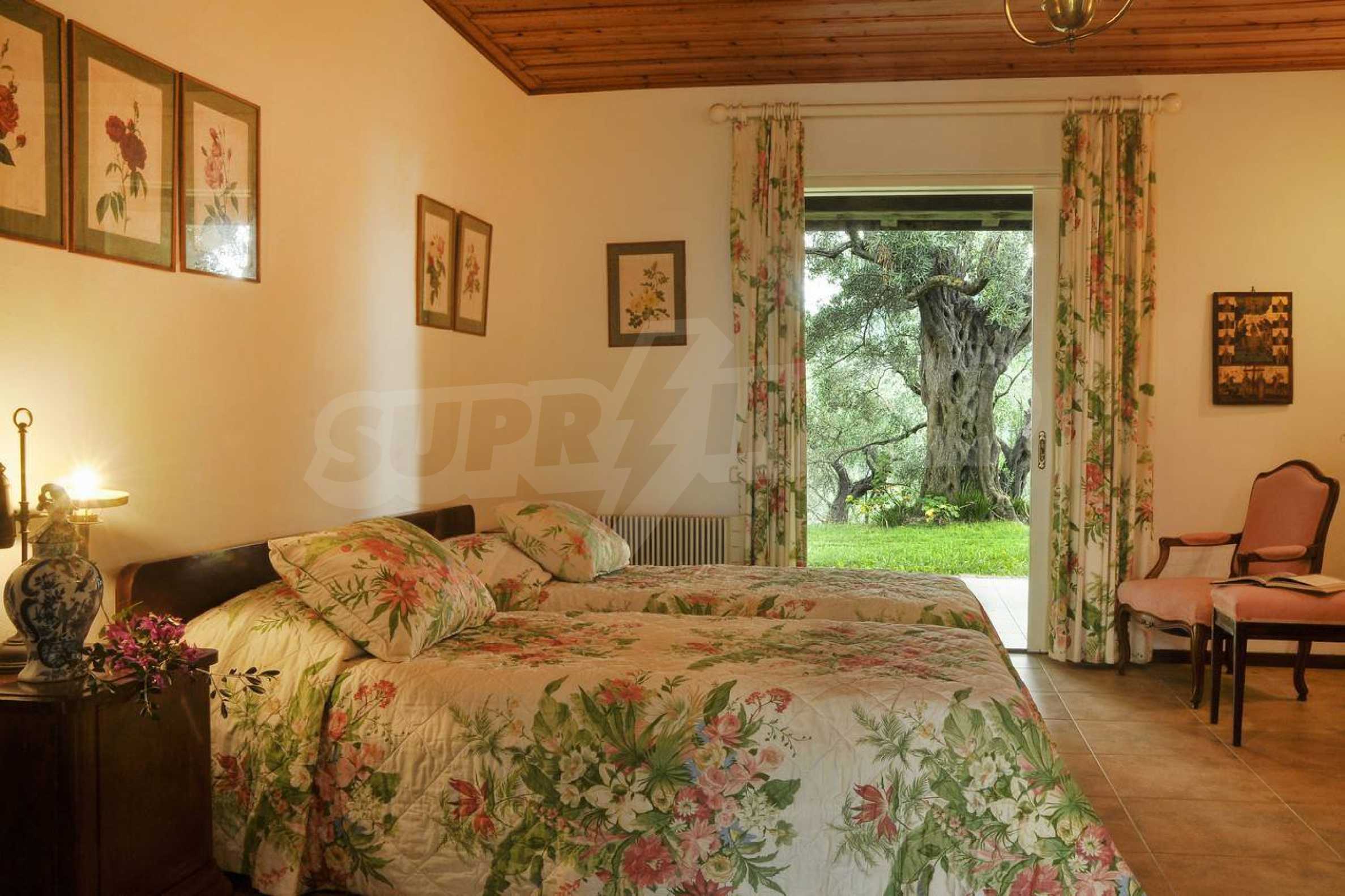 Set amonst the greenery, at the end of a private, shaded driveway, this house boasts peace and tranquility making it the perfect hideaway. The whole property is fenced and gated and set in a lovely position on top of a hill 25km south of Corfu Town with lovely views across the countryside to the sea.