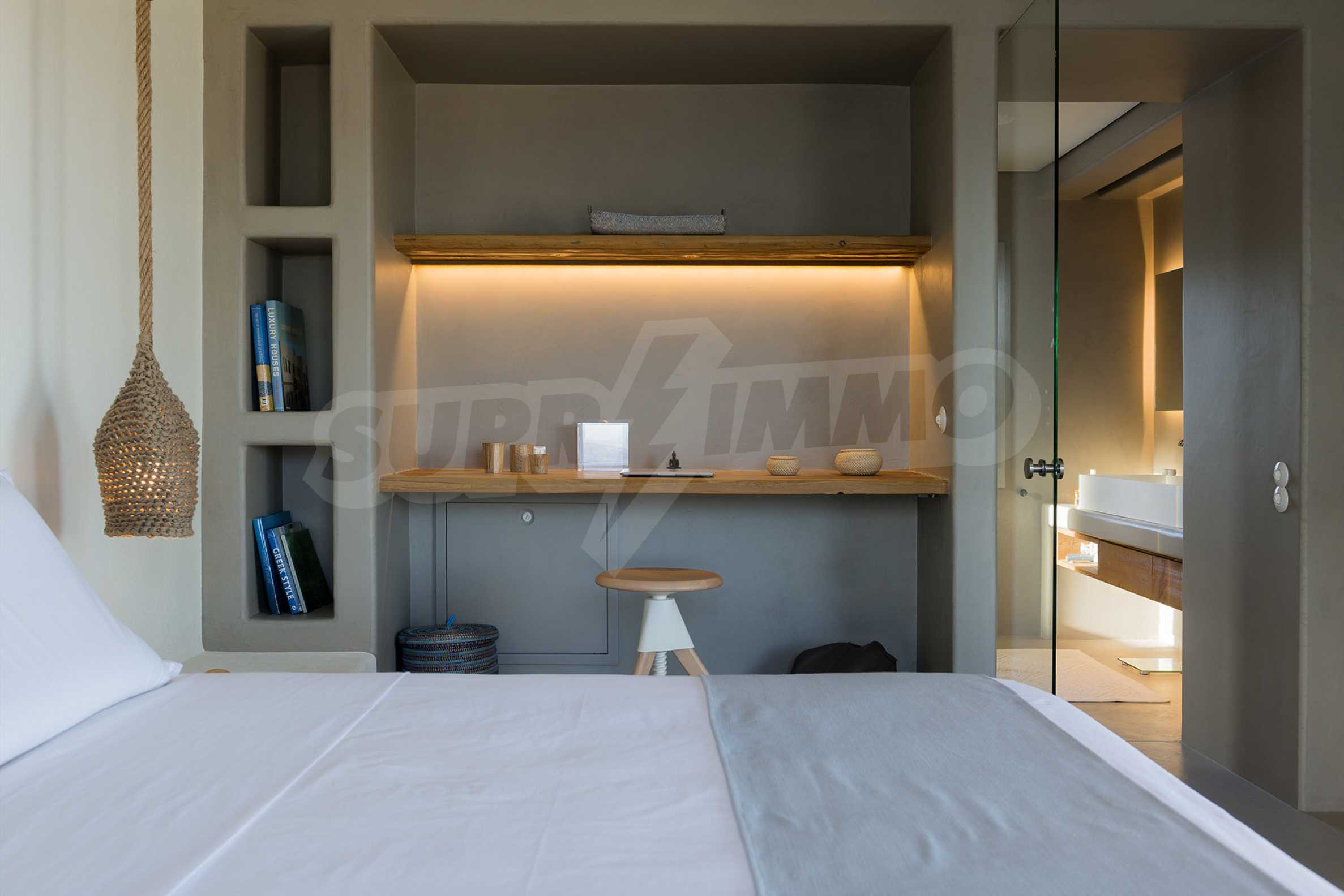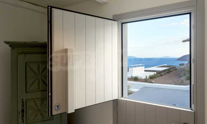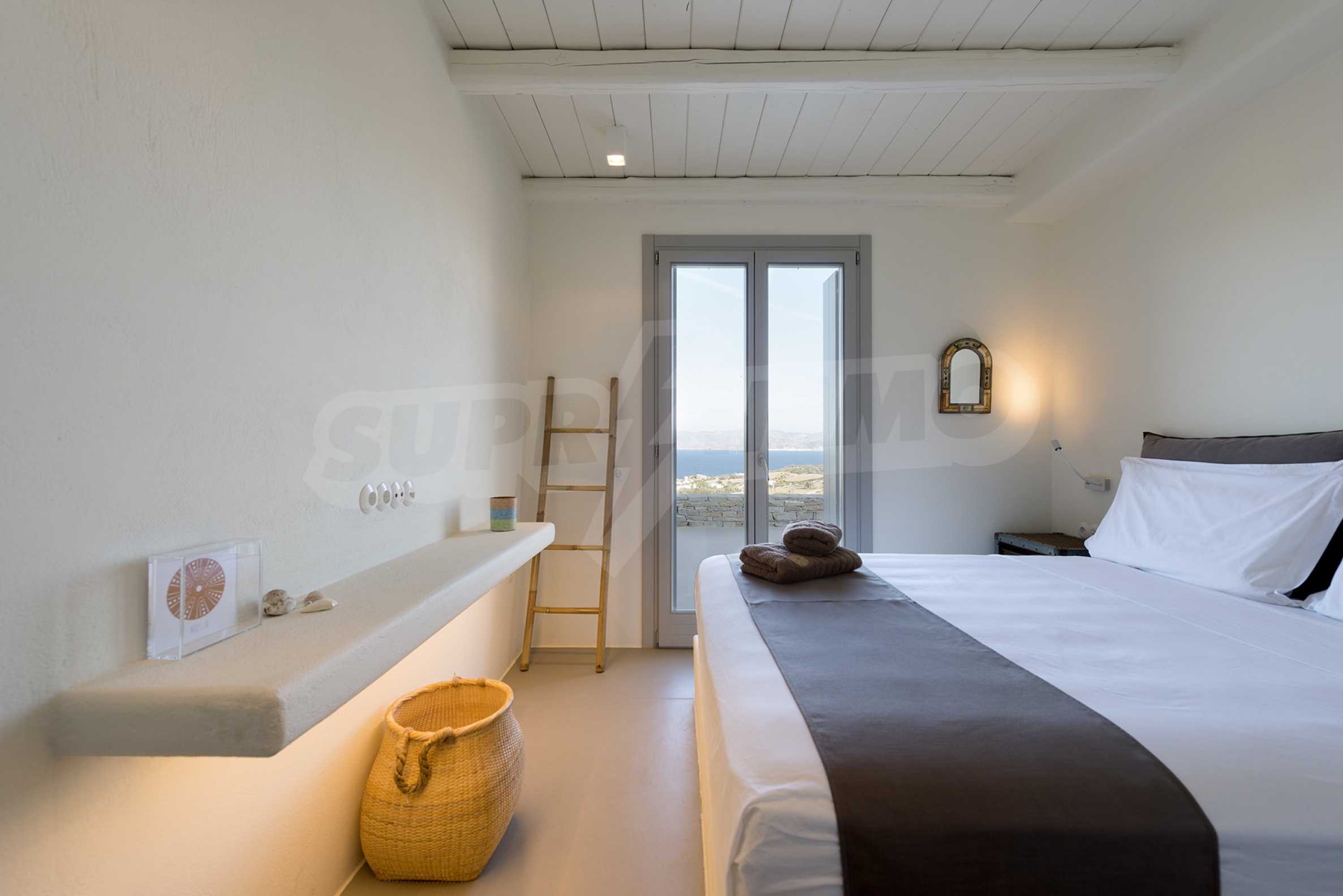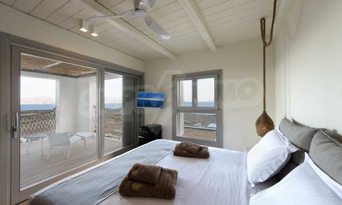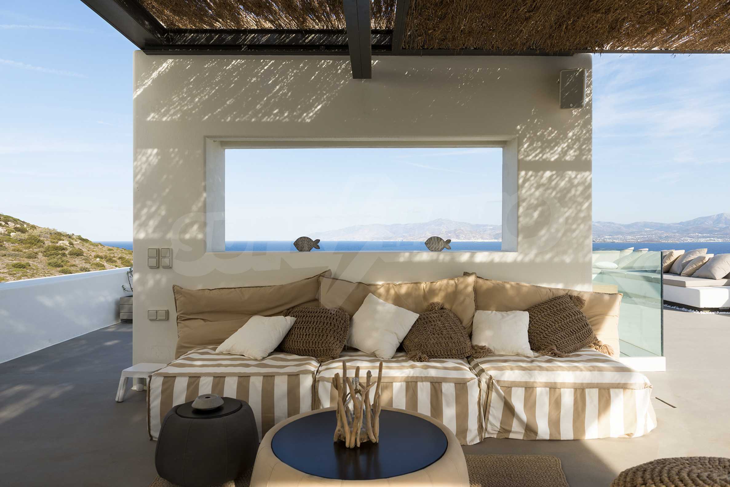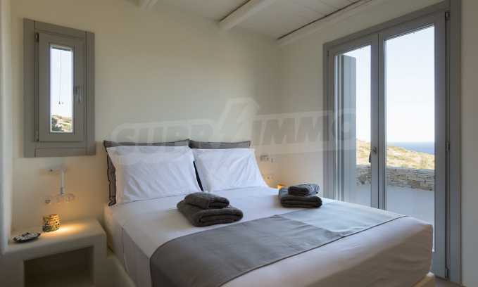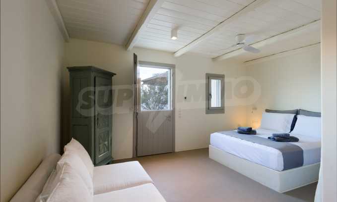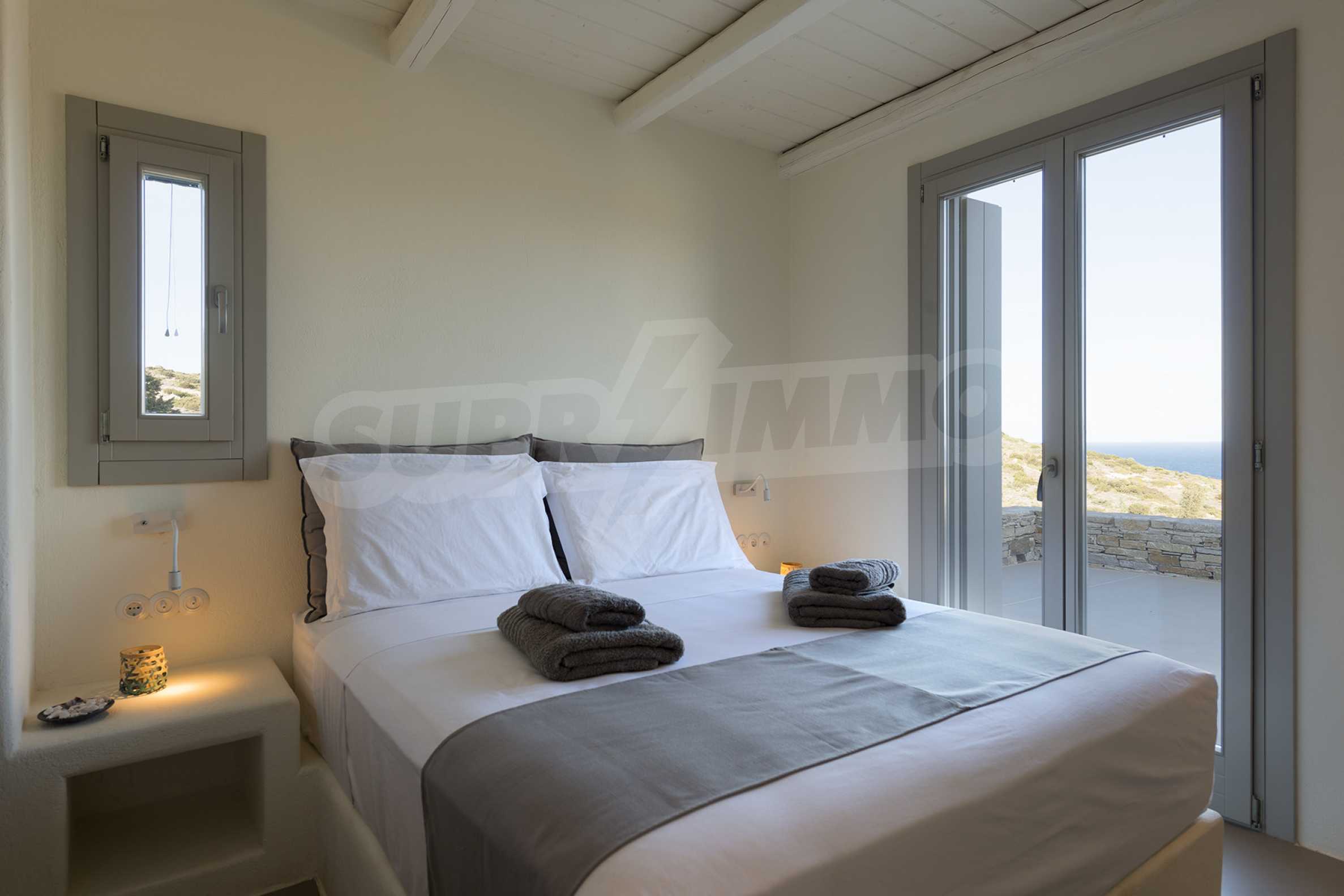 • 1st floor of the main house: Large bedroom with large bathroom and panoramic Aegean Sea view, private terrace with wooden floor, large closet.