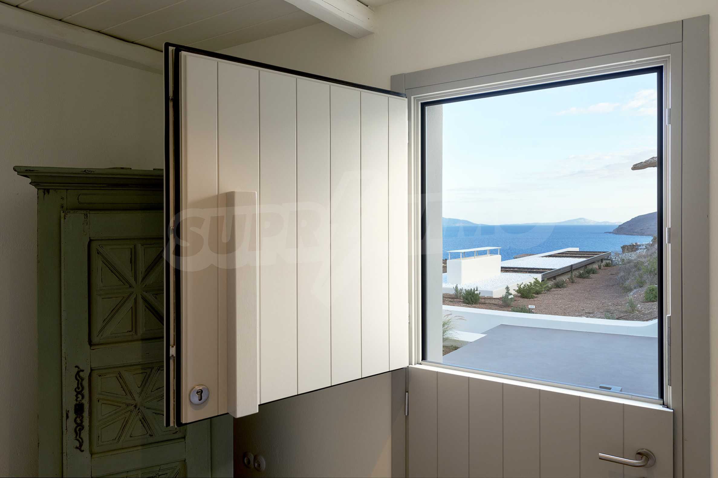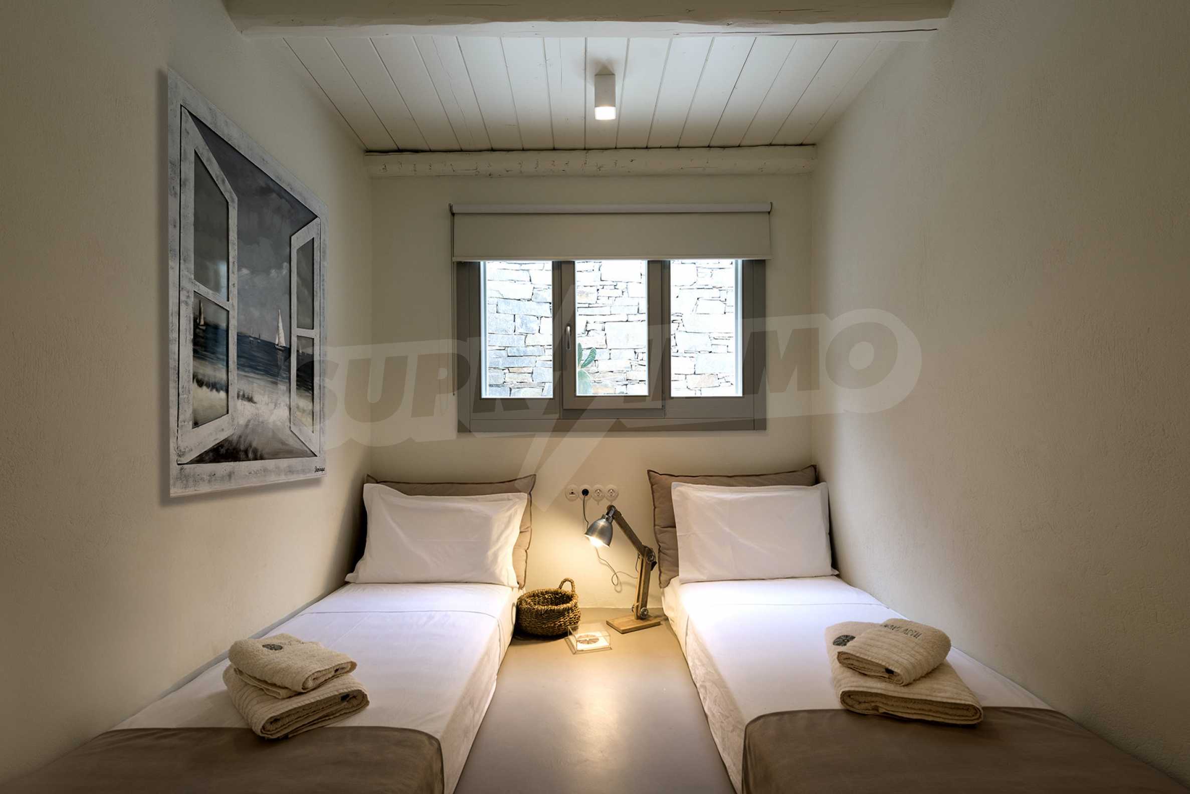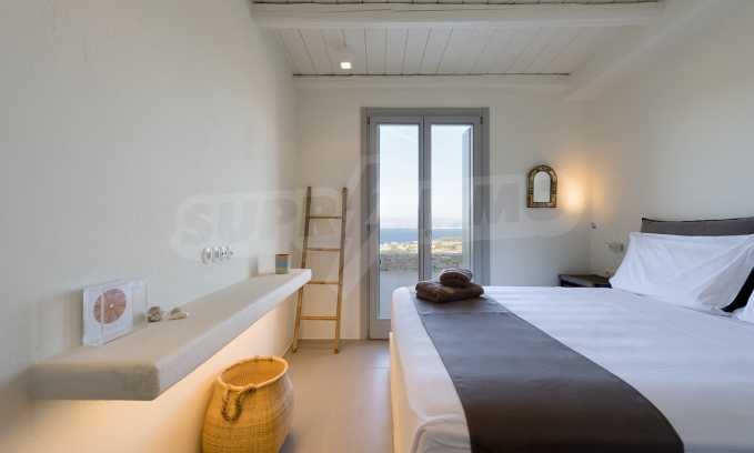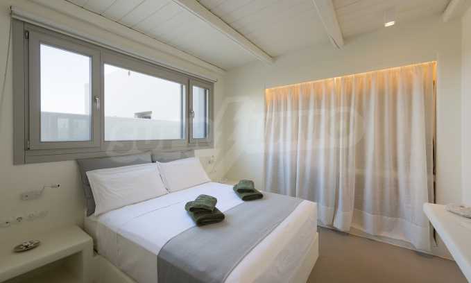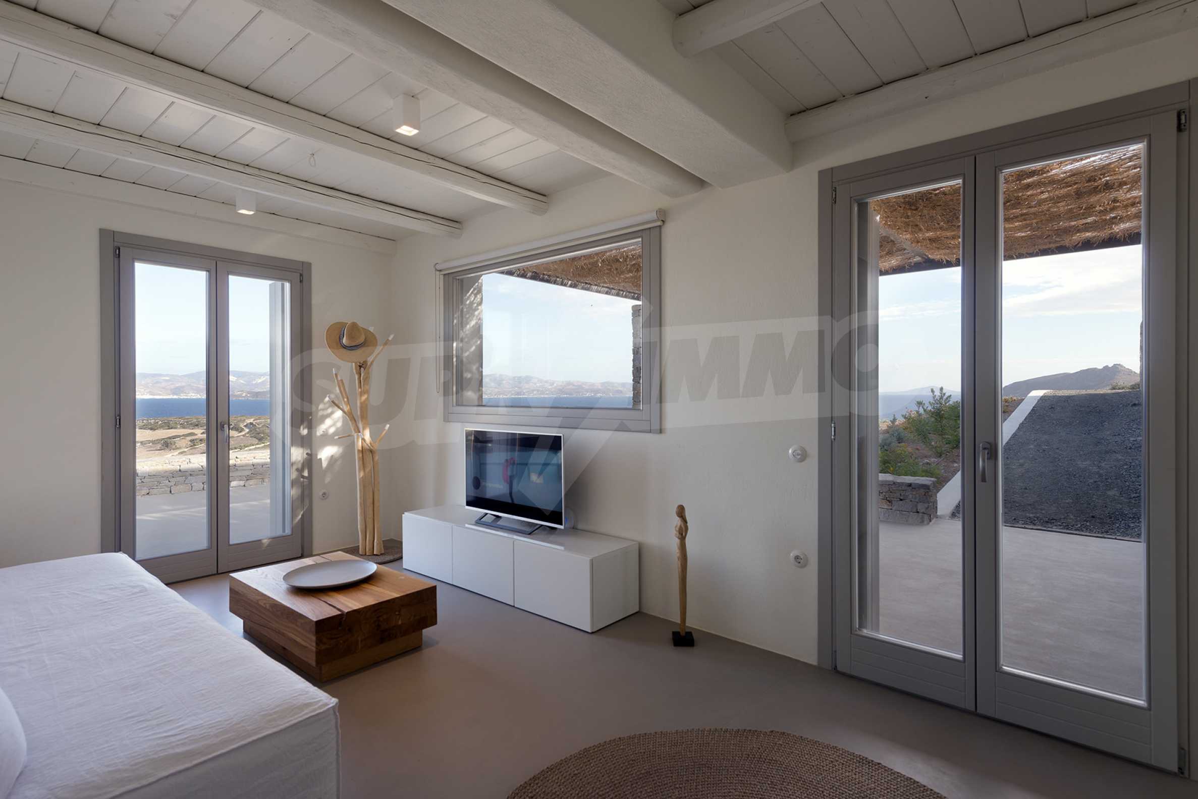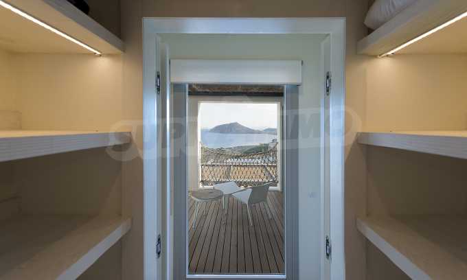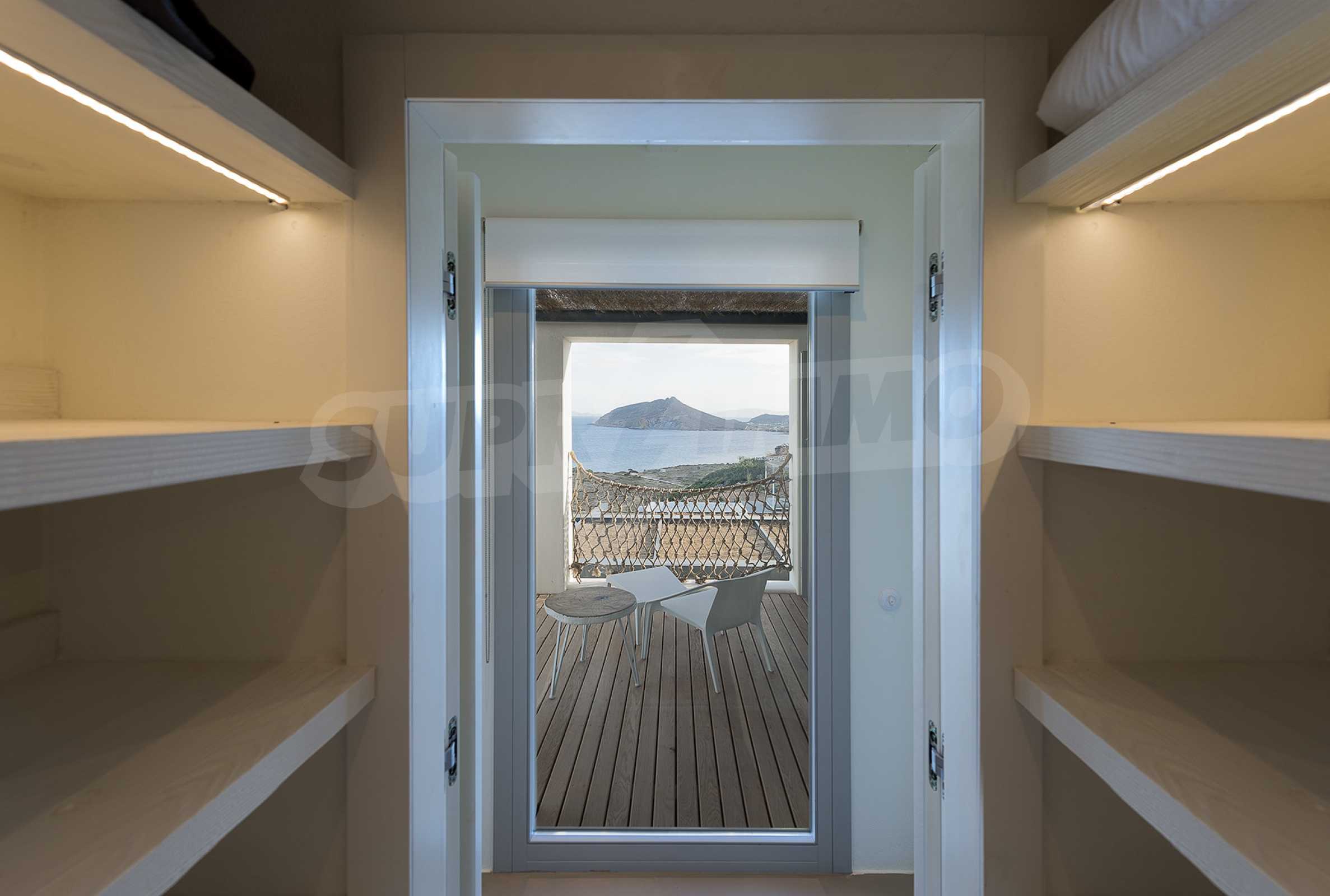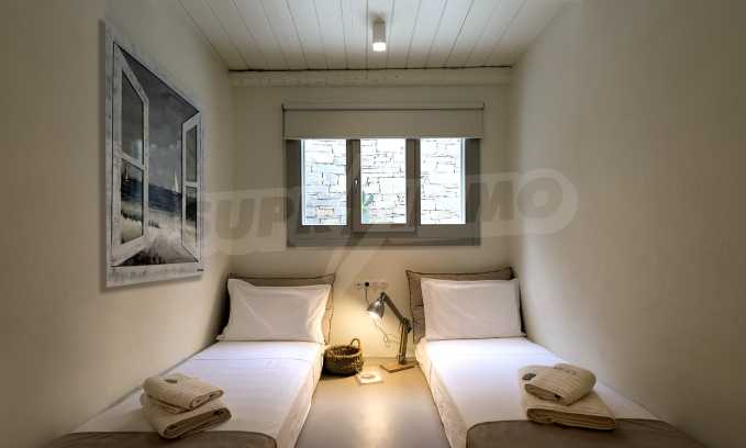 • 1st floor of the main house: Large bedroom with large bathroom and panoramic Aegean Sea view, private terrace with wooden floor, large closet.