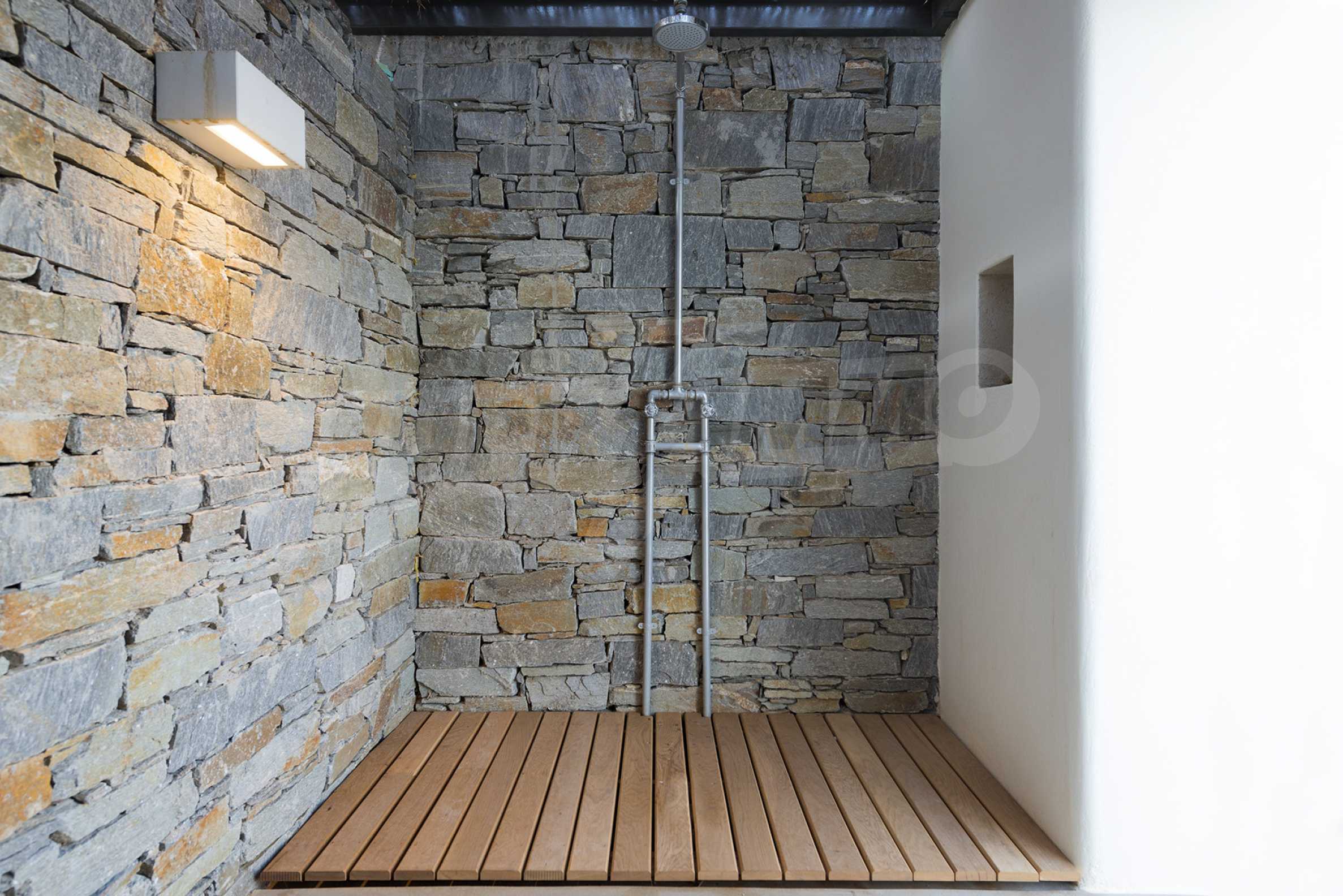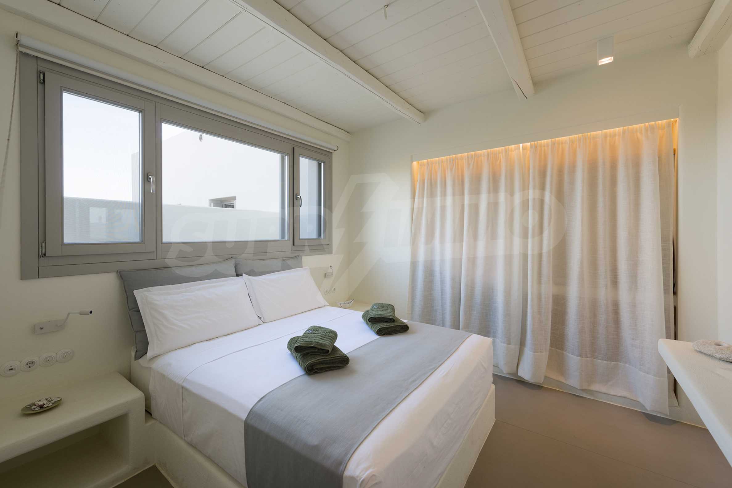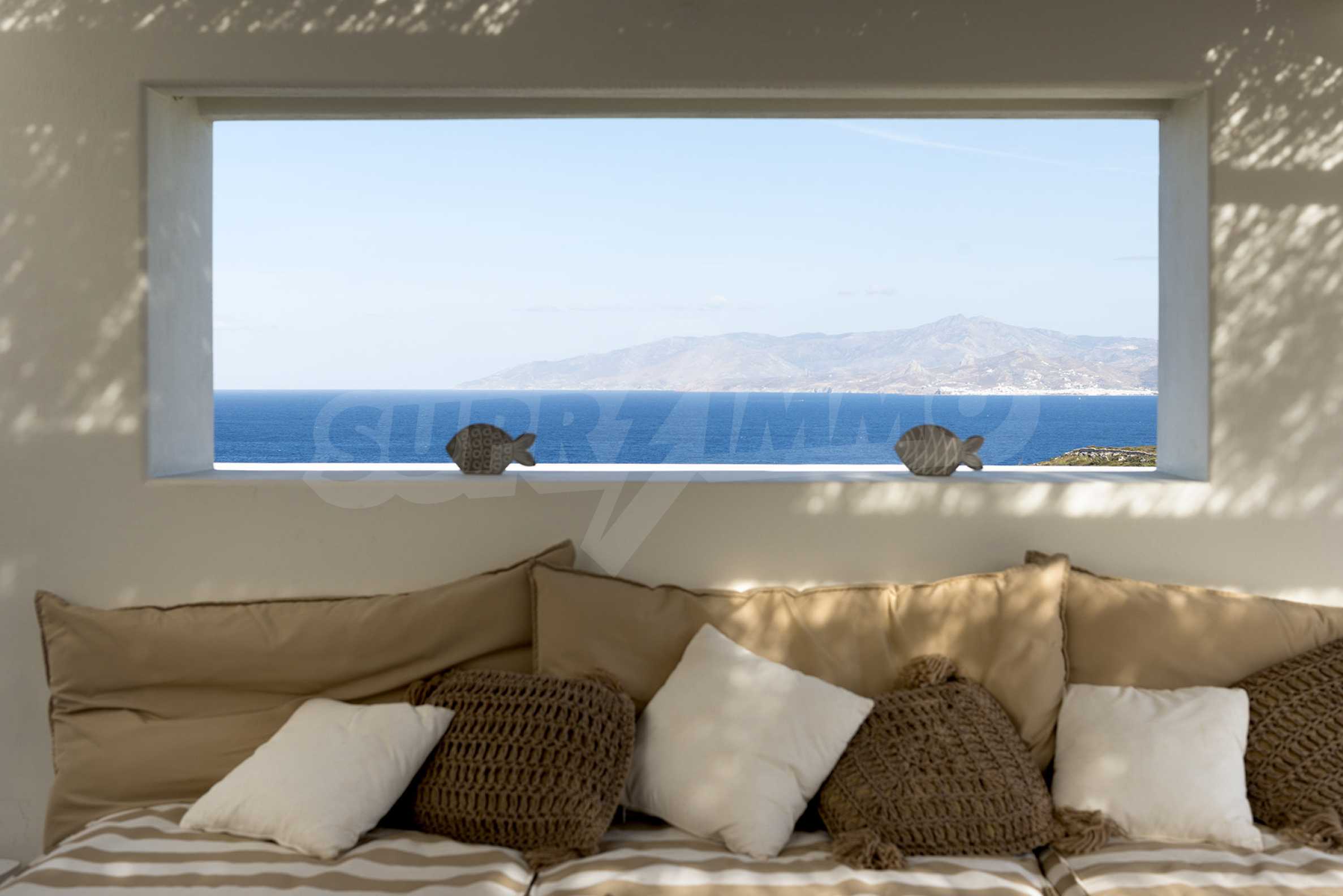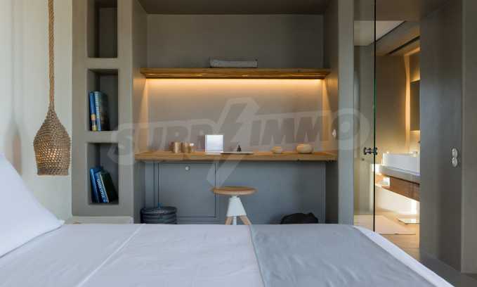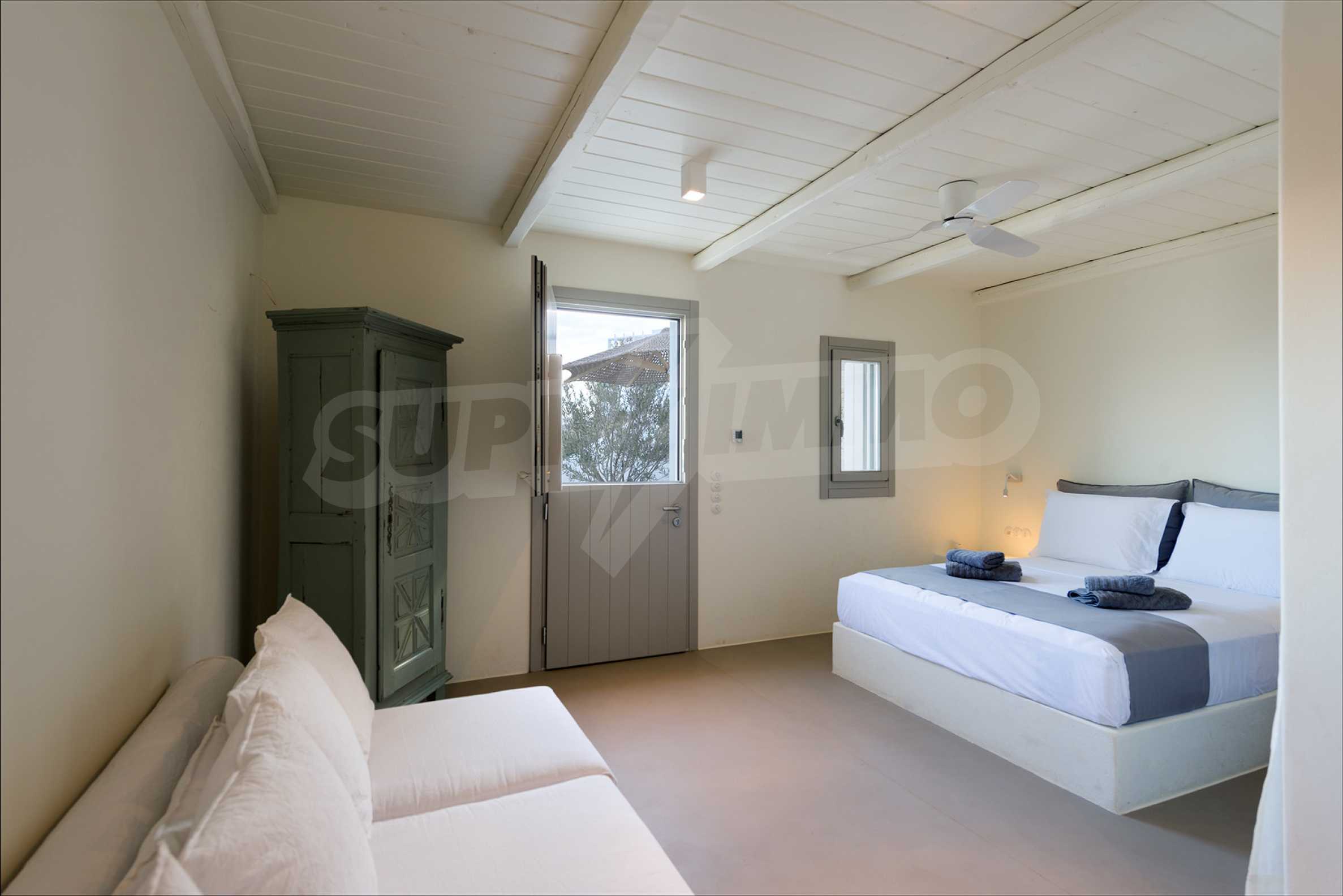 • 1st floor of the main house: Large bedroom with large bathroom and panoramic Aegean Sea view, private terrace with wooden floor, large closet.