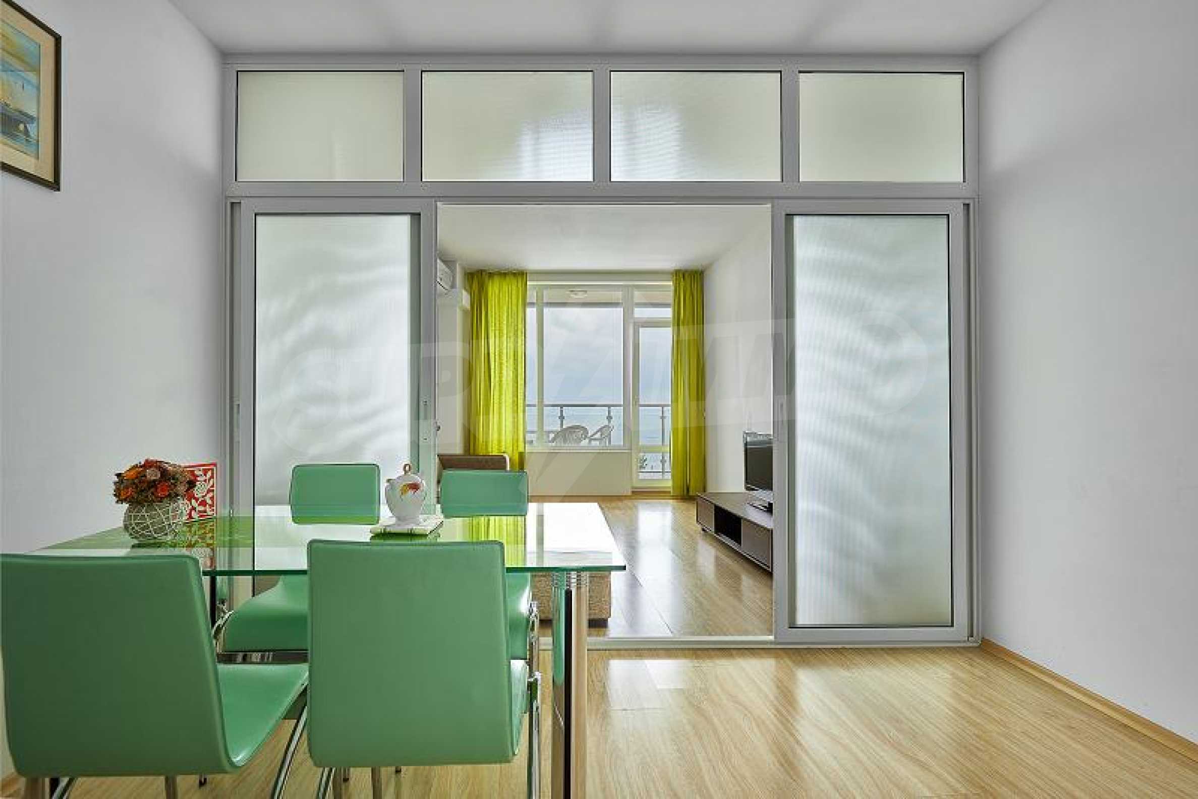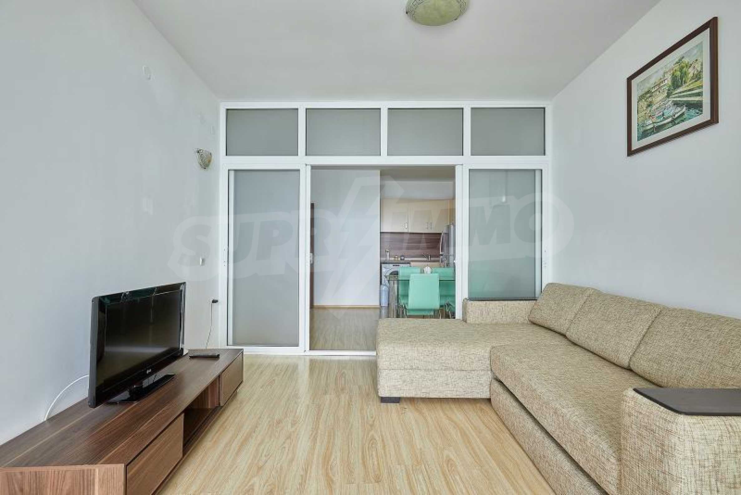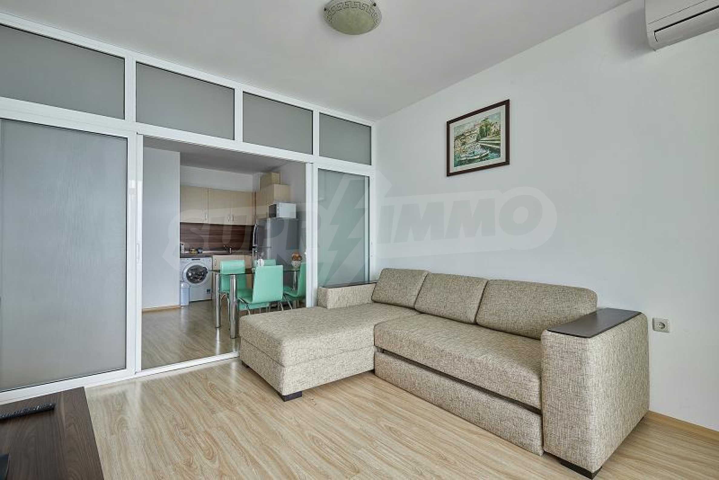 We offer you this 1-bedroom apartment with a total area of 110 m2 which is situated in a gated development. The property has air-conditioners. Laminate flooring and upvc window frames are available in the property. The furniture and appliances that are available include: a built-in kitchen, an electric boiler, a fridge and a washing machine. The property is connected to electricity and communal water supply. Some of the other available facilities that you will certainly consider important include: a balcony, a bathroom with toilet, an open-air parking lot, a swimming pool, a cable tv and internet. From the inside you will be able to enjoy wonderful beach views, sea views, swimming pool views and views to inner garden.