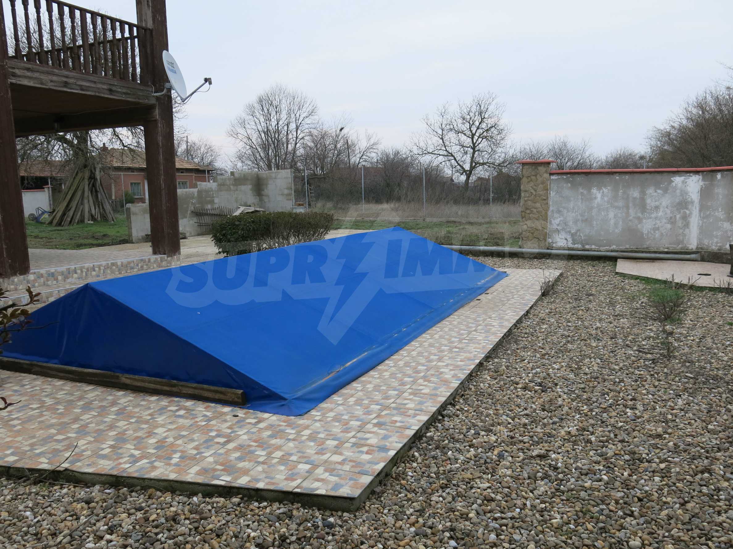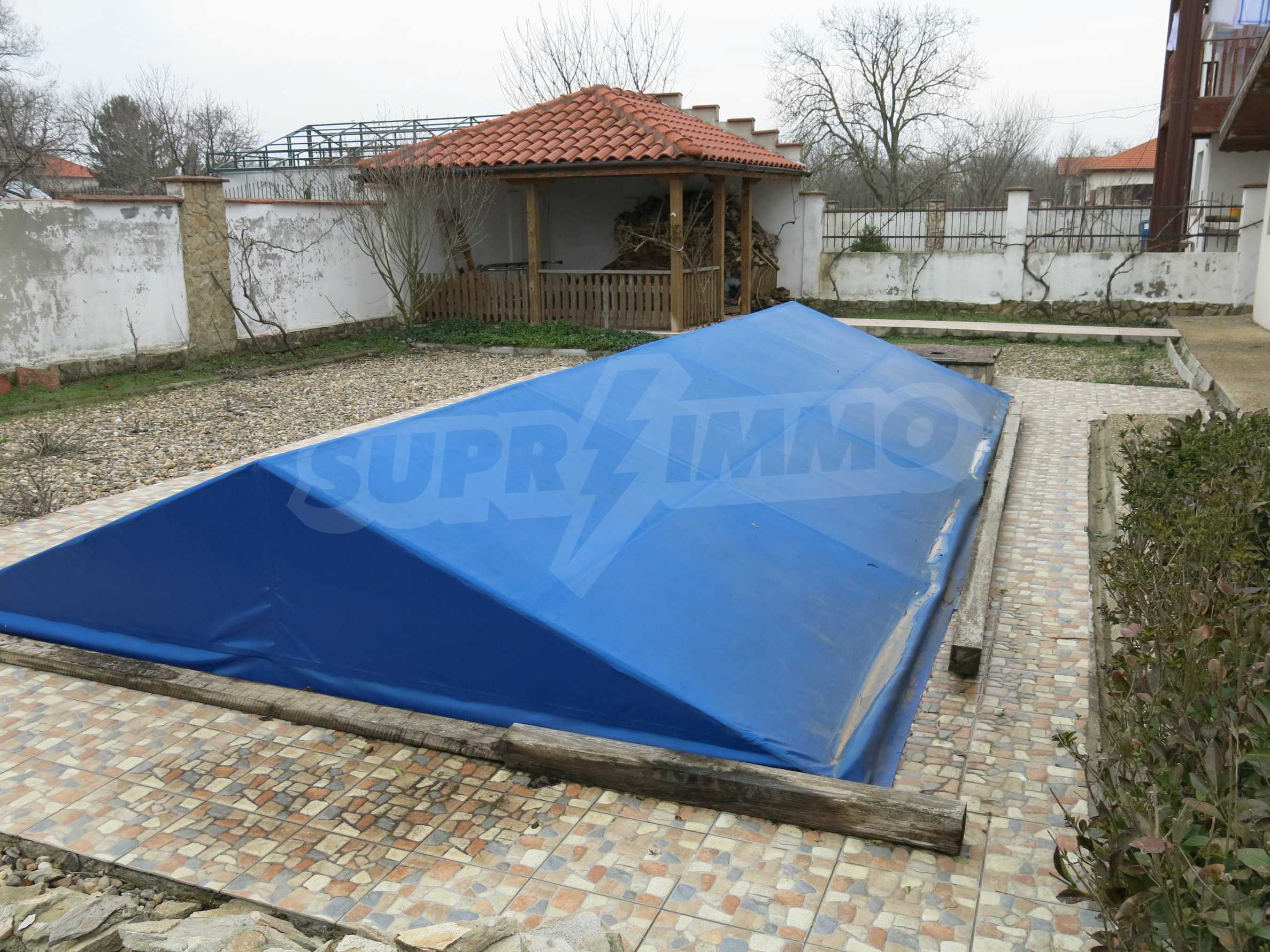 We offer you this house with a total area of 320 m2. The property is supplied with air-conditioners, electric heating appliances (fan heater, radiators, etc.) and solid fuel heating system. granite tiled flooring, armored front door, external insulation, interior doors, laminate flooring, painted walls, tiled flooring and upvc window frames are available in the property. The property is connected to electricity, communal water supply and septic tank. Some of the other available facilities that you will certainly consider important include: a balcony, a basement, a bathroom with toilet, a garage, an internal bathroom, an internal toilet, an open-air parking lot, a veranda and a swimming pool. From the inside you will be able to enjoy wonderful views to inner garden and village views.
