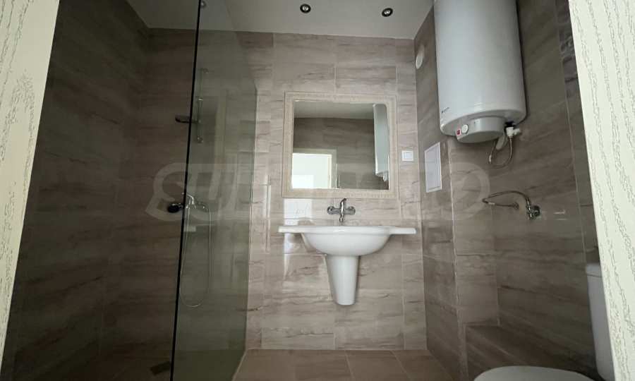 - Bathroom - floor - terracotta, walls - faience, shower faucet, monoblock, sink, shower cabin and water heater.