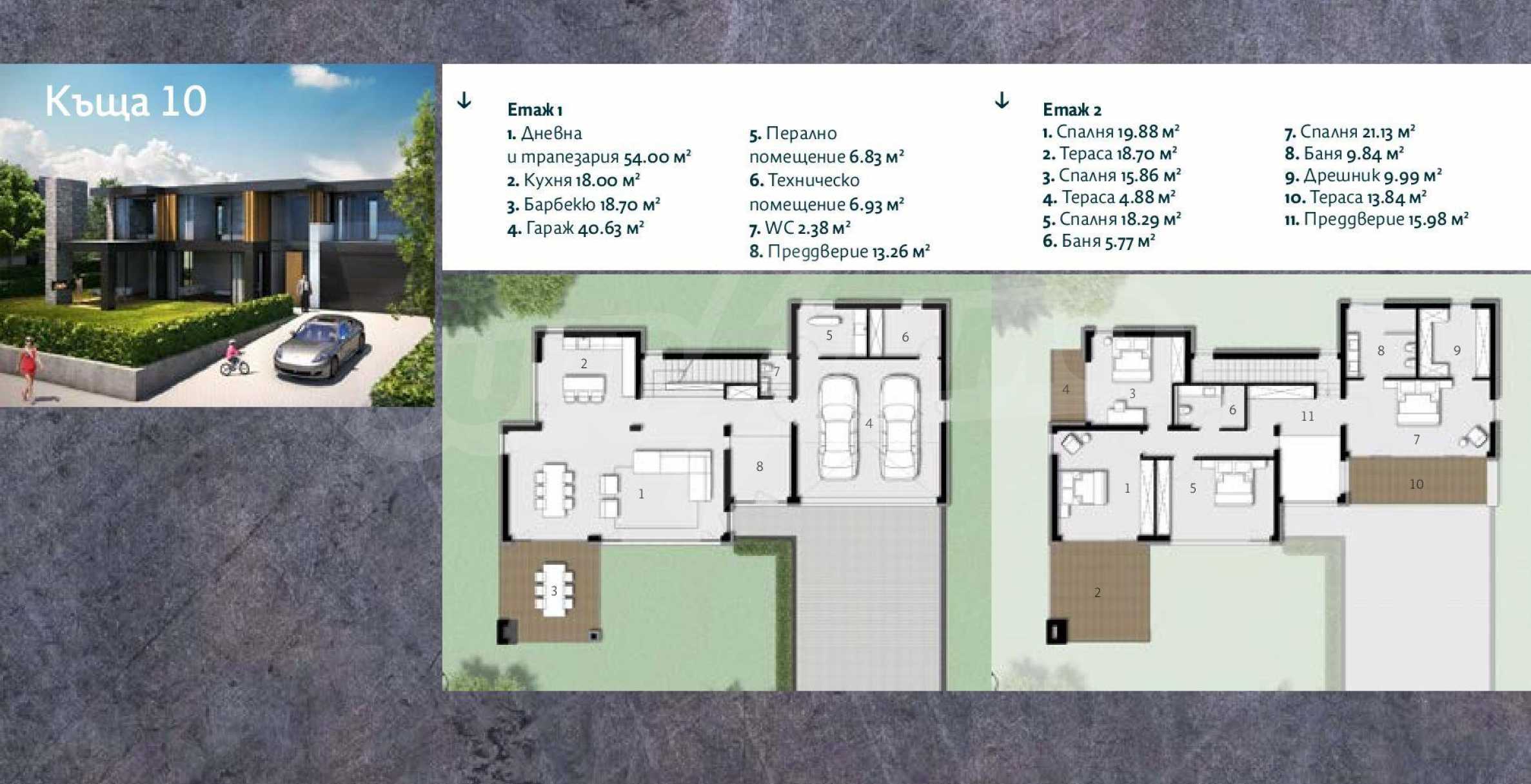 Two-storey family house in a gated complex with eleven detached houses near the English-American school. The area is picturesque and offers year-round contact with natural resources and fresh air. Nearby are located Kambanite and Pancharevo lake. The access to the central parts of the city is convenient via the main roads - Samokovsko shose and Ring Road.