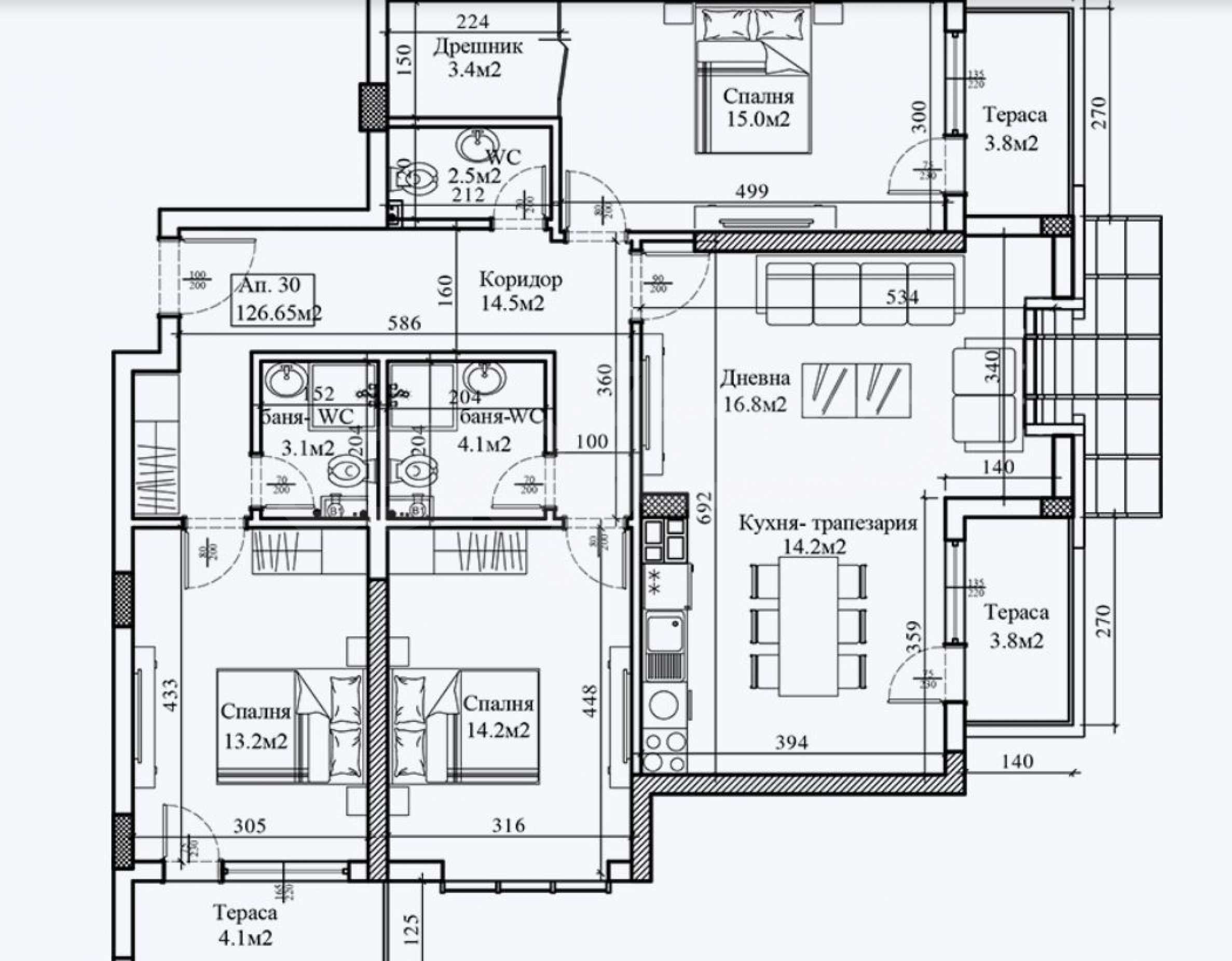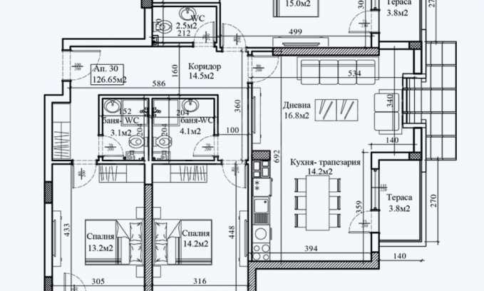 We offer you a multifunctional three bedroom apartment in "Symphony" quarter, Briz quarter. On a living area of 126.65 m2 there are: a living room with a total of 31 m2, three bedrooms each, respectively 13, 14 and 15 m2, three bathrooms 2,5, 3 and 4 m2, closet 4 m2 and three terraces each 4 m2. Sale is completed under BDS.