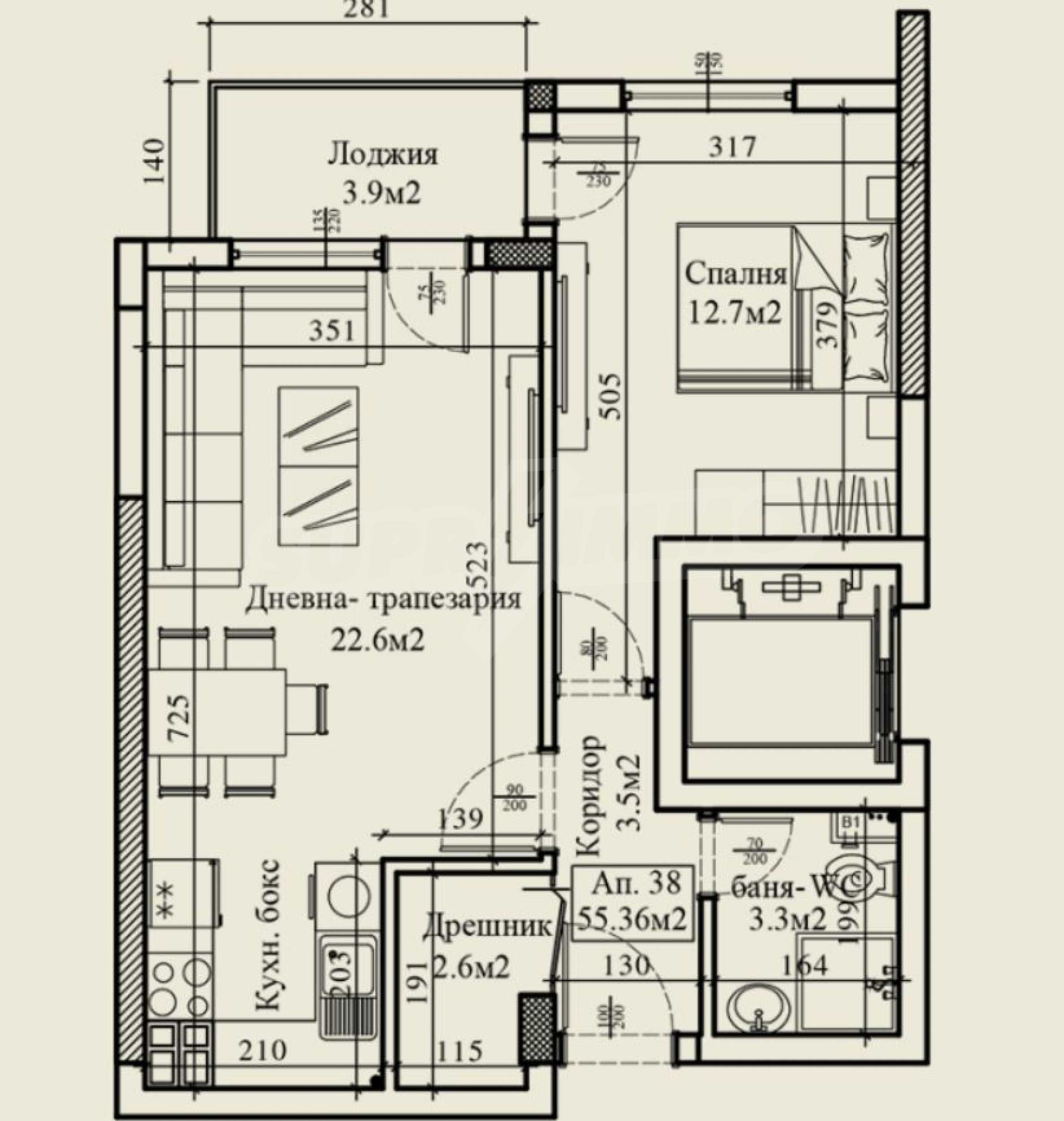 The offered one-bedroom apartment has a net living area of 55.36 m2 and has the following layout: living room with dining area a total of 22.6 m2, bedroom 13 m2, bathroom 3.3 m2, closet 2.6 m2, entrance hall 3.5 m2 and terrace 4 m2. Sold finished according to BDS.