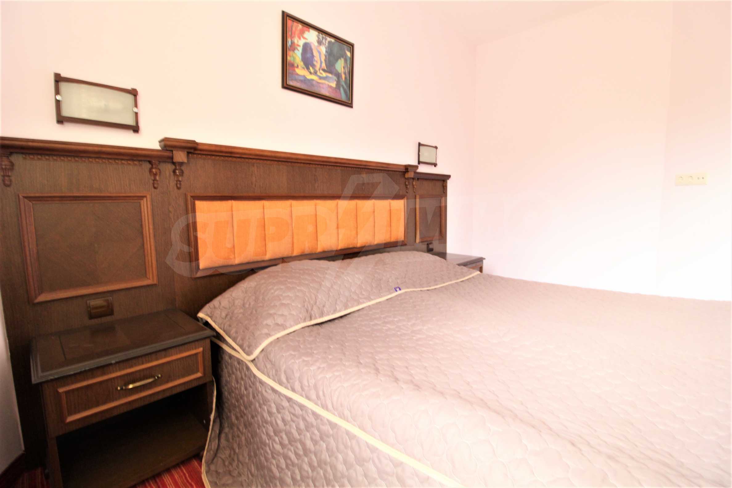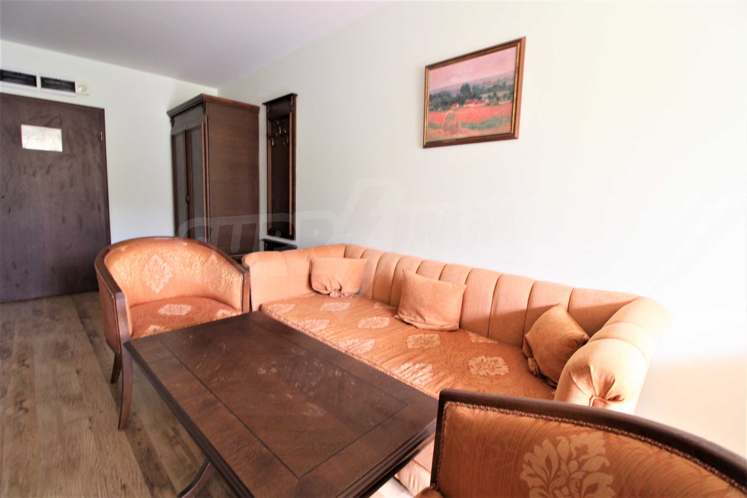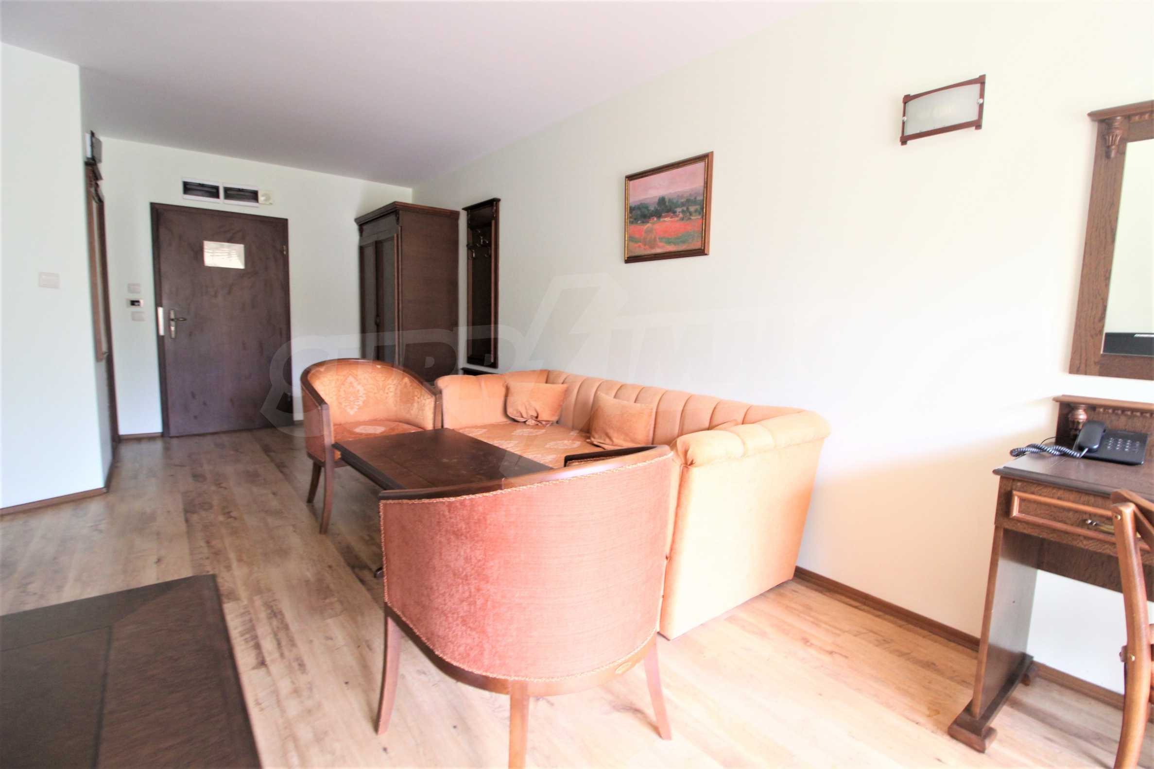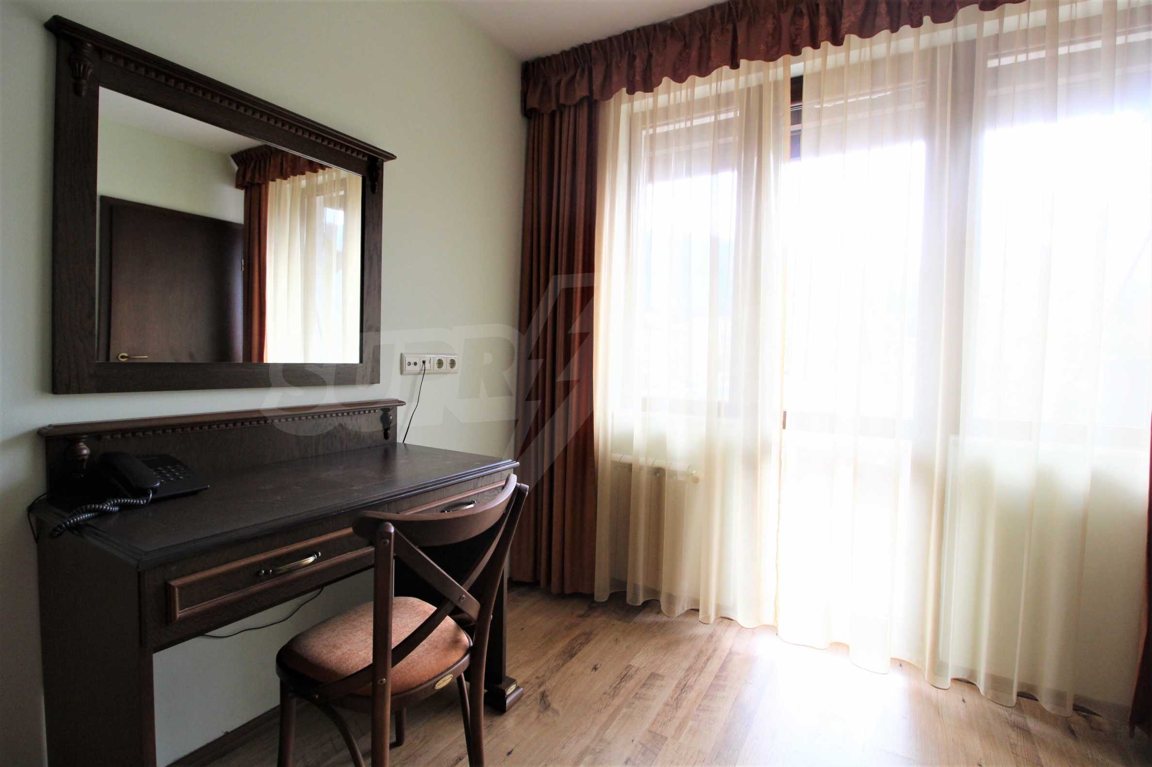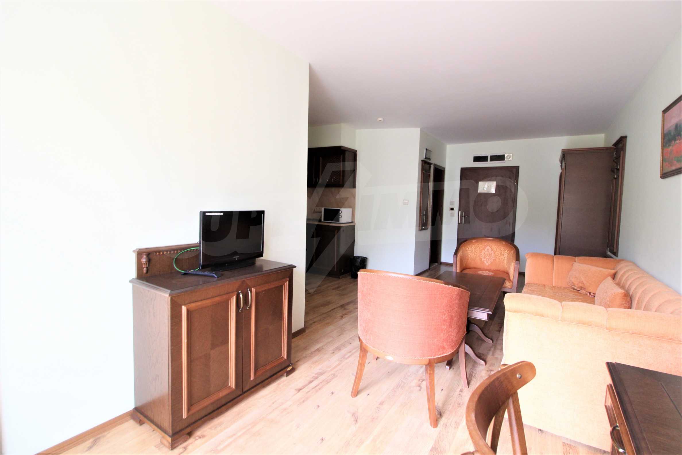 We are happy to present you this one-bedroom apartment with an area of 54.30 sq.m. The property consists of: spacious living room with kitchen, one bedroom, corridor, bathroom, terrace with Mountain view. The property is located on the third floor of a complex with swimming pool, lobby bar, restaurant and SPA center. The apartment is close to the Gondola. The property is suitable for relaxing in all seasons of the year, for permanent living or for renting. The stylish furniture in the apartment creates the feeling of luxury and comfort. Exposure: south.