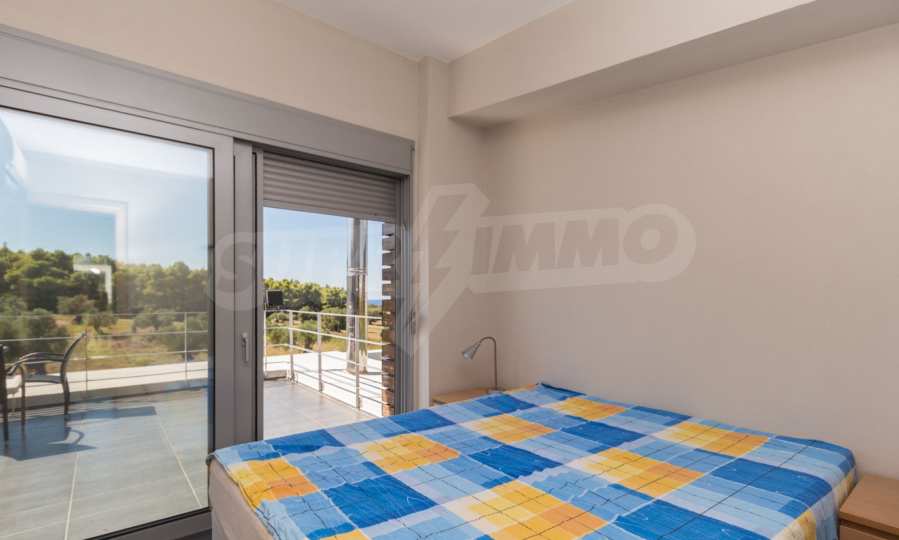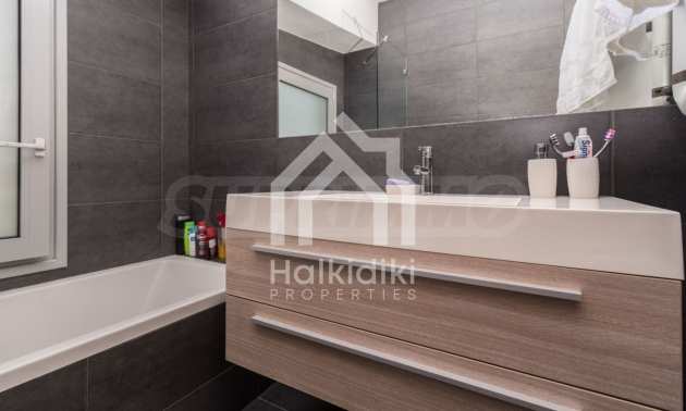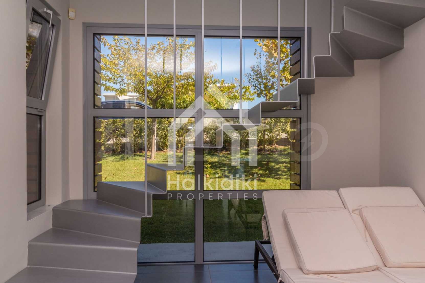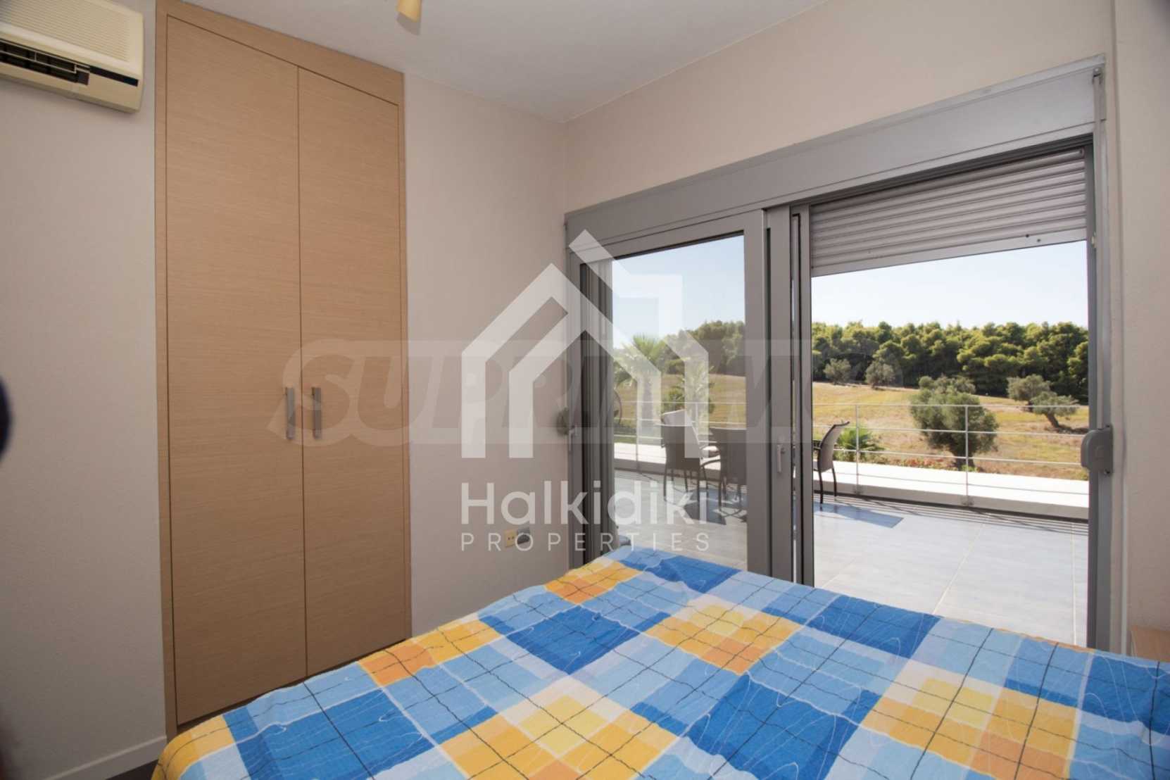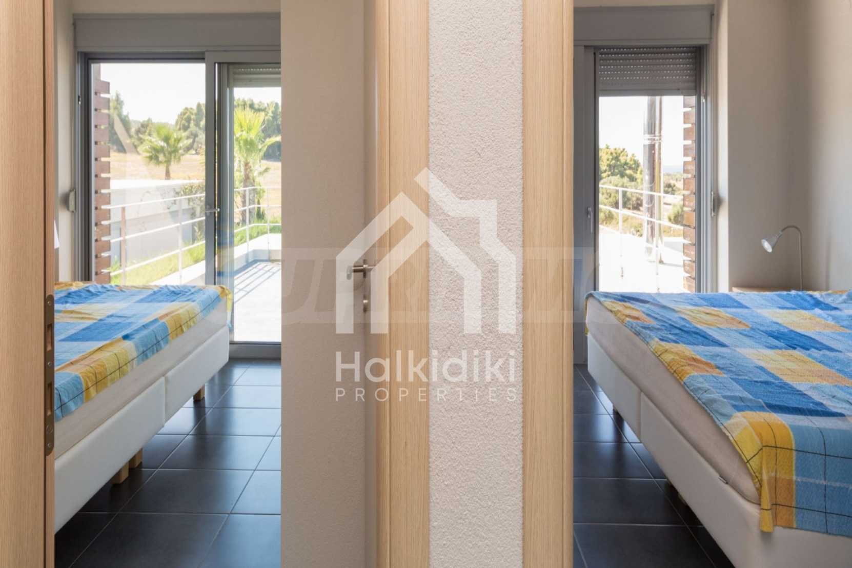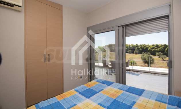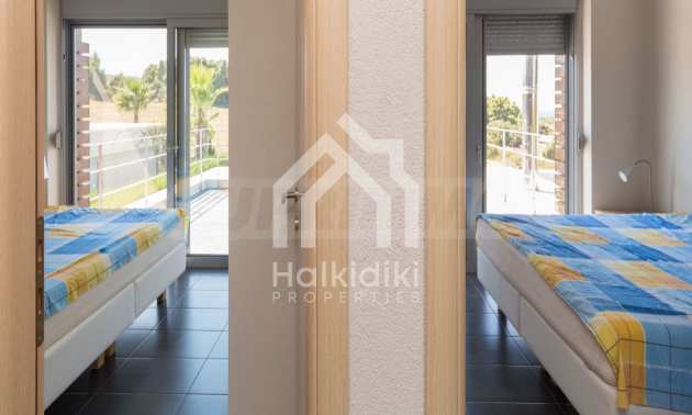 Beautiful,luxurious detached house,140 m,in Kassandra,Halkidiki with an eastern orientation and with unobstructed permanent view.The property is 1.7 km. away from the beach and the center of the village.The house is split in two levels,consisted of a living room connected with the kitchen,three bedrooms,two bathrooms and two storage rooms.The property,also,has big balconies,PVC joinery,private pool,680m garden,barbecue and alarm system pre-installation.The house is fully equipped and furnished.