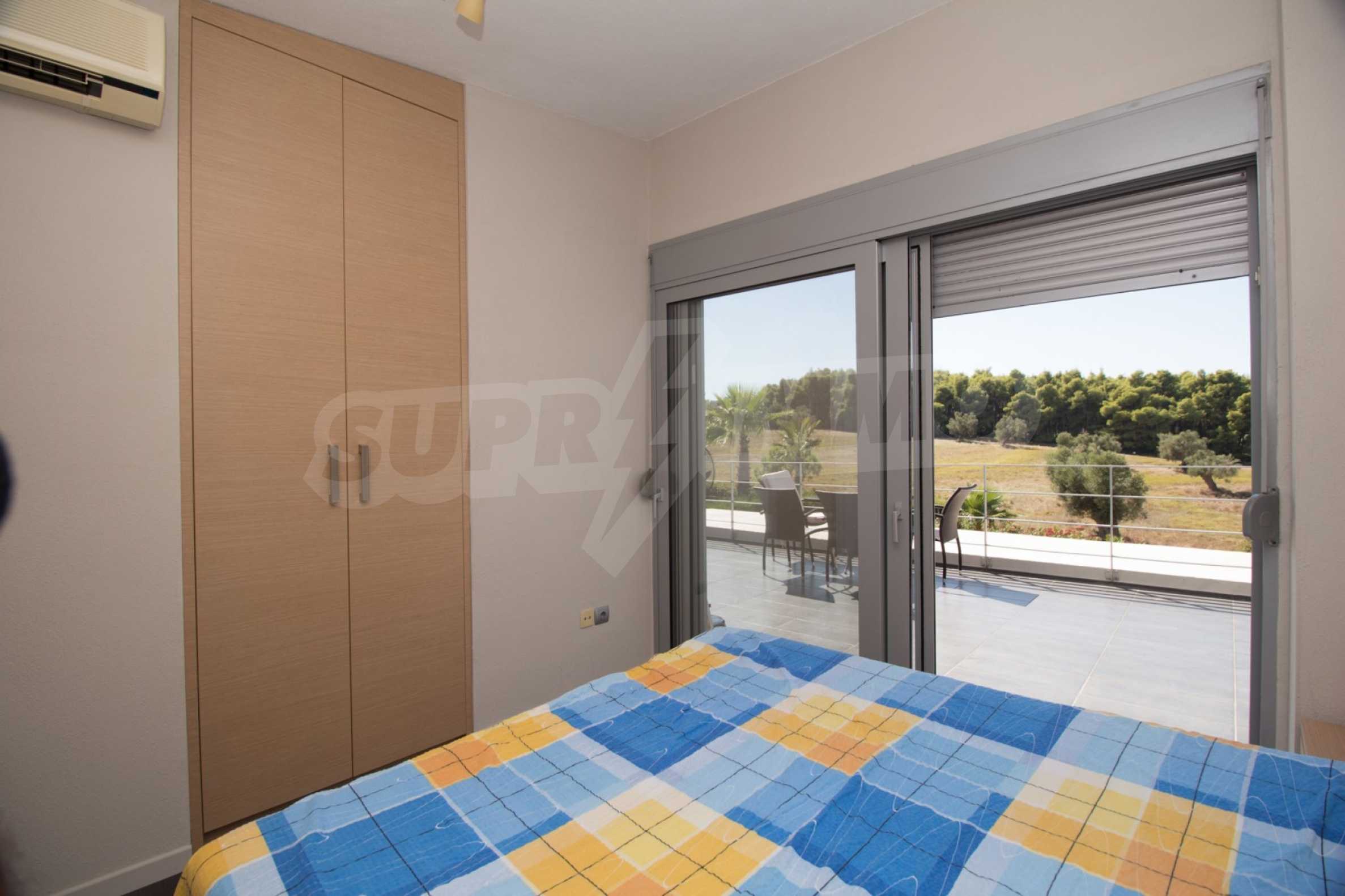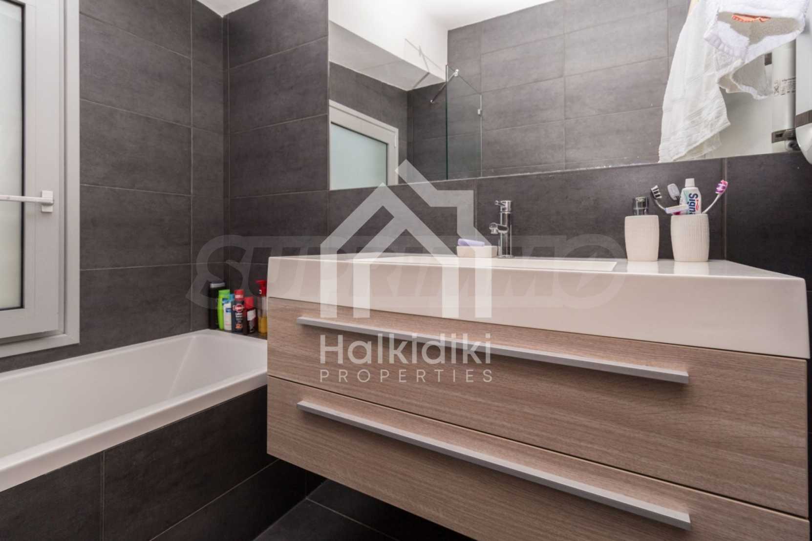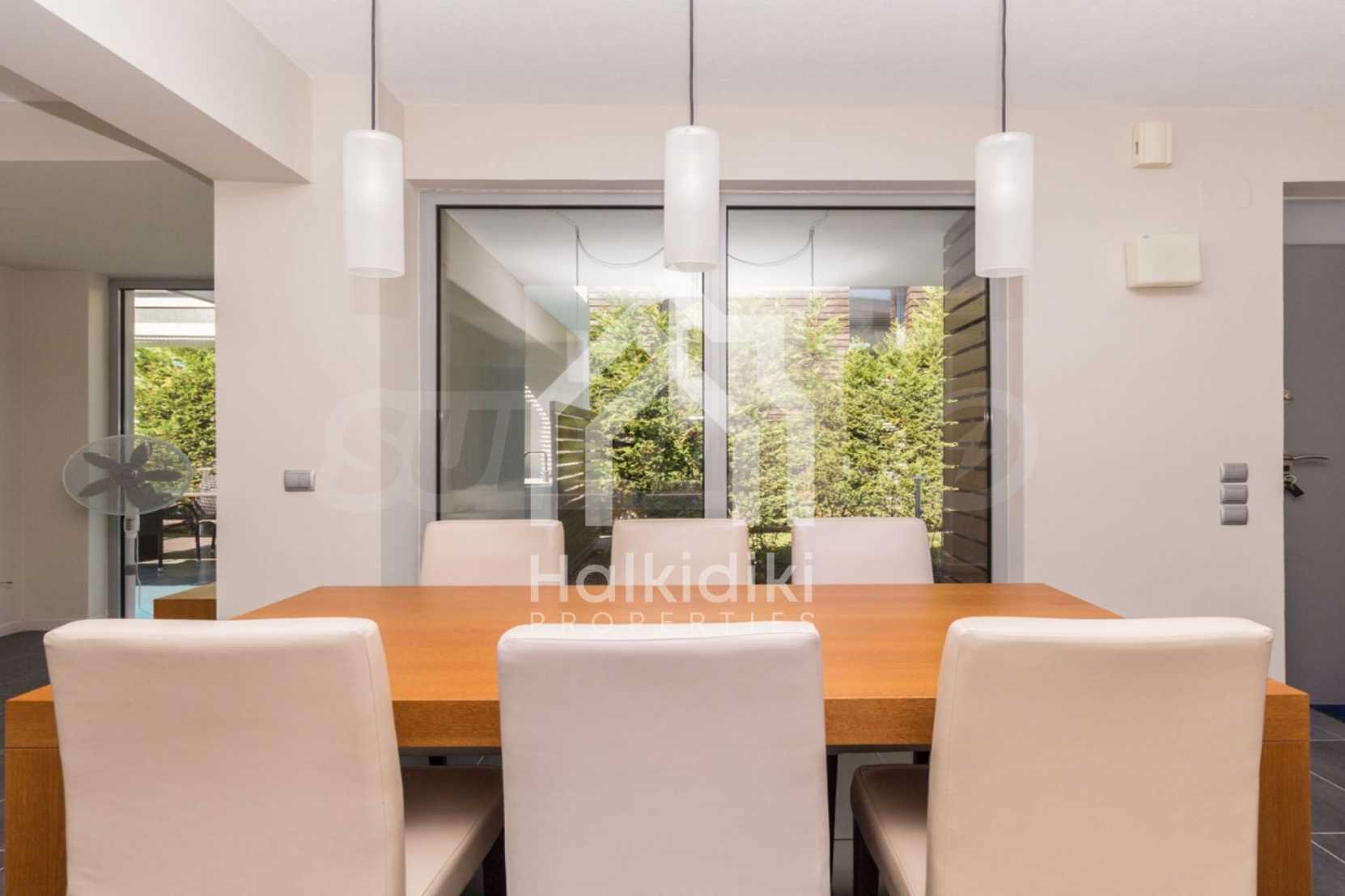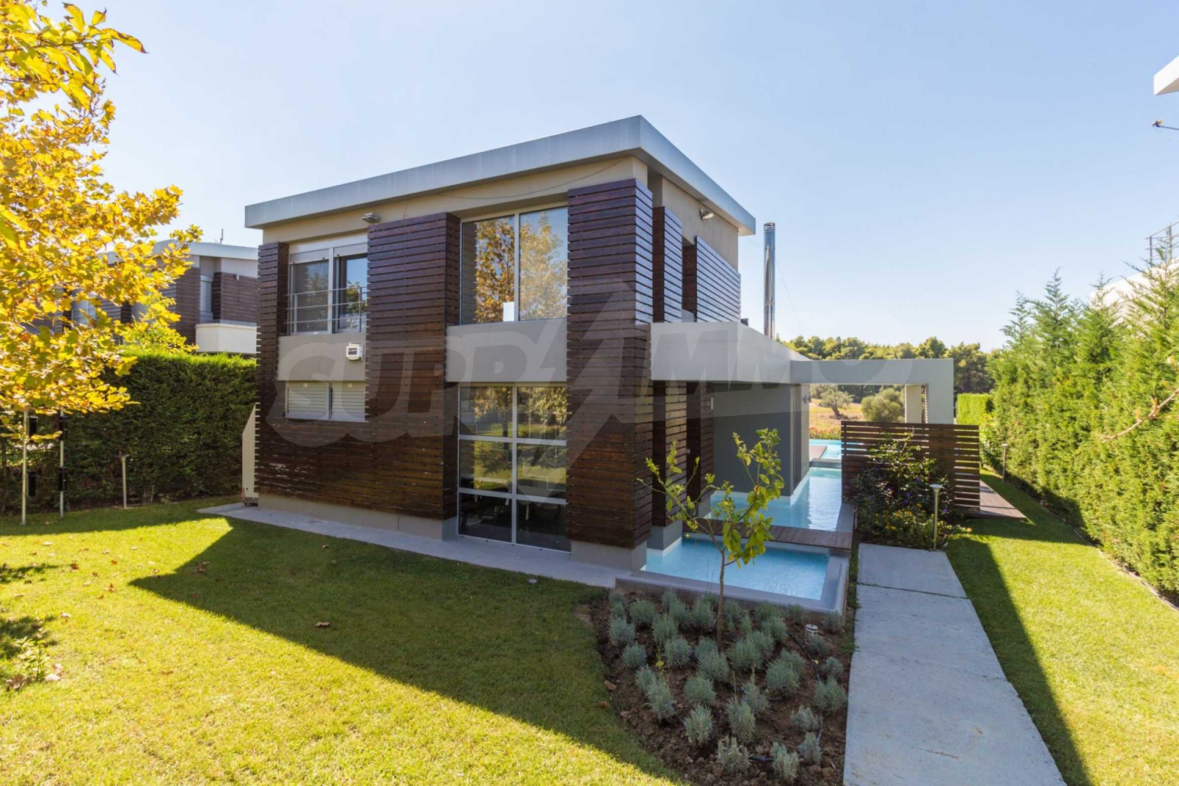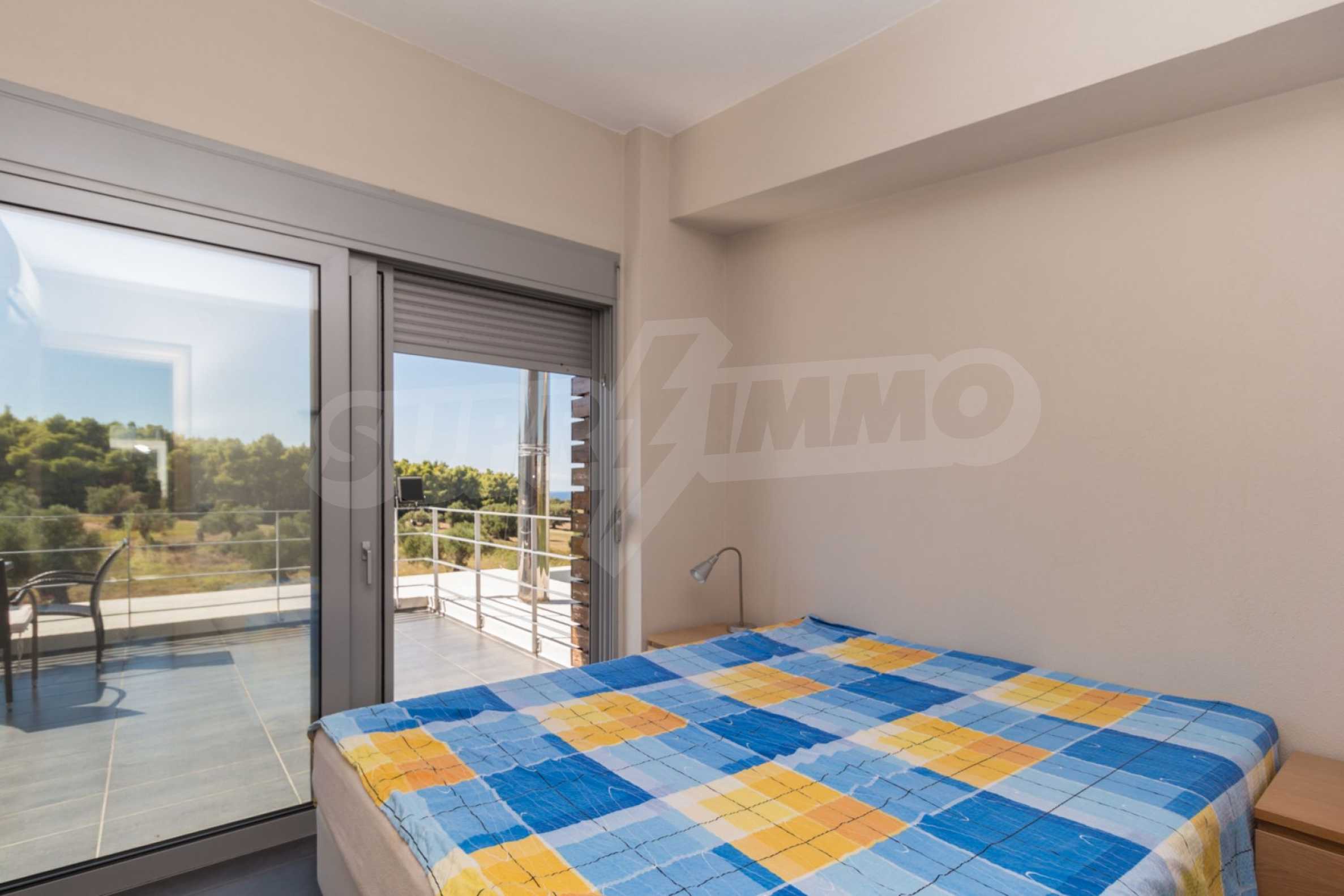 Beautiful,luxurious detached house,140 m,in Kassandra,Halkidiki with an eastern orientation and with unobstructed permanent view.The property is 1.7 km. away from the beach and the center of the village.The house is split in two levels,consisted of a living room connected with the kitchen,three bedrooms,two bathrooms and two storage rooms.The property,also,has big balconies,PVC joinery,private pool,680m garden,barbecue and alarm system pre-installation.The house is fully equipped and furnished.