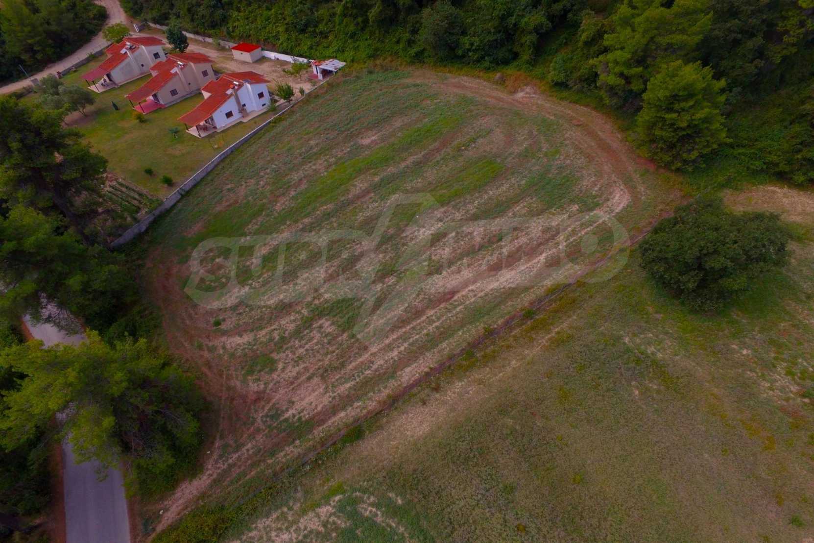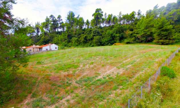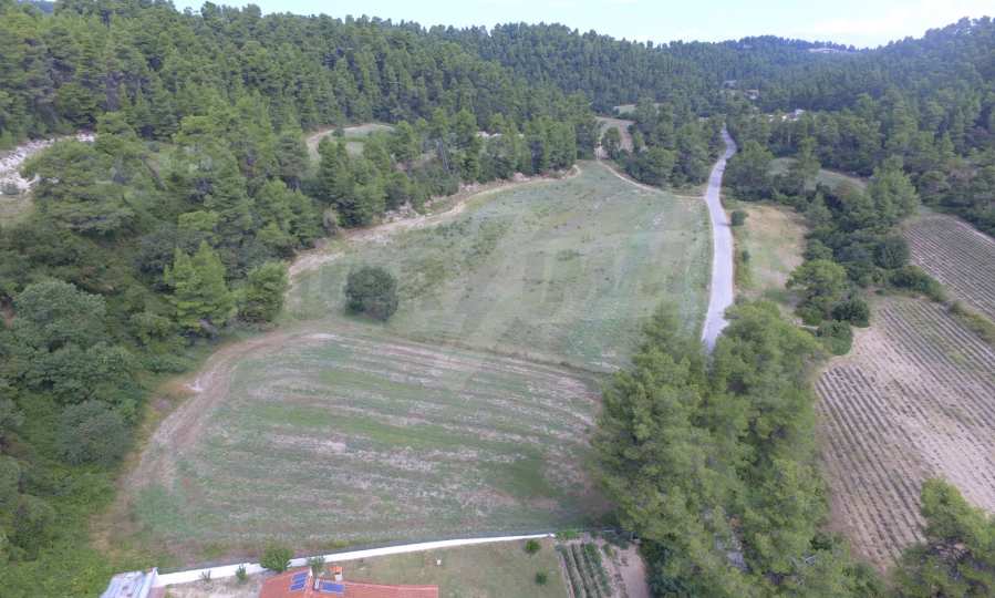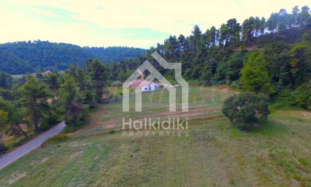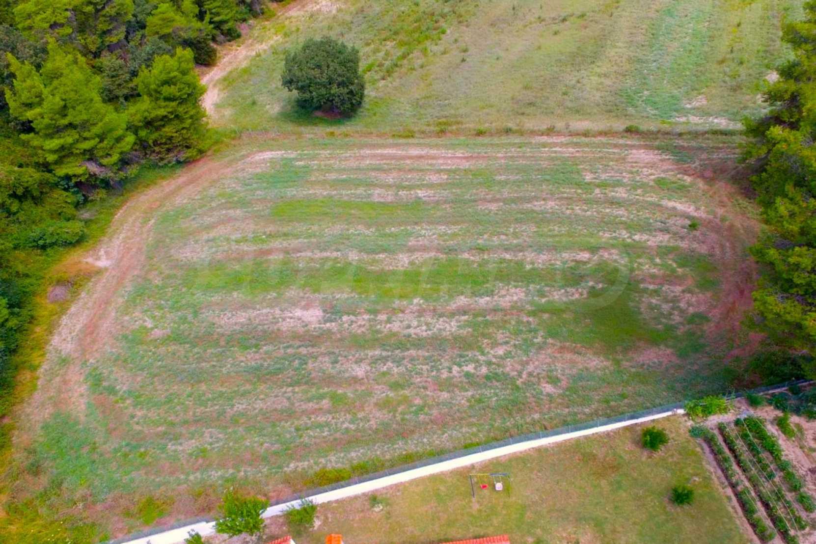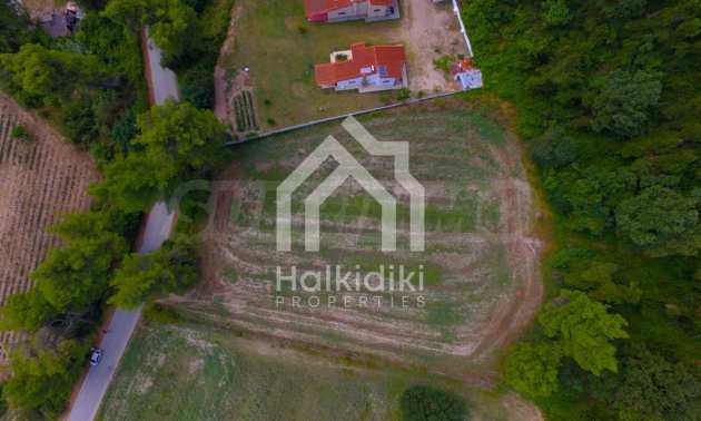 Slanted field, 3557 m,in Kassandra,Halkidiki with unobstructed permanent view.The fenced property is 1 km. away from the center of the village and faces the main road.The corner field is complete,buildable and is perfect for the construction of a villa or detached houses.