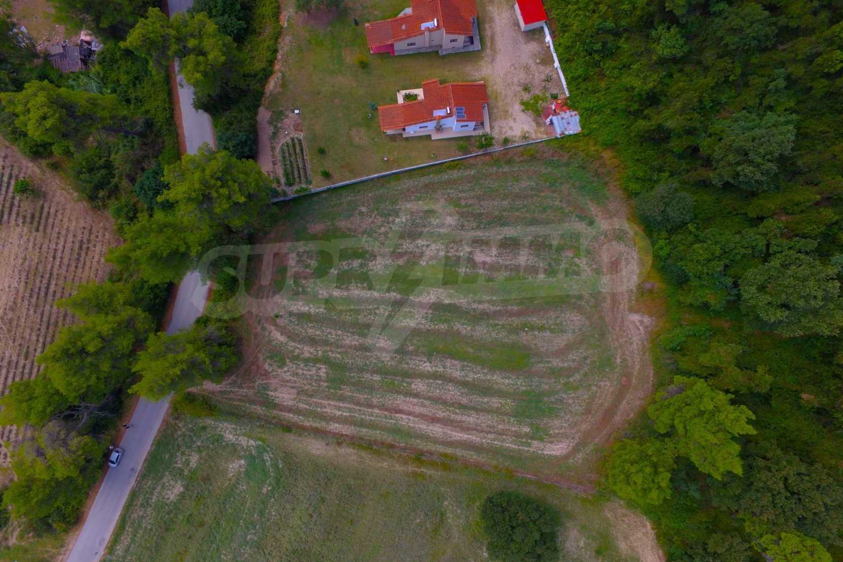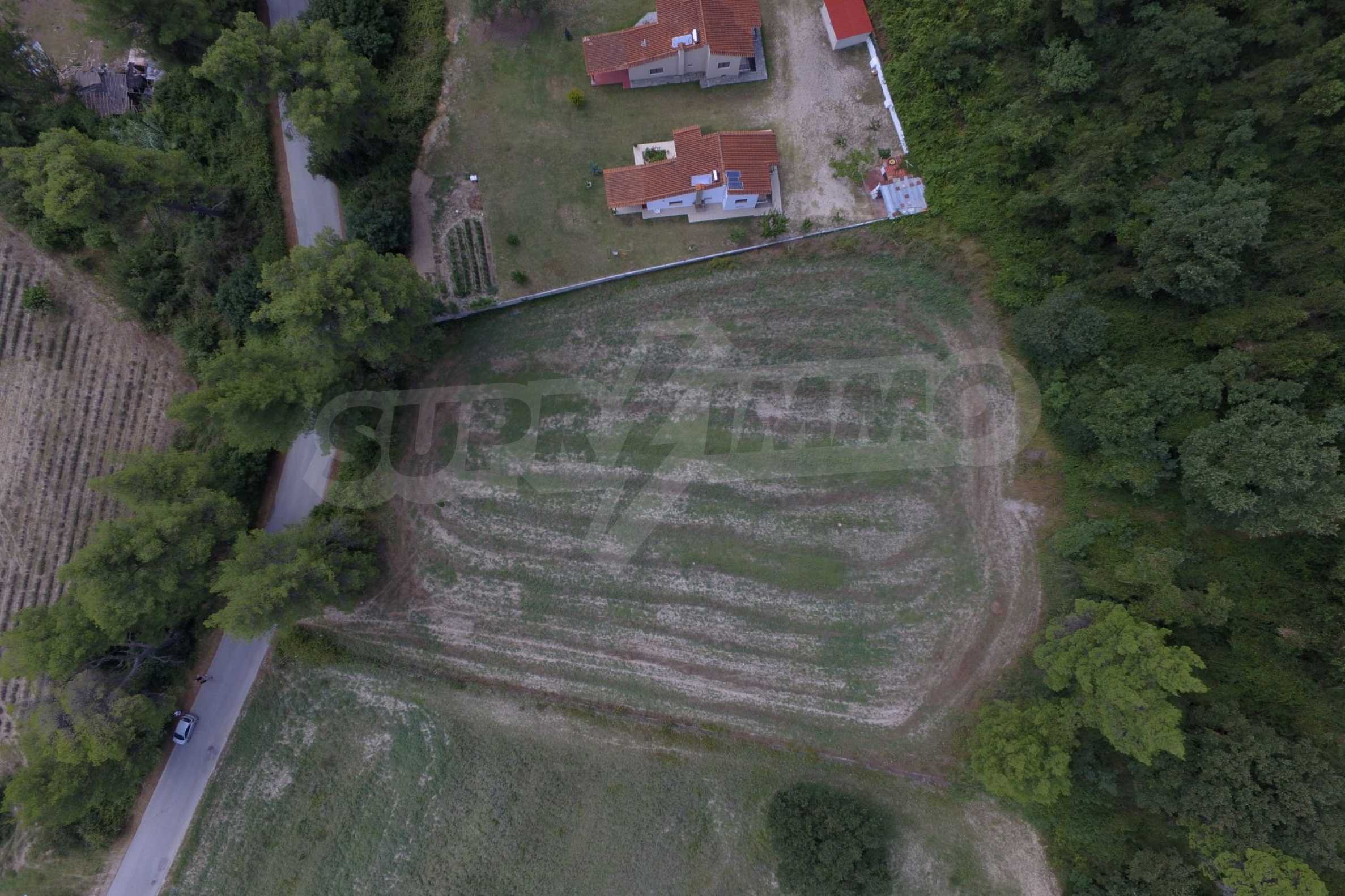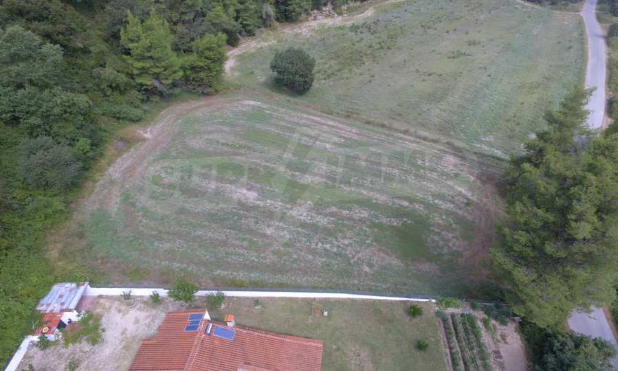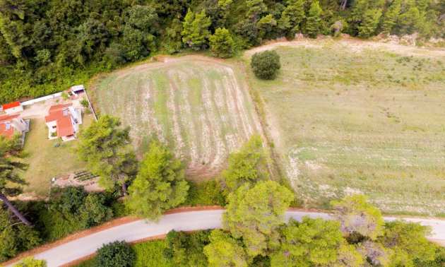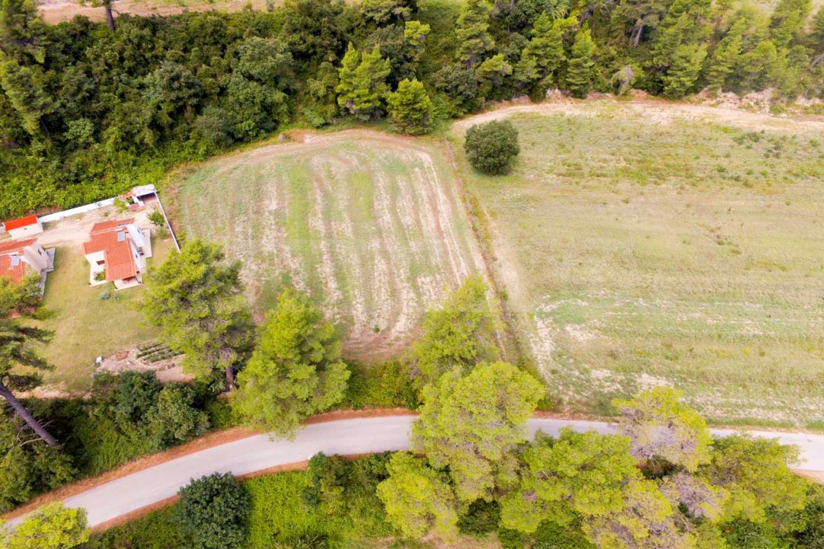 Slanted field, 3557 m,in Kassandra,Halkidiki with unobstructed permanent view.The fenced property is 1 km. away from the center of the village and faces the main road.The corner field is complete,buildable and is perfect for the construction of a villa or detached houses.