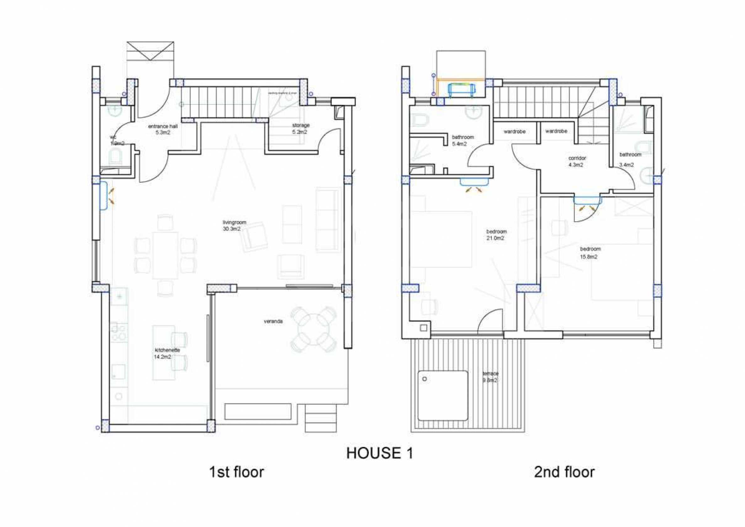 - 1st floor: entrance hall, spacious living room with kitchen and dining area, closet, WC, veranda and yard overlooking the pool, staircase to the 2nd level;