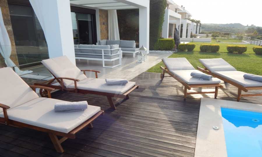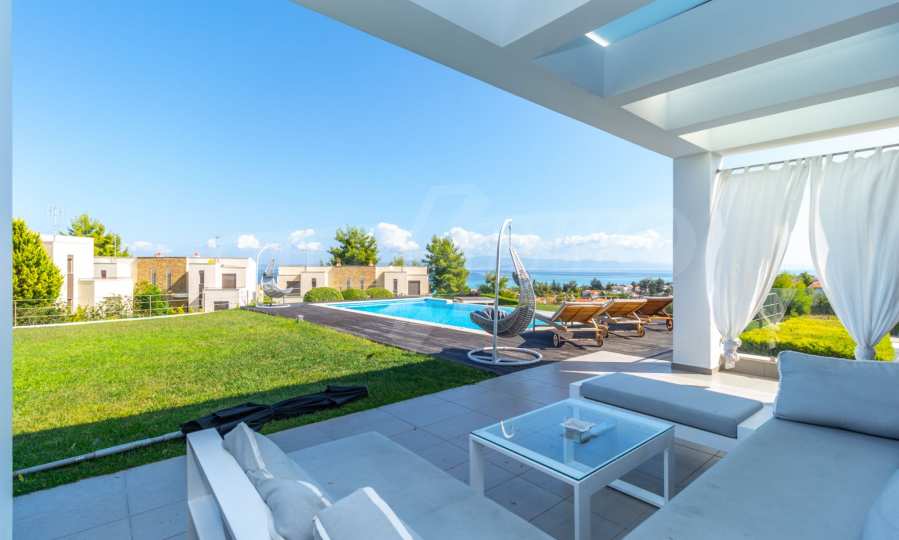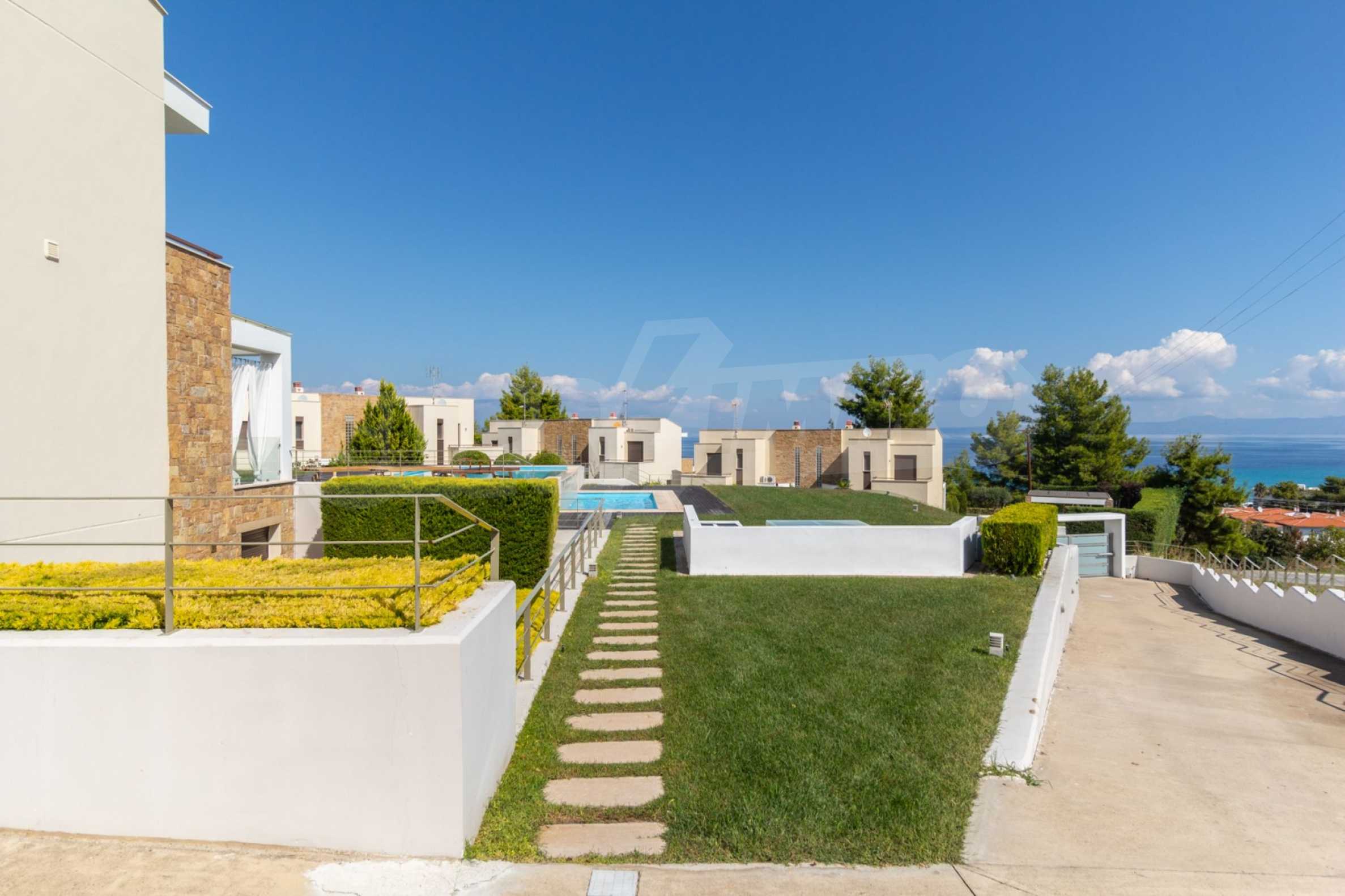 Independent villa,200 m,in Kassandra,Halkidiki with an eastern orientation and with unobstructed permanent view.The property is in a complex of 5 more villas,400 m. away from the beach and 900 m. away from the center of the village.The villa is split in two levels,consisted of two living rooms connected with the kitchens,four bedrooms,three bathrooms and three storage rooms.The property,also,has aluminum joinery,security door,outdoor private pool,water tanks,kiosk and alarm system pre-installation.The villa is fully equipped and furnished.