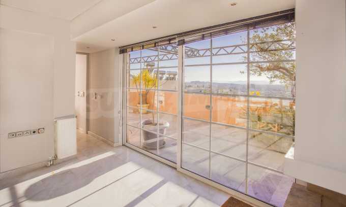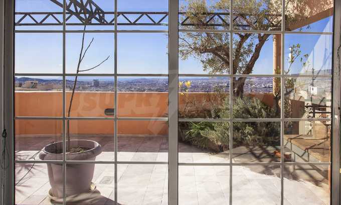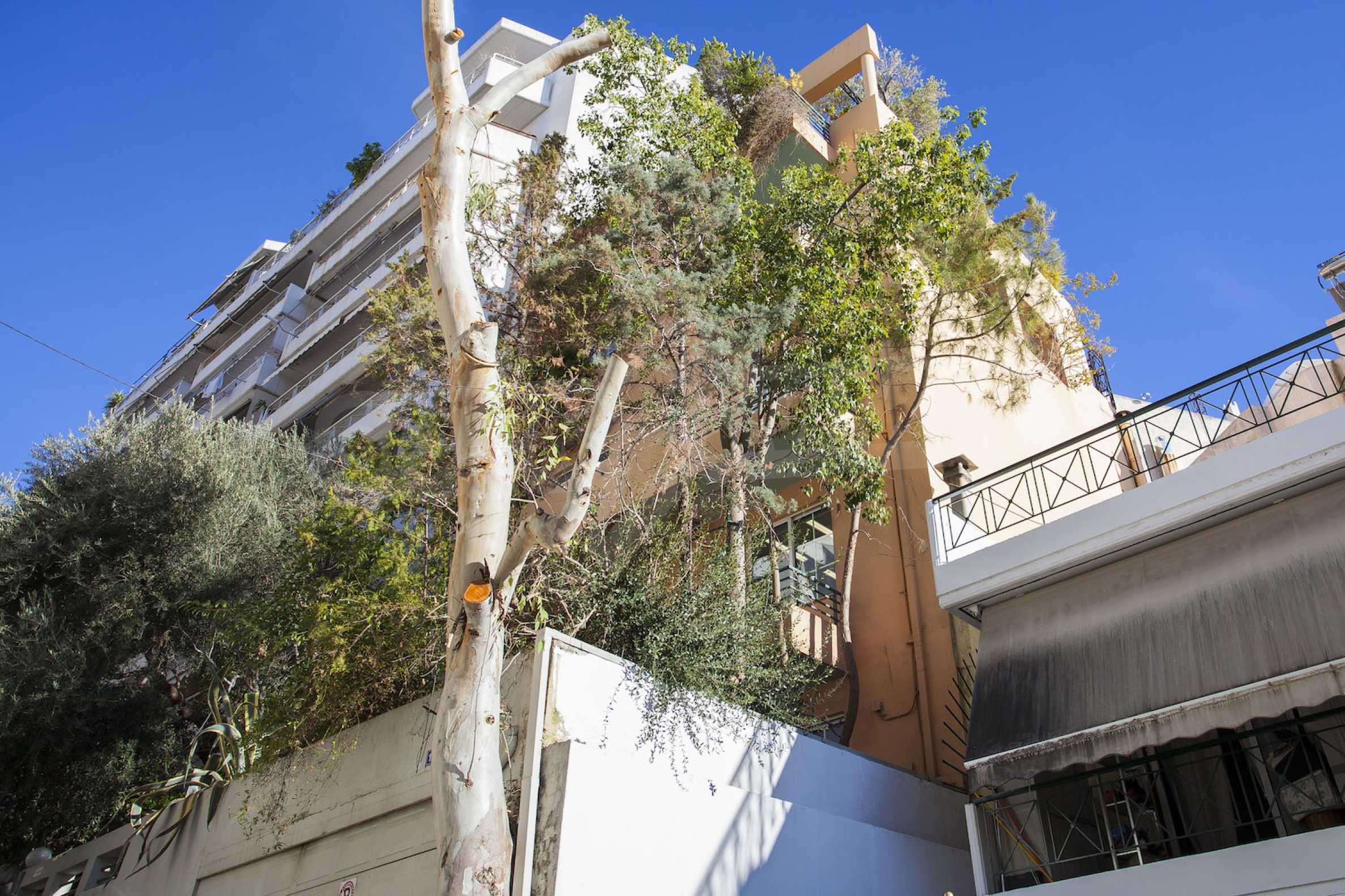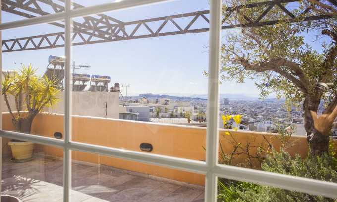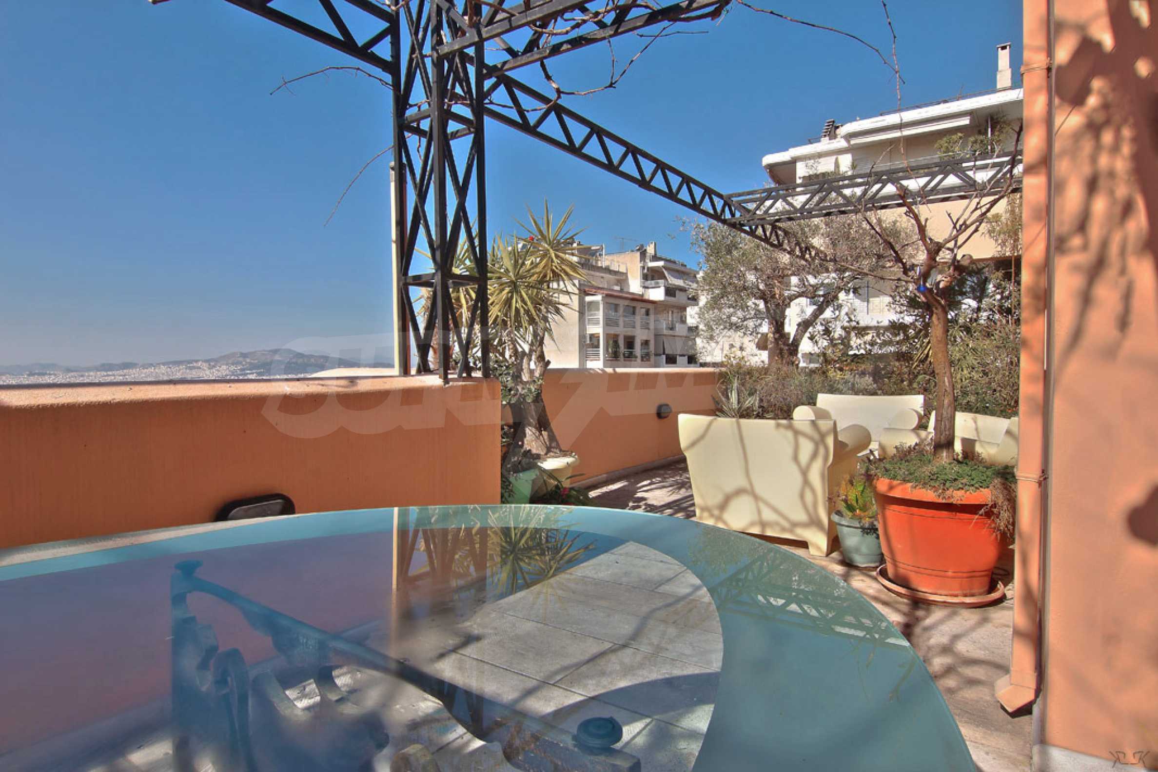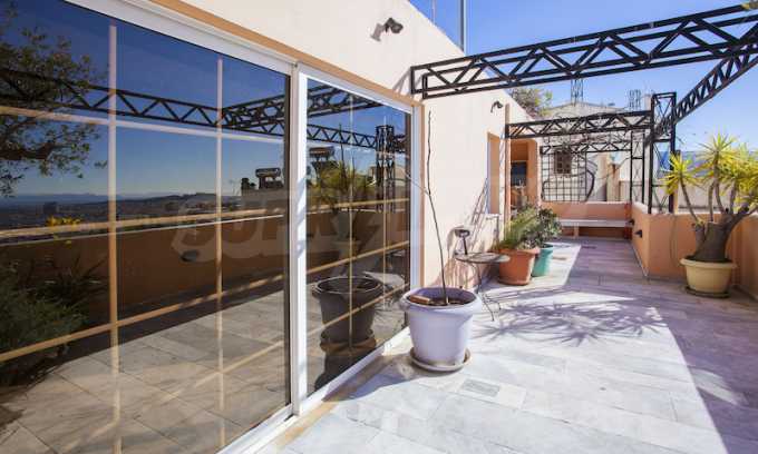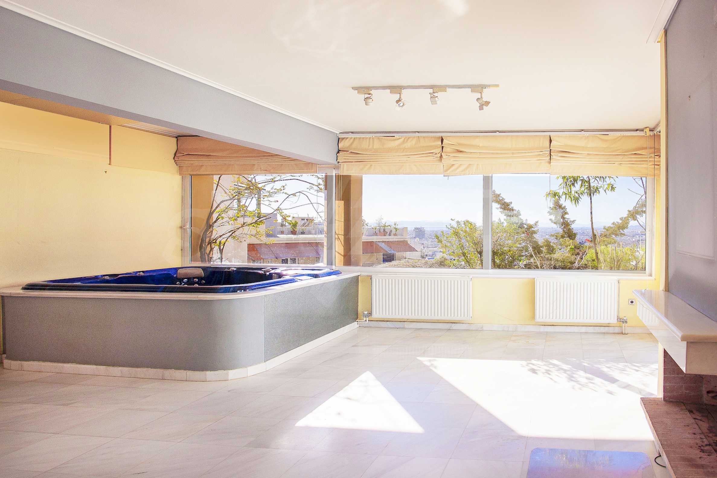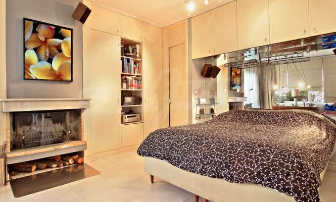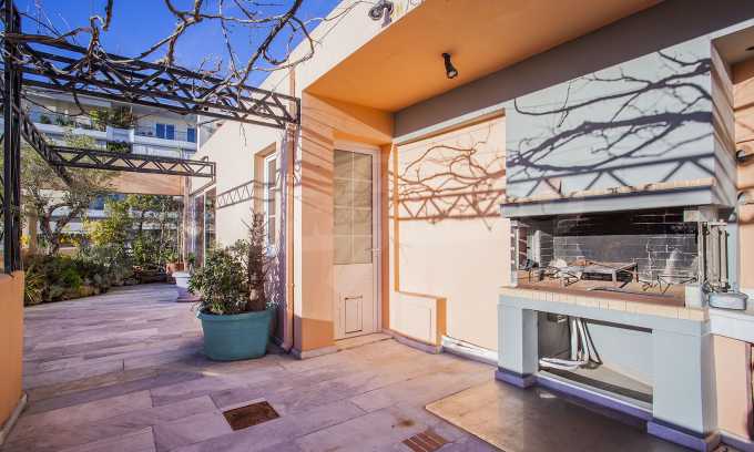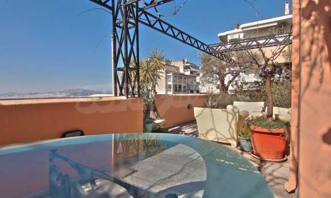 The fourth floor has an area of 22 sq.m and consists of an open-plan living room with large windows and a fireplace. The main house has a veranda with a built-in barbecue and a rock garden with trees and herbs. It overlooks the Acropolis, the sea and Piraeus. The building also has: