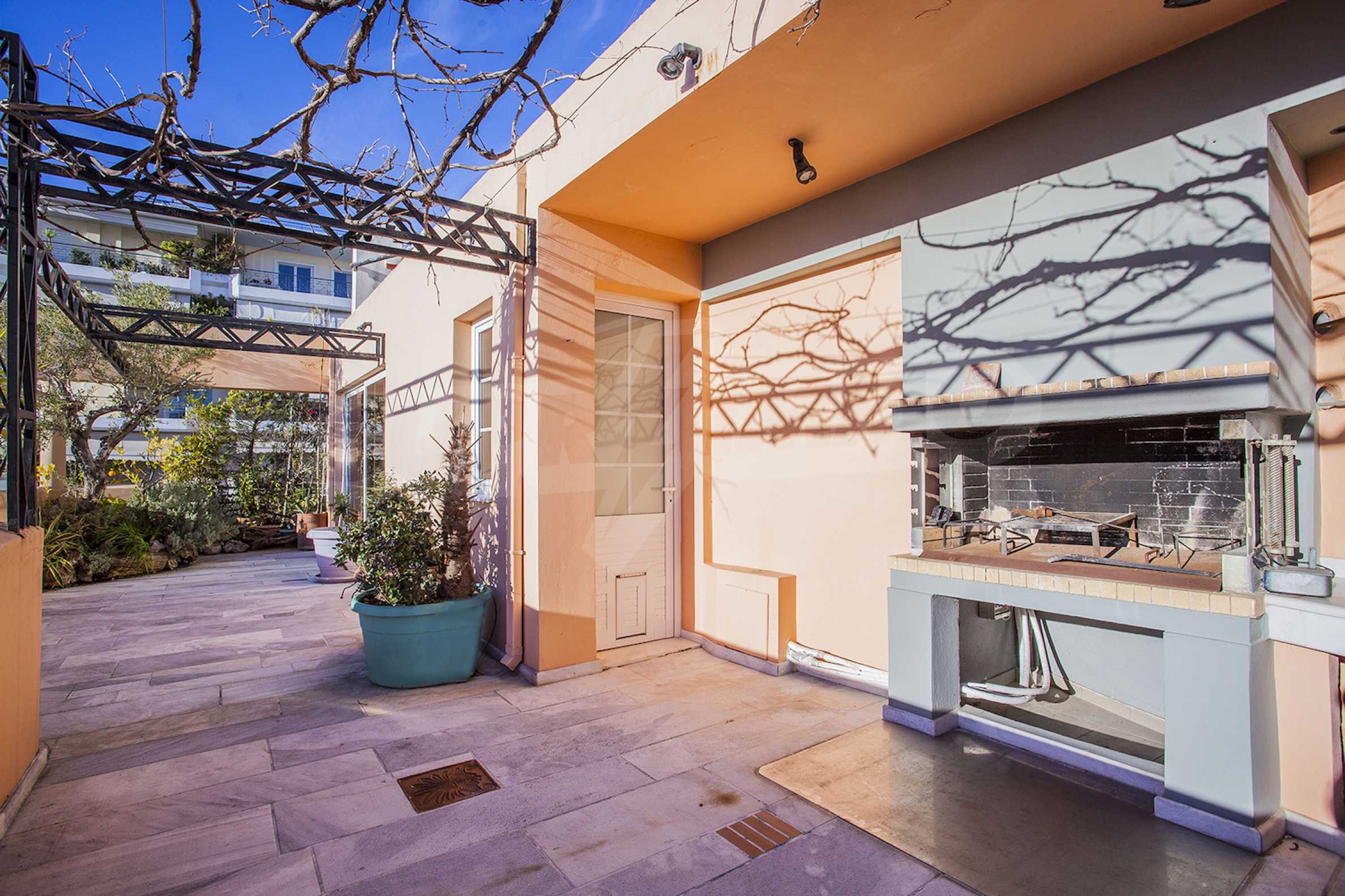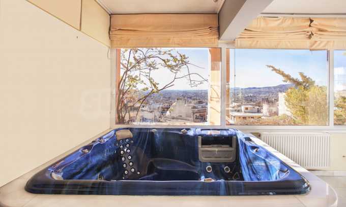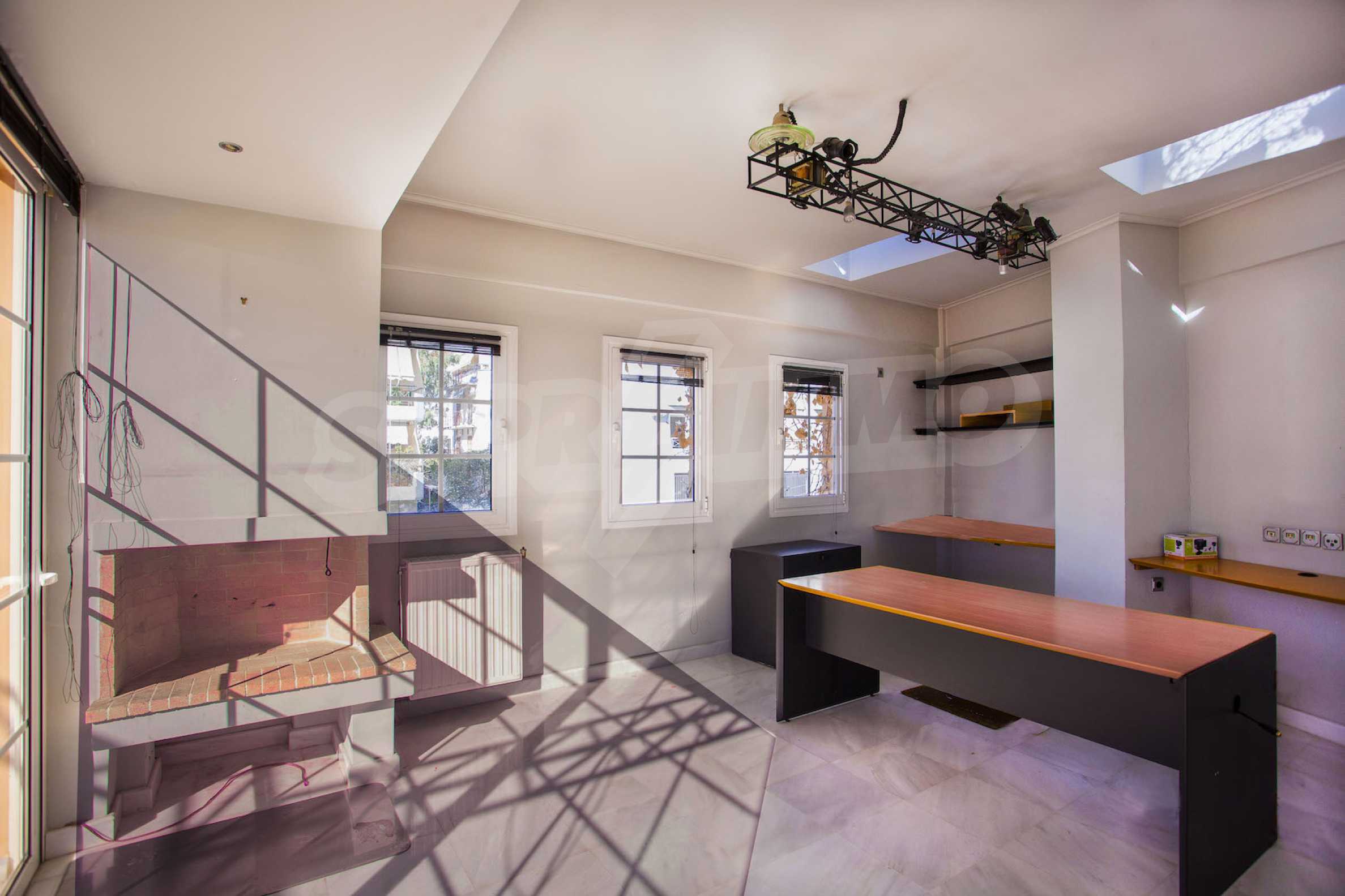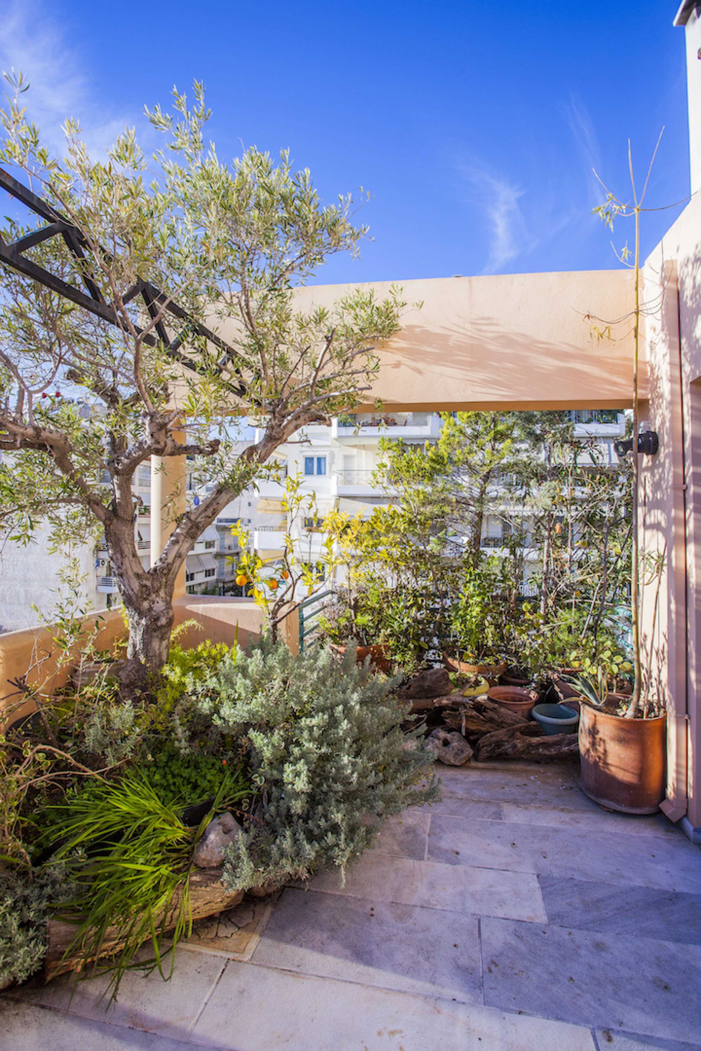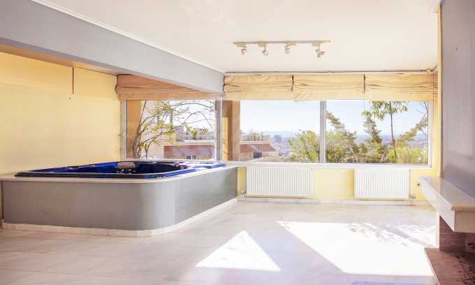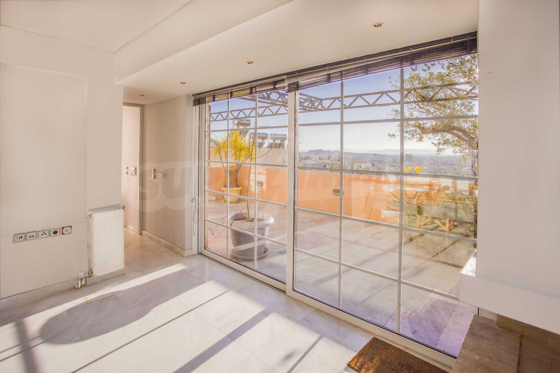 The fourth floor has an area of 22 sq.m and consists of an open-plan living room with large windows and a fireplace. The main house has a veranda with a built-in barbecue and a rock garden with trees and herbs. It overlooks the Acropolis, the sea and Piraeus. The building also has: