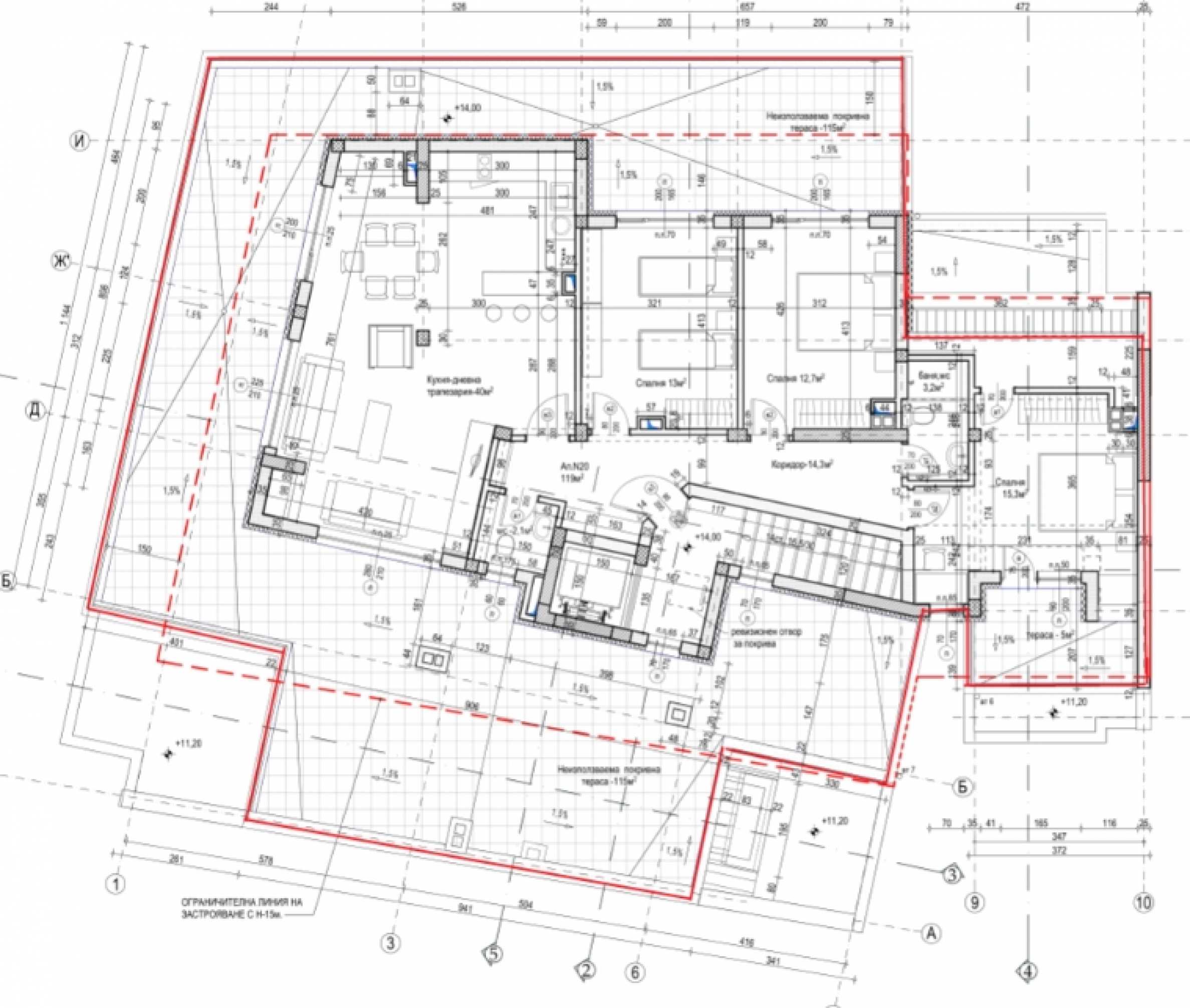 - Layout: a corridor, 3 bedrooms, one with terrace, bathroom/WC, separate WC, kitchen-living room with dining area with large terrace - 125.7 m2.