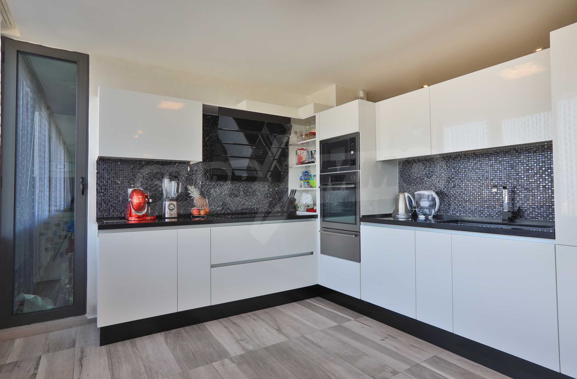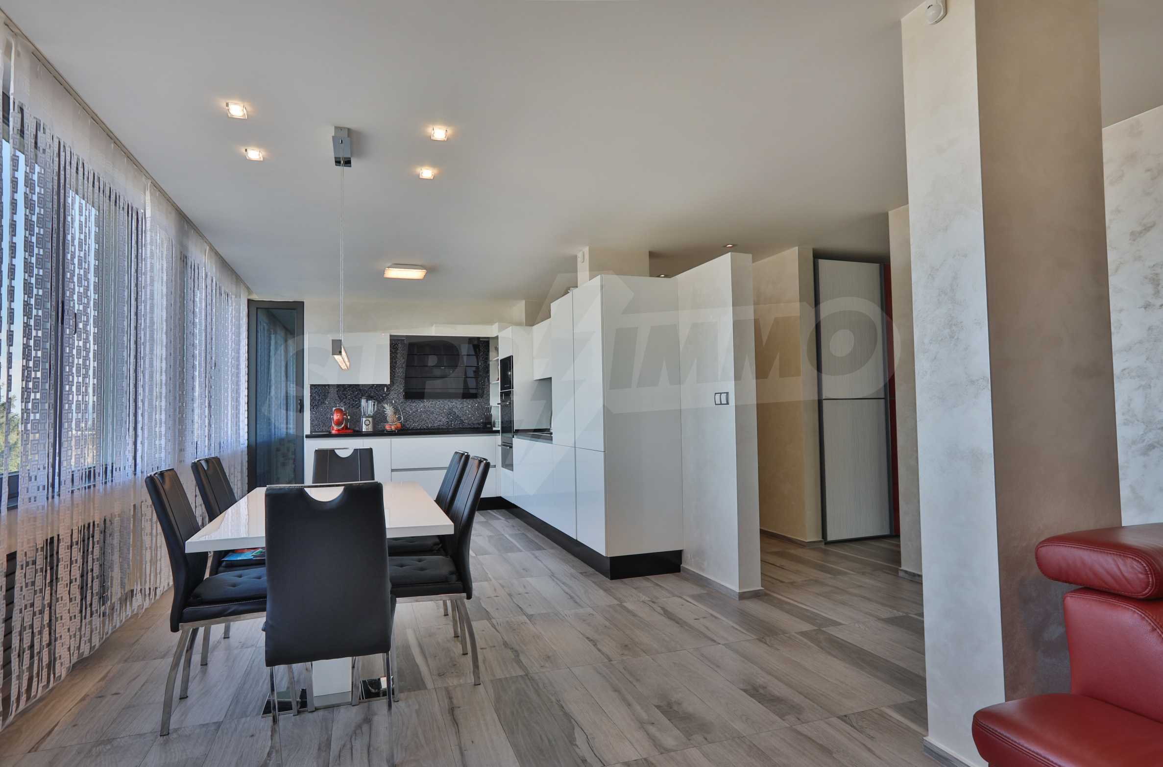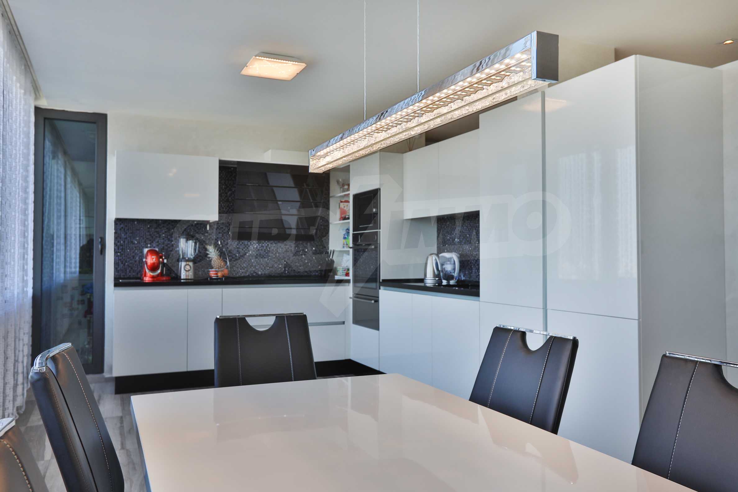 Sunny, designer multi-bedroom apartment with panoramic views of the city and the mountain. The apartment is fully furnished with high quality furniture and finishing materials. It consists of an entrance hall, three bedrooms, two bathrooms, a living room with a kitchenette and a dining area, a large terrace and a wet room. The bedrooms are south facing out onto the terrace. The bathrooms come with granite tiles, showers and bathrooms by Villeroy & Bosh. The living room has great views of the city, granite tiles, genuine leather, JVC-55 'TV, built-in section, dining table with 6 chairs, fitted kitchen "BOGE style" with MDF cabinets and countertop. White goods is the highest grade AEG. The heating is gas, but there is also a powerful air conditioner DAIKIN - 72. The walls are plastered with Zephyr. There is a security system, armored front door SOLID, interior MDF doors, aluminum windows and ice lighting. The building has luxurious common areas and landscaped yard with small entrance fees. An additional two underground parking spaces of ˆ 12,500 can be purchased.