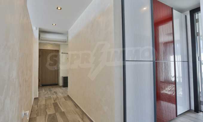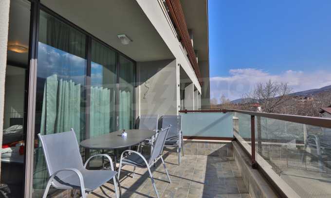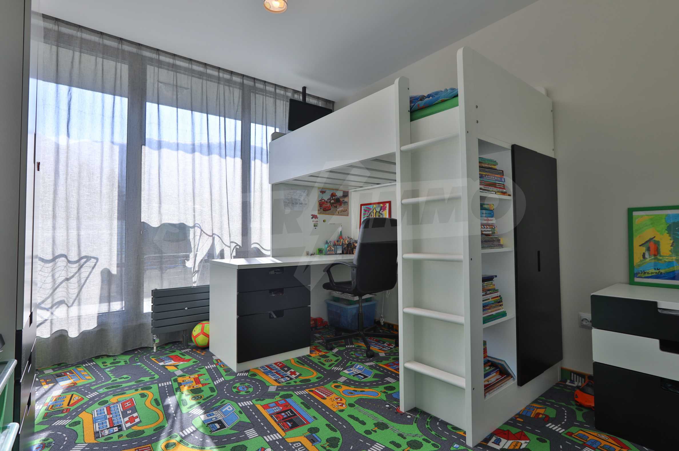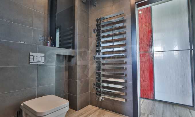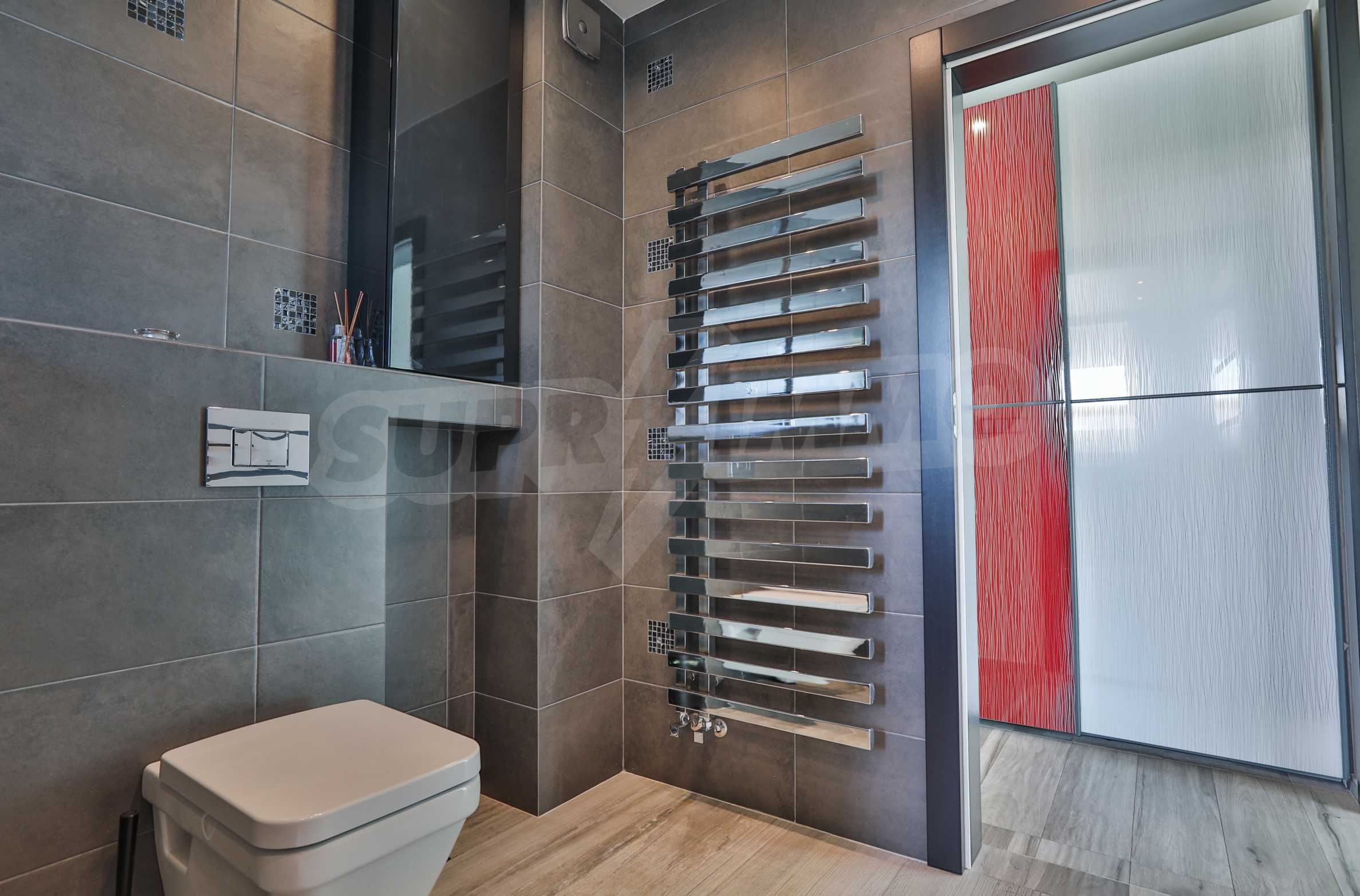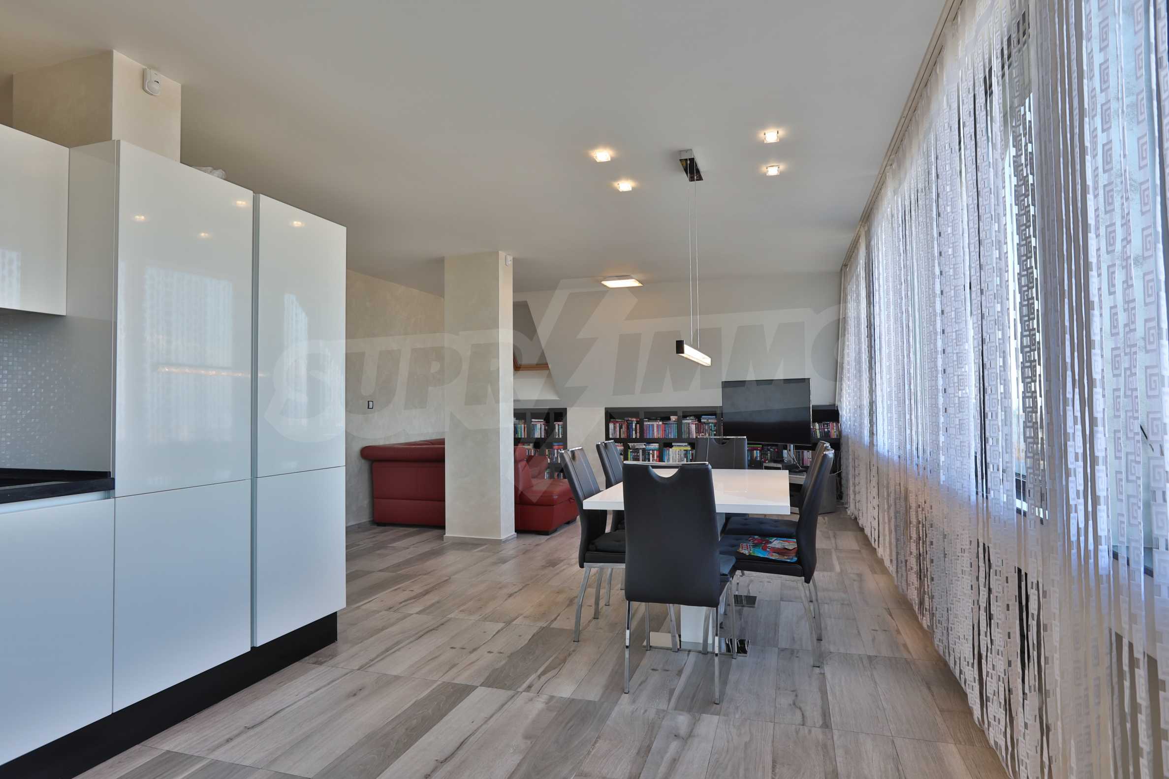 Sunny, designer multi-bedroom apartment with panoramic views of the city and the mountain. The apartment is fully furnished with high quality furniture and finishing materials. It consists of an entrance hall, three bedrooms, two bathrooms, a living room with a kitchenette and a dining area, a large terrace and a wet room. The bedrooms are south facing out onto the terrace. The bathrooms come with granite tiles, showers and bathrooms by Villeroy & Bosh. The living room has great views of the city, granite tiles, genuine leather, JVC-55 'TV, built-in section, dining table with 6 chairs, fitted kitchen "BOGE style" with MDF cabinets and countertop. White goods is the highest grade AEG. The heating is gas, but there is also a powerful air conditioner DAIKIN - 72. The walls are plastered with Zephyr. There is a security system, armored front door SOLID, interior MDF doors, aluminum windows and ice lighting. The building has luxurious common areas and landscaped yard with small entrance fees. An additional two underground parking spaces of ˆ 12,500 can be purchased.