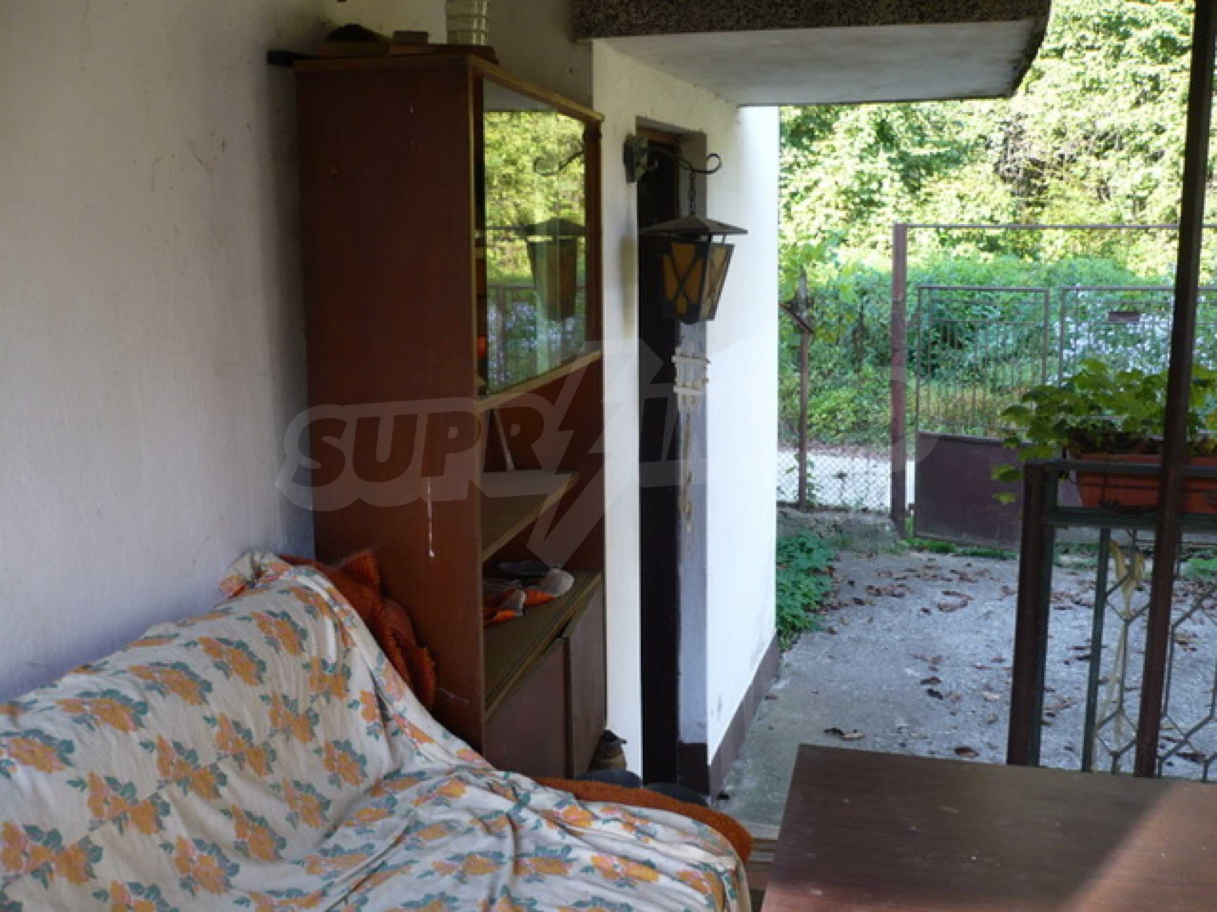 The villa was built in the early 1980s. Reinforced concrete structure, brick, two floors. Each floor is 45 m2. The entrance to the first floor is through a corridor that leads straight into a large living room - dining room, with a kitchenette separated by a wooden countertop. There is running water, a sink, is fitted for a solid fuel stove. To the left of the front door there is a smaller room that can be used for a bedroom. There are bathrooms and toilets on both floors. The corridor of the first villa is marble-type "Venetian mosaic". There is an internal staircase between the floors with reinforced concrete construction.