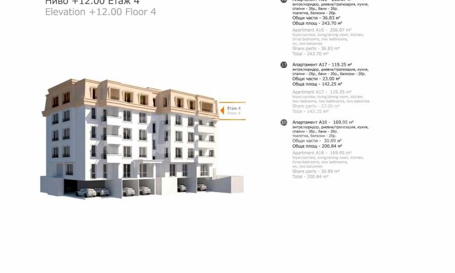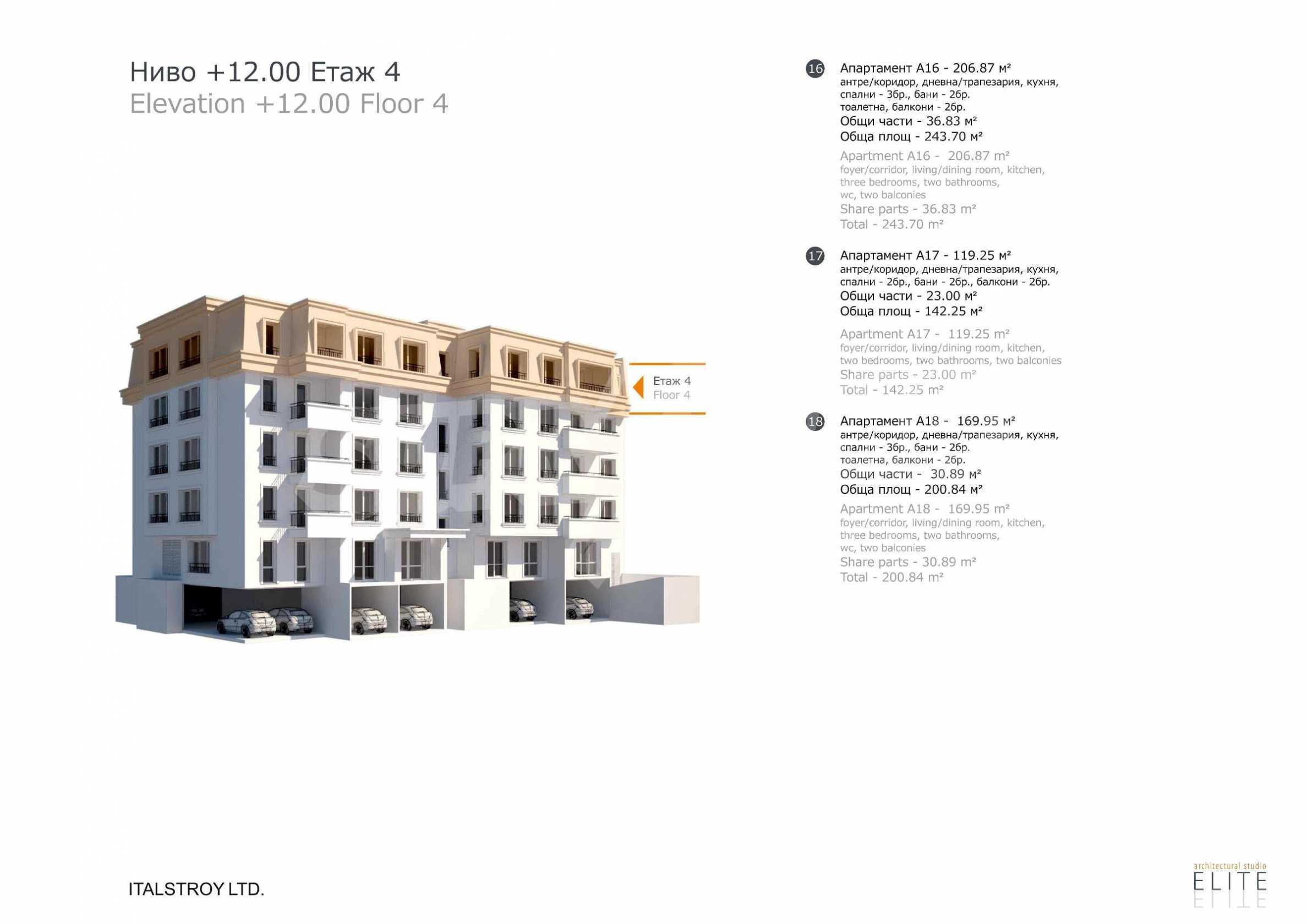 • на разположение са малък брой апартаменти, което ще формира спокойна жилищна атмосфера. Състои се от сутерен, партер и четири жилищни етажа с избор от само 18 апартамента, сред които тристайни и два четиристайни на последния етаж, както и два офиса на партера.