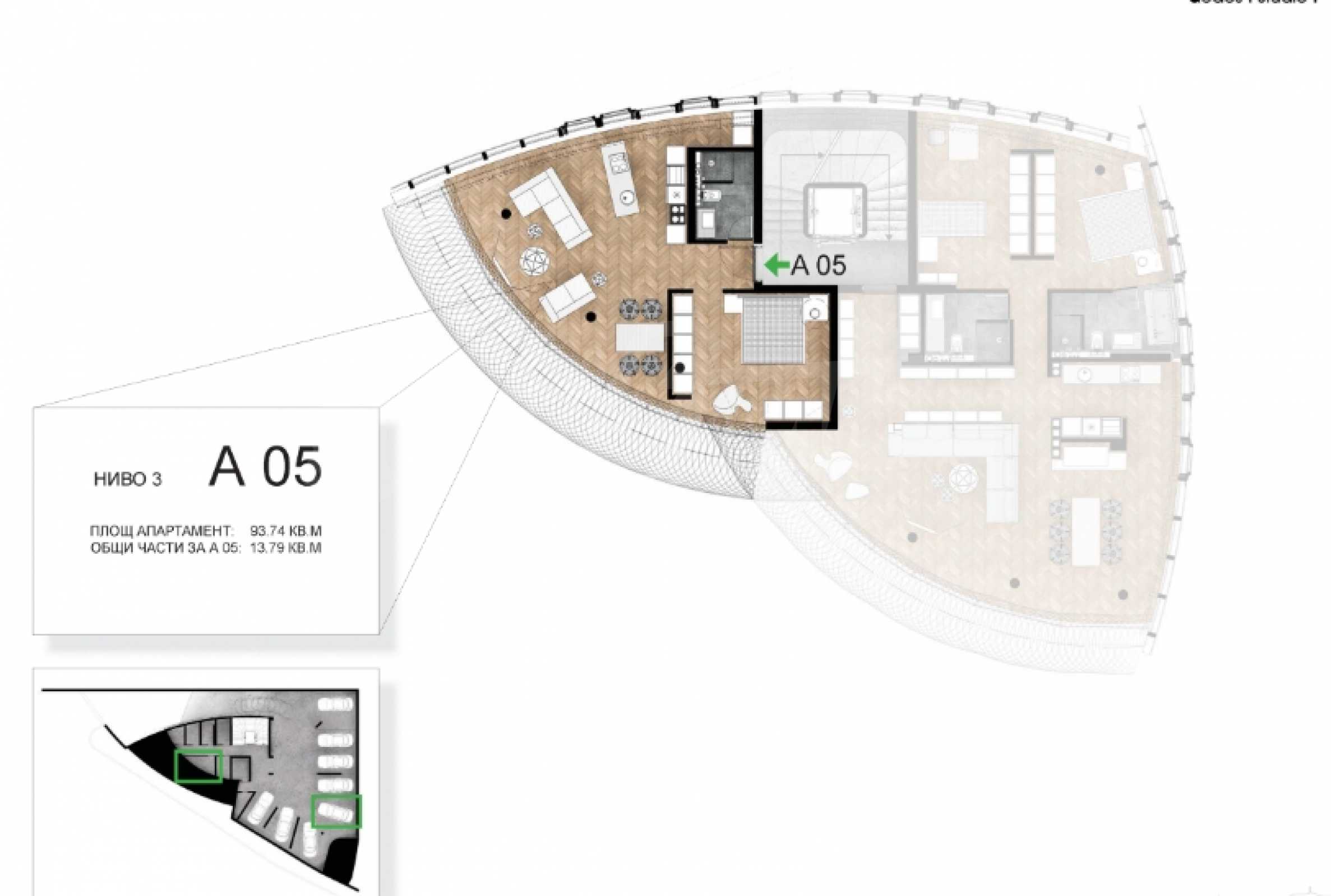 The apartment is located on the third floor in a building with one entrance and 5 floors - ground floor, 3 residential floors and one underground floor where the parking lot is located. Only 8 apartments, 2 apartments per floor are planned, which will ensure maximum peace and privacy of future owners. The apartments have high ceilings (more than 2.80 m) and functional layout, allowing the pooling of apartments and maximum use of space.