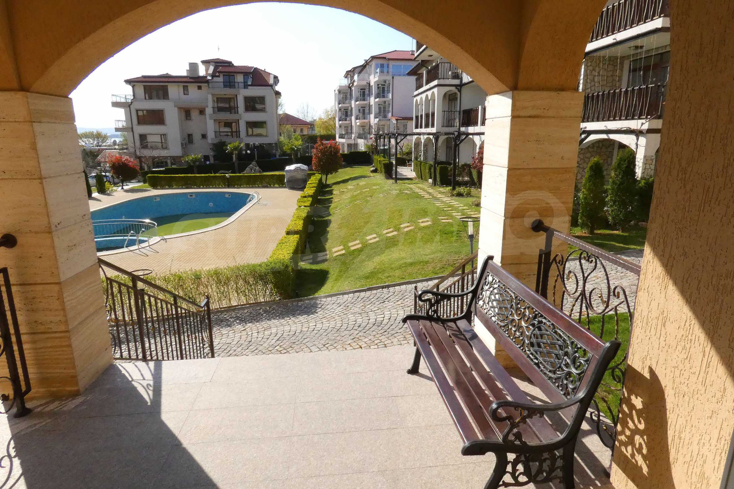 The apartment is located on the first floor and has a total area of 76.97 m2 with practical layout: entrance hall, bathroom / wc and separate toilet, 2 bedrooms, living room and 2 terraces with nice view to the internal landscaped yard, the pool and partially to the sea.