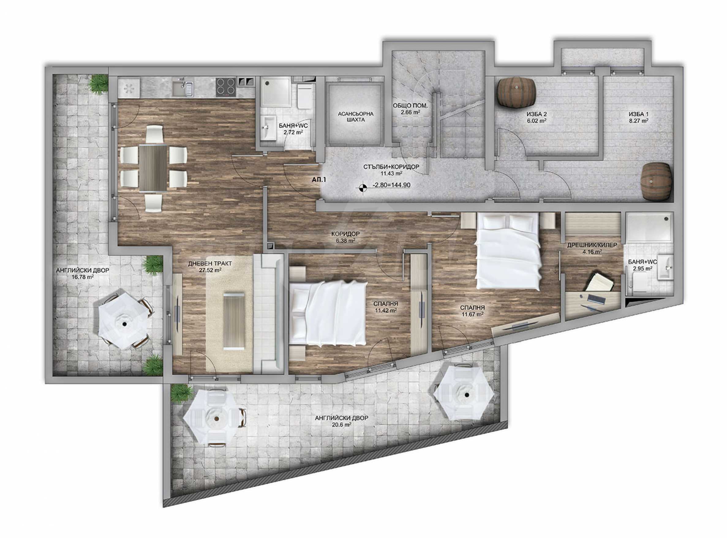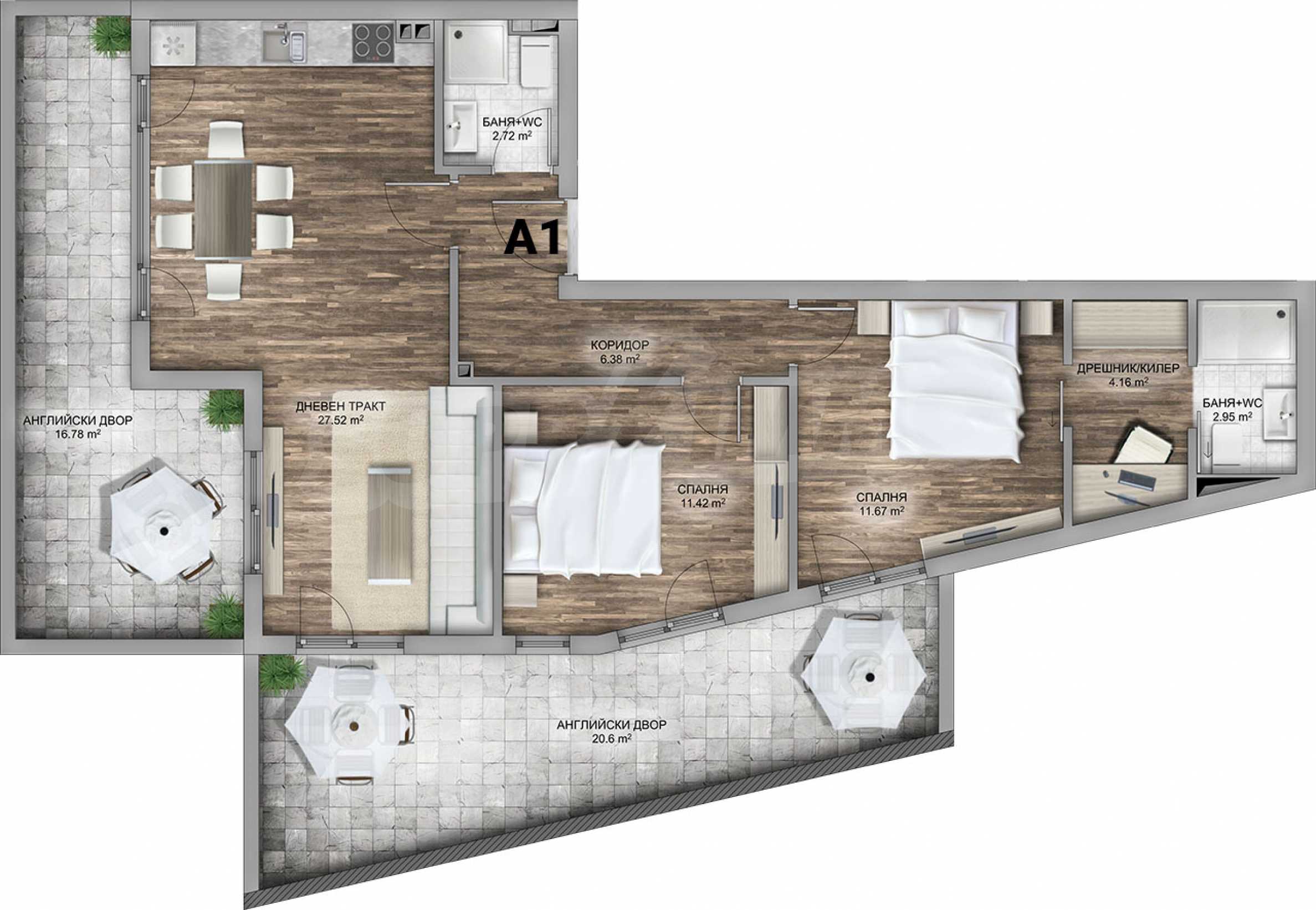 The apartment we offer occupies the entire ground floor of the building. On a net area of 79 m2. are located: spacious living room, two bedrooms, two bathrooms, closet, hallway. All rooms have access to the English yard, which has a total area of 38 m2.