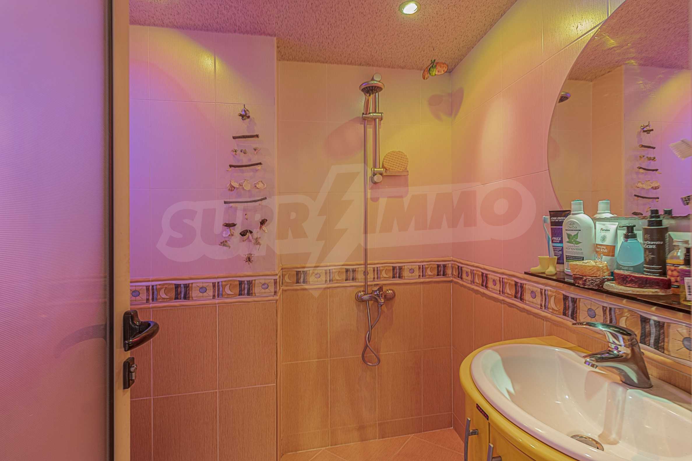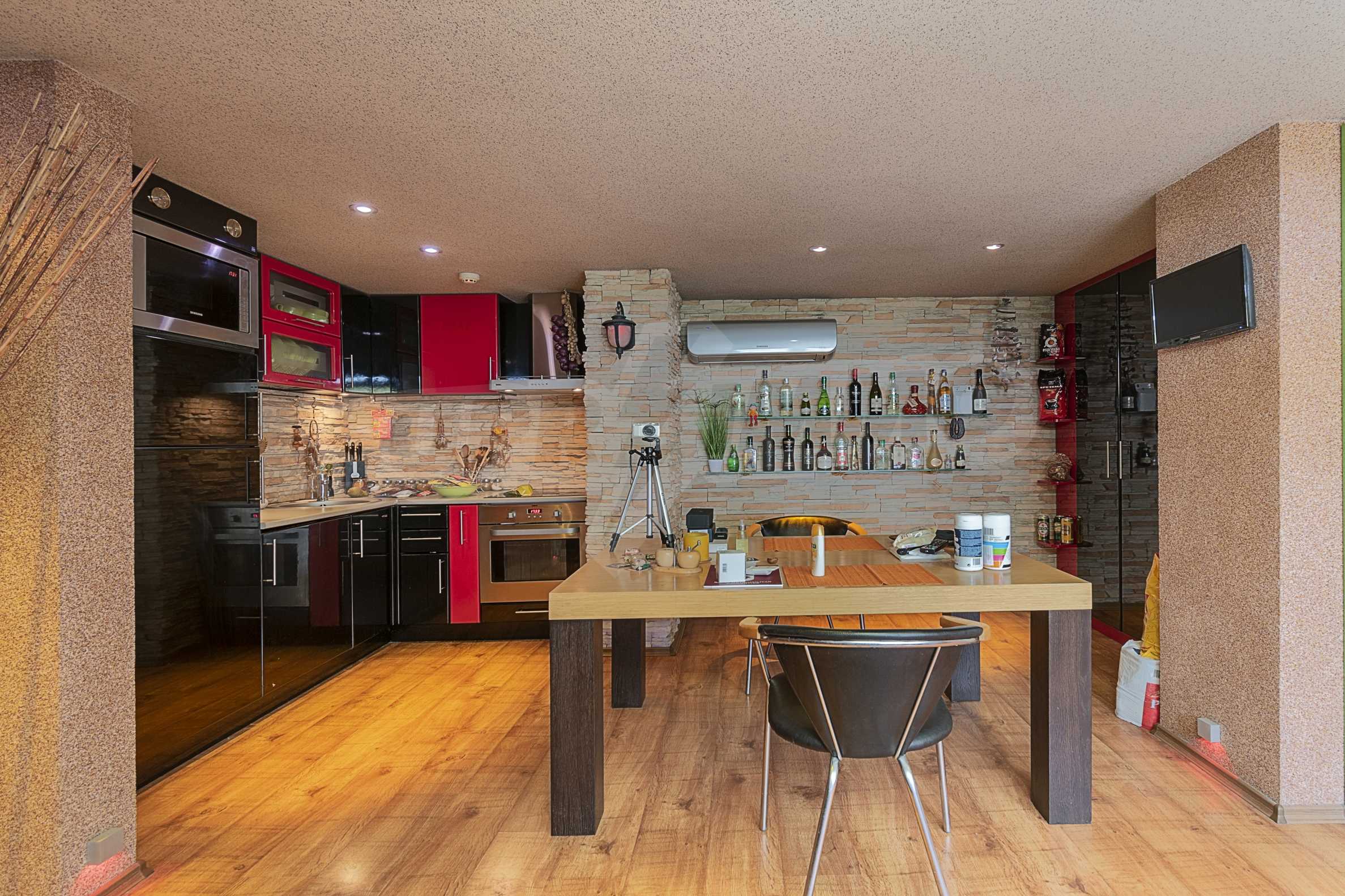 The apartment consists of a bathroom with a toilet, a dining room, a living room, a bedroom and a terrace. All walls and ceilings have mineral plasters. The heating in the dwelling is complete with central heating and air conditioning. The rooms have built-in lighting "Nido", the bathroom has a built-in music system in the walls "Pioneer". The apartment is fully furnished, the built-in furniture is made of polished MDF and the upholstered furniture in the living room is embossed.