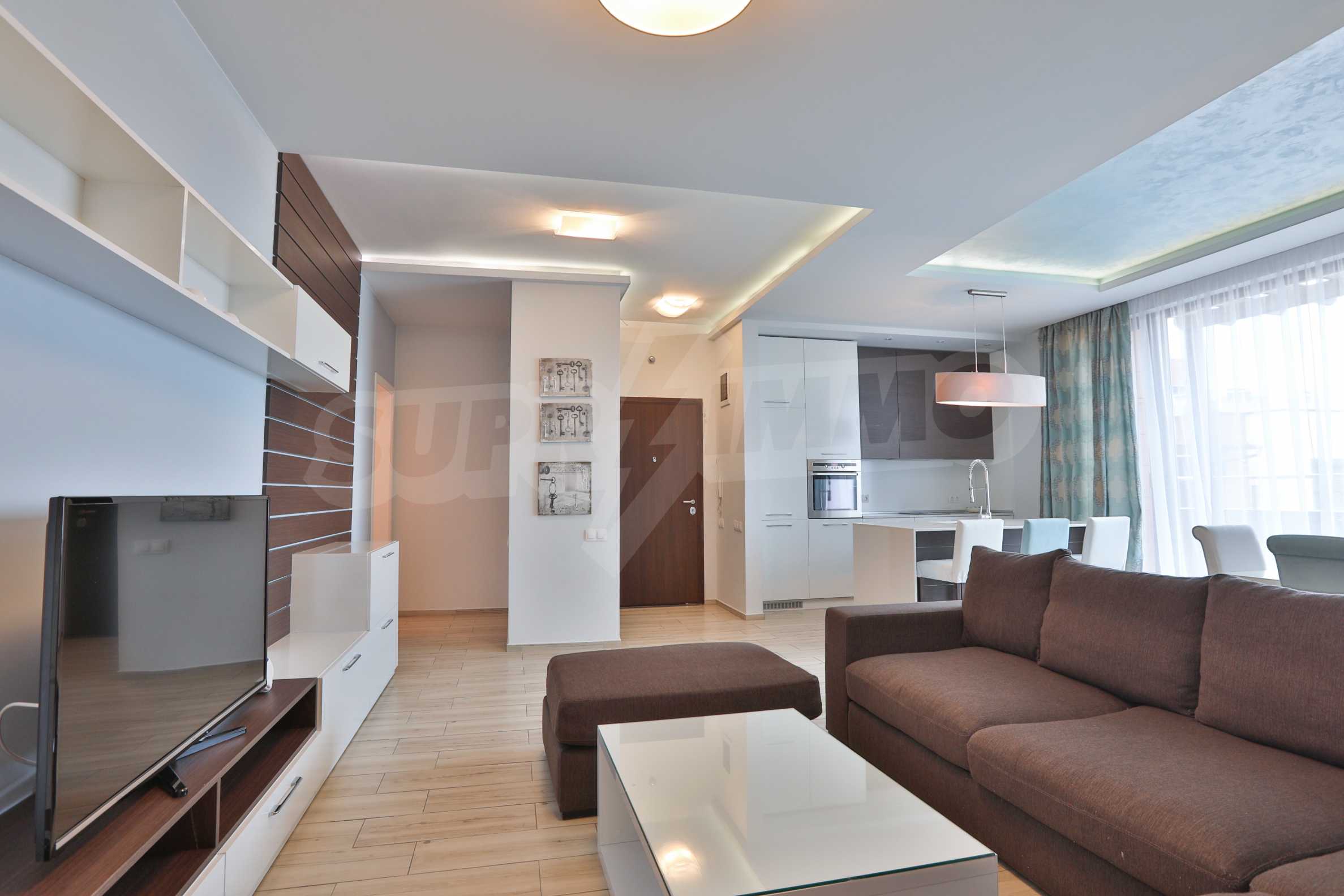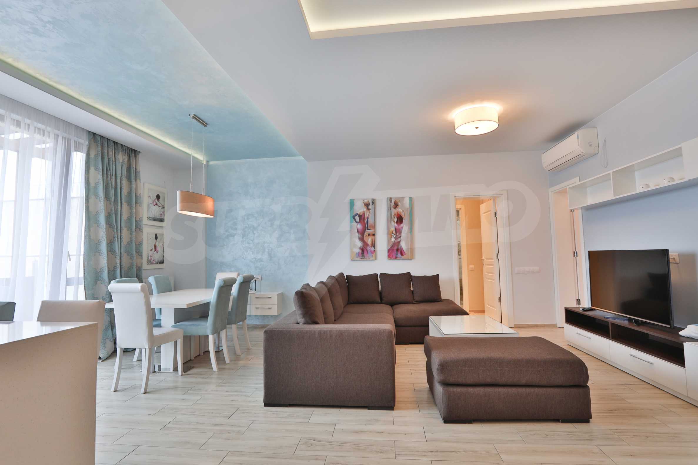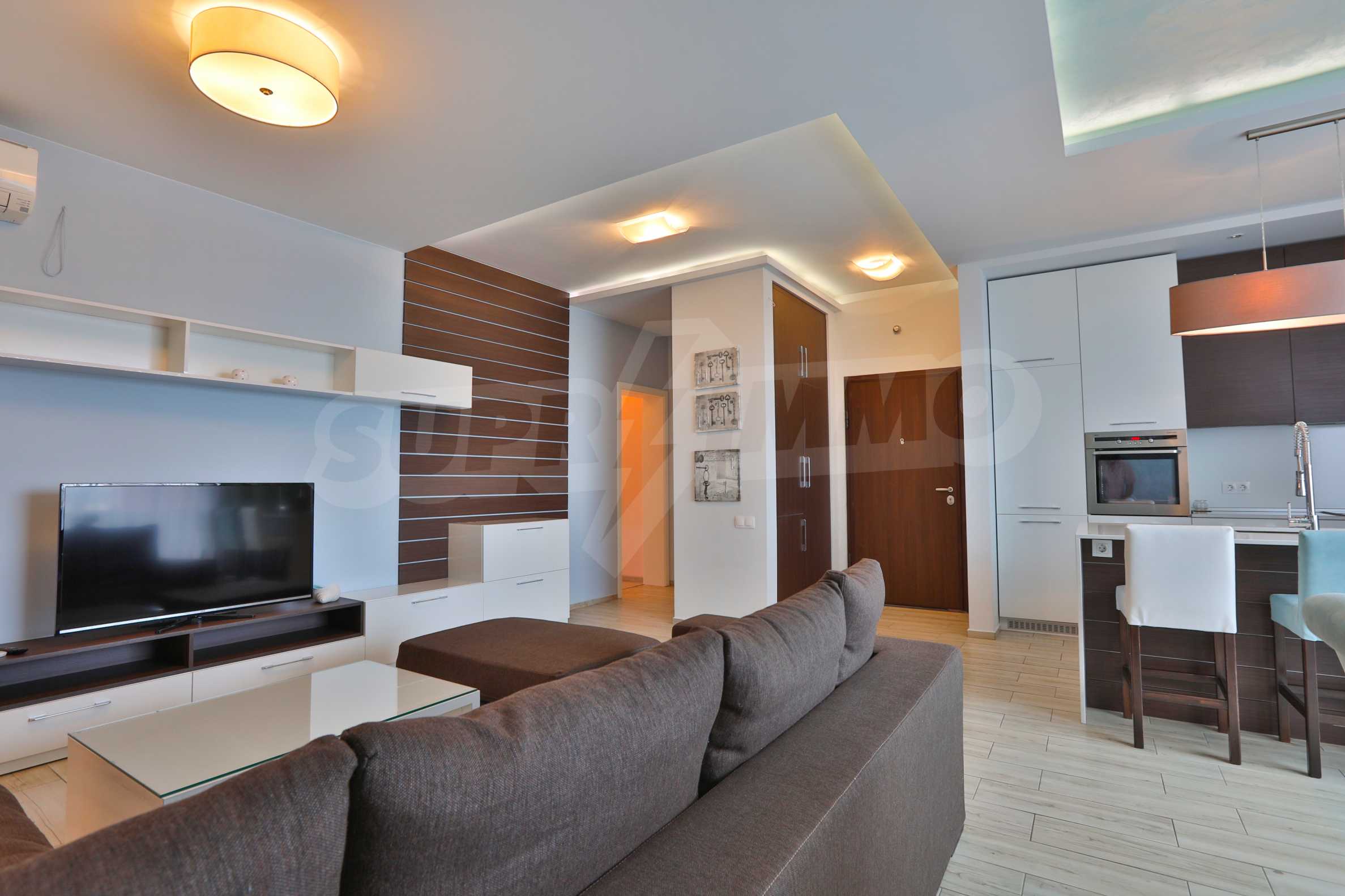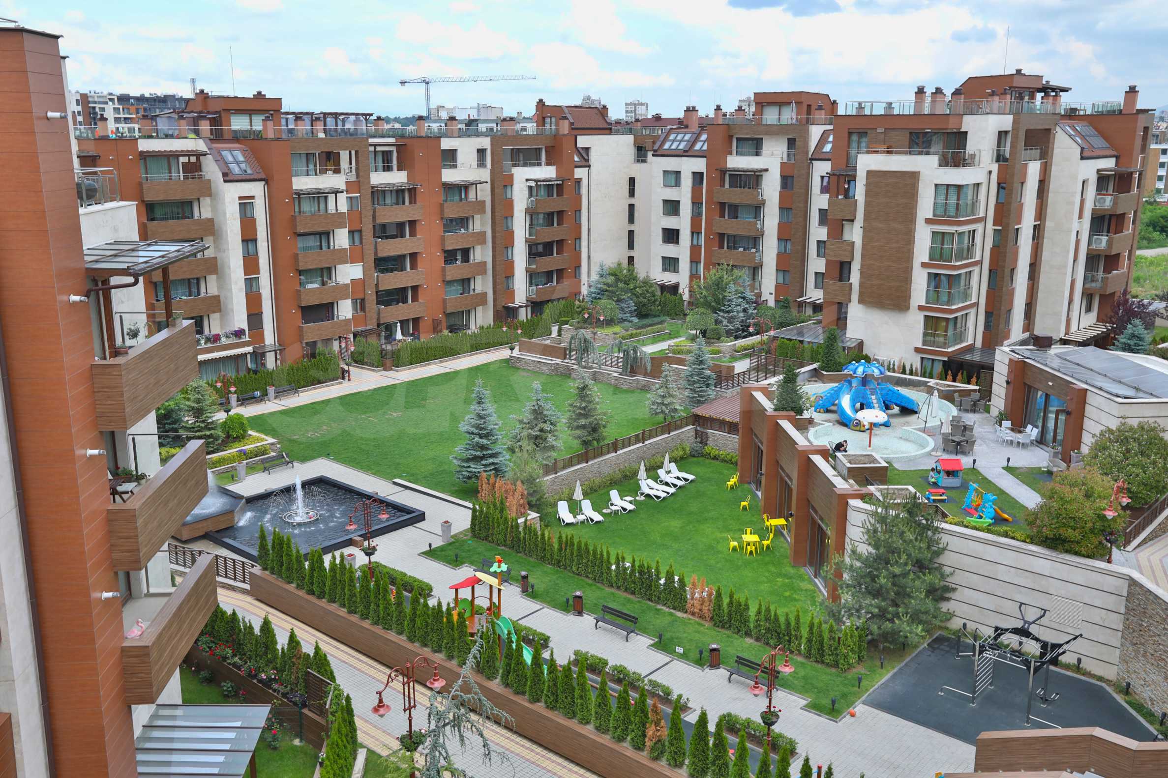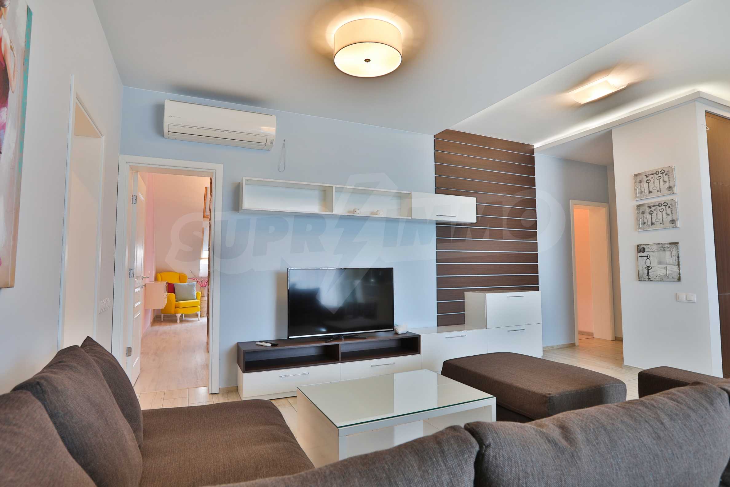The apartment is located on the fifth floor and offers a panoramic view of the complex's park from its terrace. The apartment is stylish, with clean interior lines, with attention to detail. It is fully furnished and modern equipped with all necessary electrical appliances.