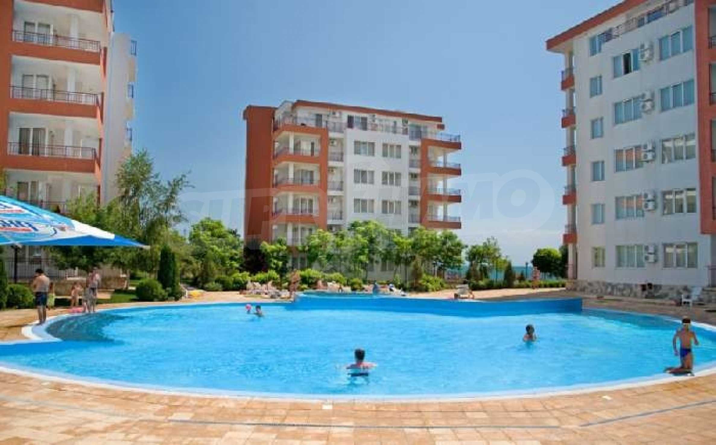 Riviera Fort Beach is a lovely complex, part of the Fort Noks developments, located on the edge of the town of Ravda. The complex is situated on the beach away from the noise of the town centre yet close to all amenities and only a short drive from the large resort of Sunny Beach.This apartment is front line to the sea and coast and has panoramic views from the two balconies. On entering there is a hall with the bedrooms to the left and the main living area to the right. The apartment is painted throughout, fully furnished and in very good condition, ready to move into.The living area is open plan with a large window overlooking the coast and a patio doors giving access to a long balcony. This is a spacious room and accommodates a dining table and chairs easily. The kitchen is fully fitted with ample storage cupboards, cooker, fridge freezer, washing machine, microwave and everything needed for self catering. The master bedroom has a patio doors leading to a private balcony with sea views. It also has an en suite shower room and plenty of wardrobes storage. The second bedroom is twin bedded with a large window. This fabulous apartment for sale in Ravda is air conditioned with units in both bedrooms and living room.Riviera Fort has a great facilities including:Reception & 24 hr securitySwimming pool with children's sectionSpacious pool terraceLandscaped gardensPlaygroundRestaurant & barPrivate beach in front of the complexRiviera Fort is in a quiet area, perfect for families and those wishing to get away from the hustle and bustle of everyday life. There is still plenty to do as the activities in the area include cycling, tennis, volleyball, diving, fishing, horse riding, paragliding, wind surfing and sailing. The perfect place to buy an apartment overseas with excellent rental potential!!